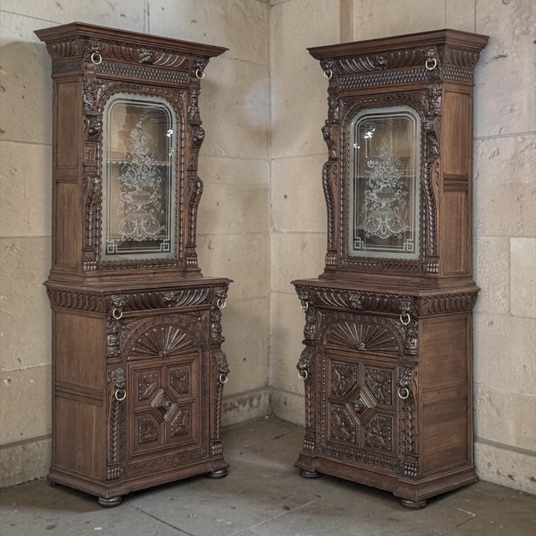 SaleA striking pair of 19th century Flemish bookcases, masterfully crafted in richly patinated oak and designed with the depth, symmetry, and architectural presence that make such pieces so compelling. Each bookcase is crowned with bold moldings above an upper glazed cabinet door, the etched glass centered with a classical urn overflowing with flowers and framed by delicate ornamental detailing. The glass brings a welcome note of refinement, set against the strength and intricacy of the carved oak surround.