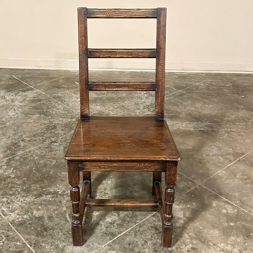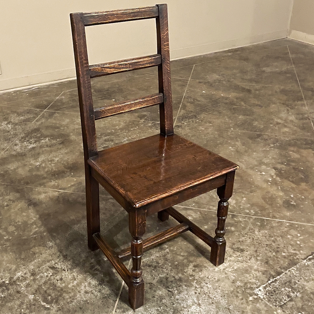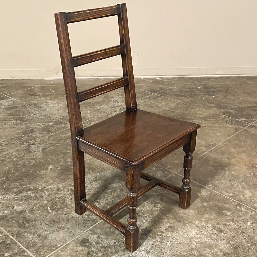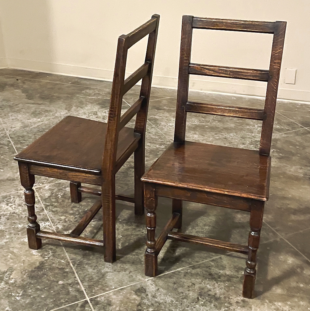 Set of Four Rustic 18th Country French Chairs work great as breakfast room chairs, around a game table, or just for occasional use throughout a casual decor. Hand-made from solid oak, each features solid plank seats which were designed for tie-on cushions coordinated with your interior fabrics and colors. Simple slat back design and sturdy turned legs in front combined with single uprights from the floor to the top of the seatback which are connected with an "H" stretcher below combine to create sturdiness that you'll enjoy for decades to come.