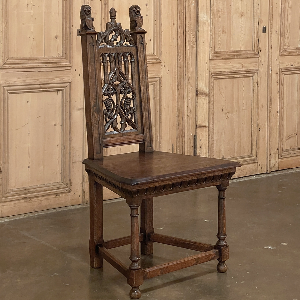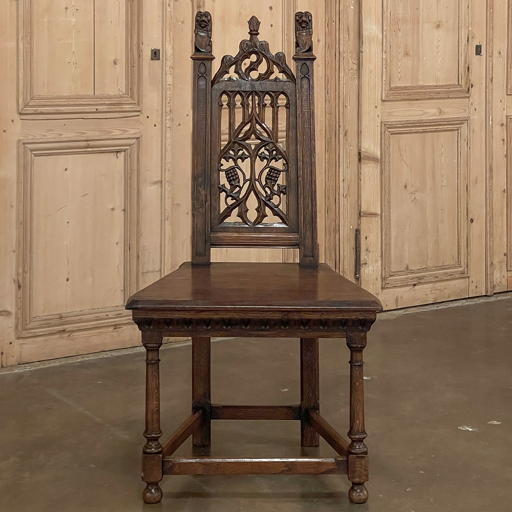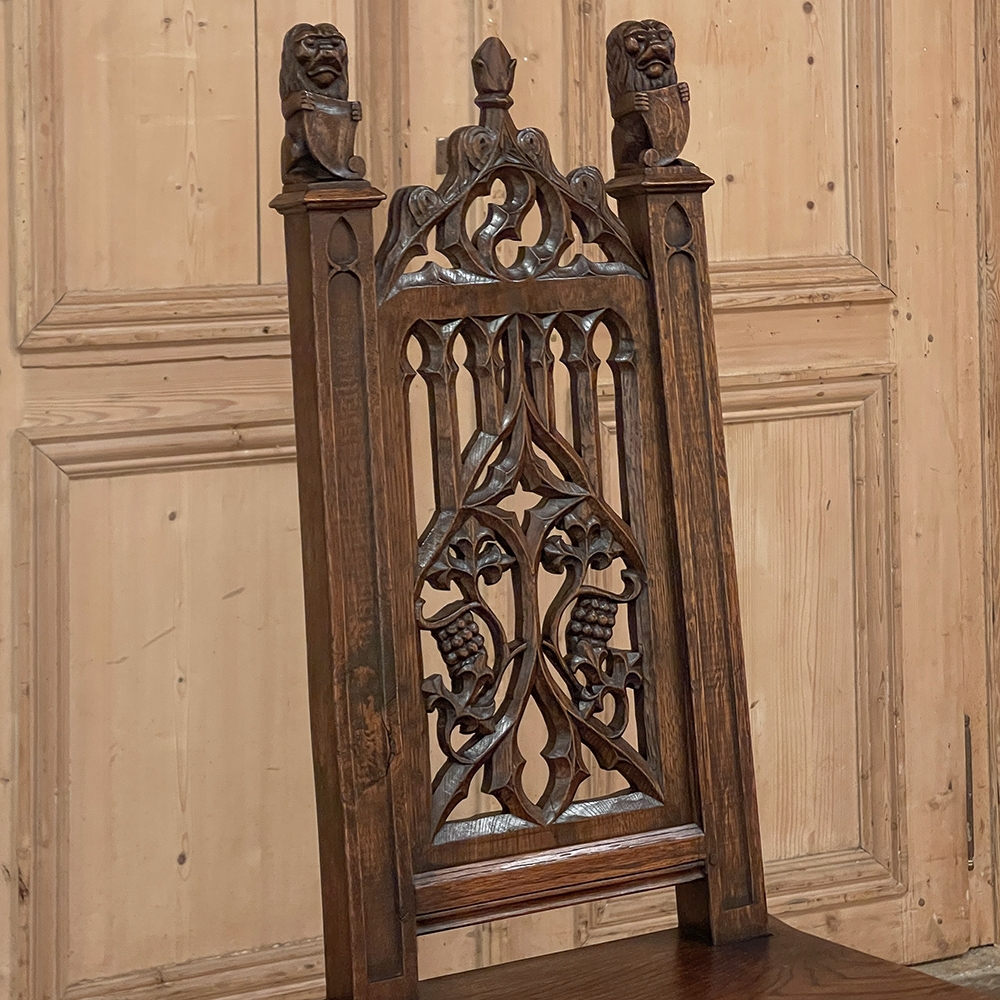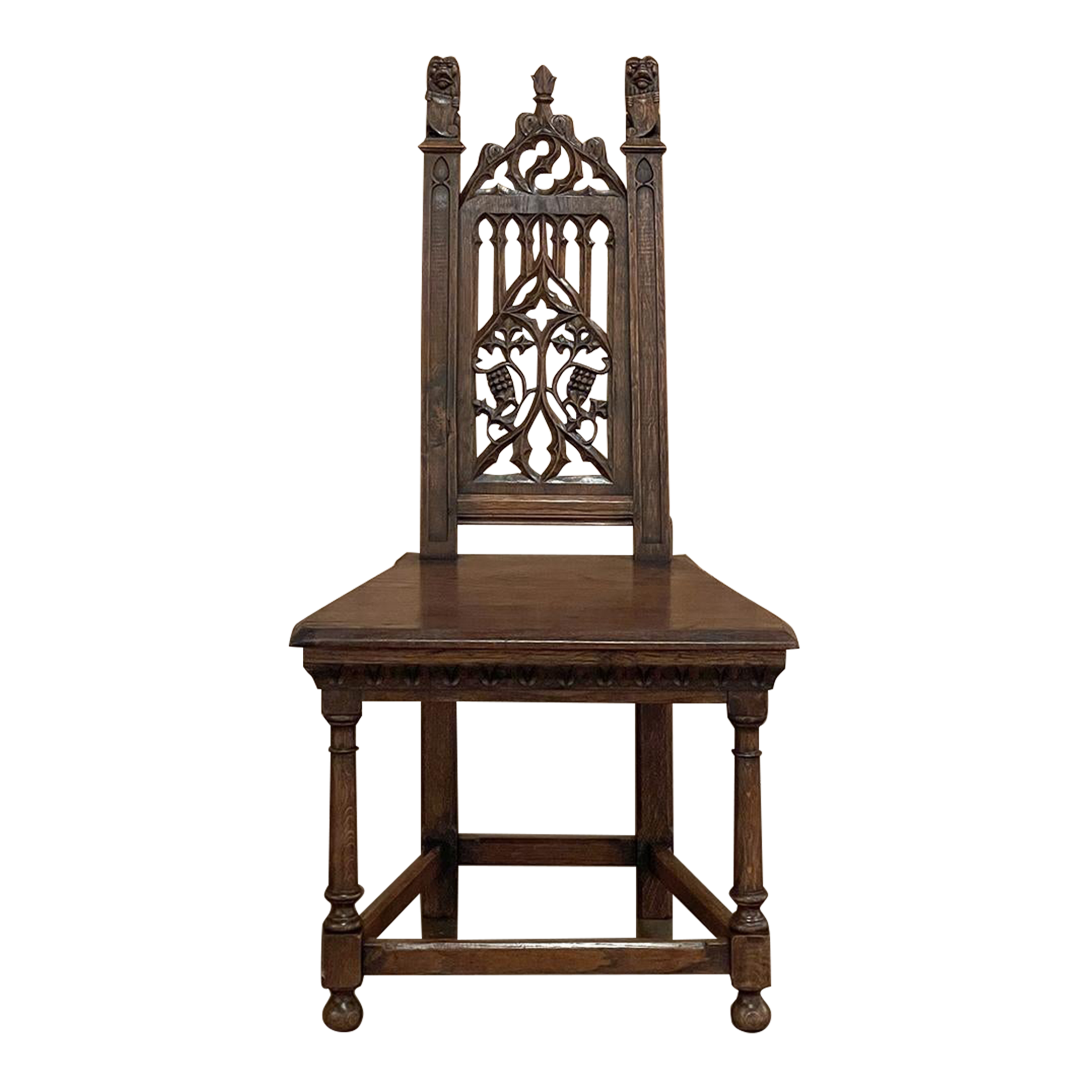 Sale19th Century French Gothic Revival Chair is a wonderful testament to the craftsmen of a bygone era! Hand-sculpted from old growth oak, it features a trapezoidal seat which creates a shape great for anywhere in the room, especially the corner. The seatback uprights are one piece of wood from the carved lions on top to the floor, and bracket the seatback which consists of a stunning pierce-carved study in the Gothic manner including a variety of geometric and symbolic shapes, including stylized fleurs de lys and grape clusters. The seat and support framework below are a study in contrast, with only an egg & dart bordering under the seat planks for adornment, while supplying sturdy support reinforced by stretchers and finished with teardrop feet in front.