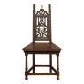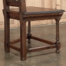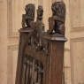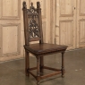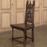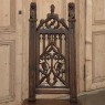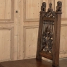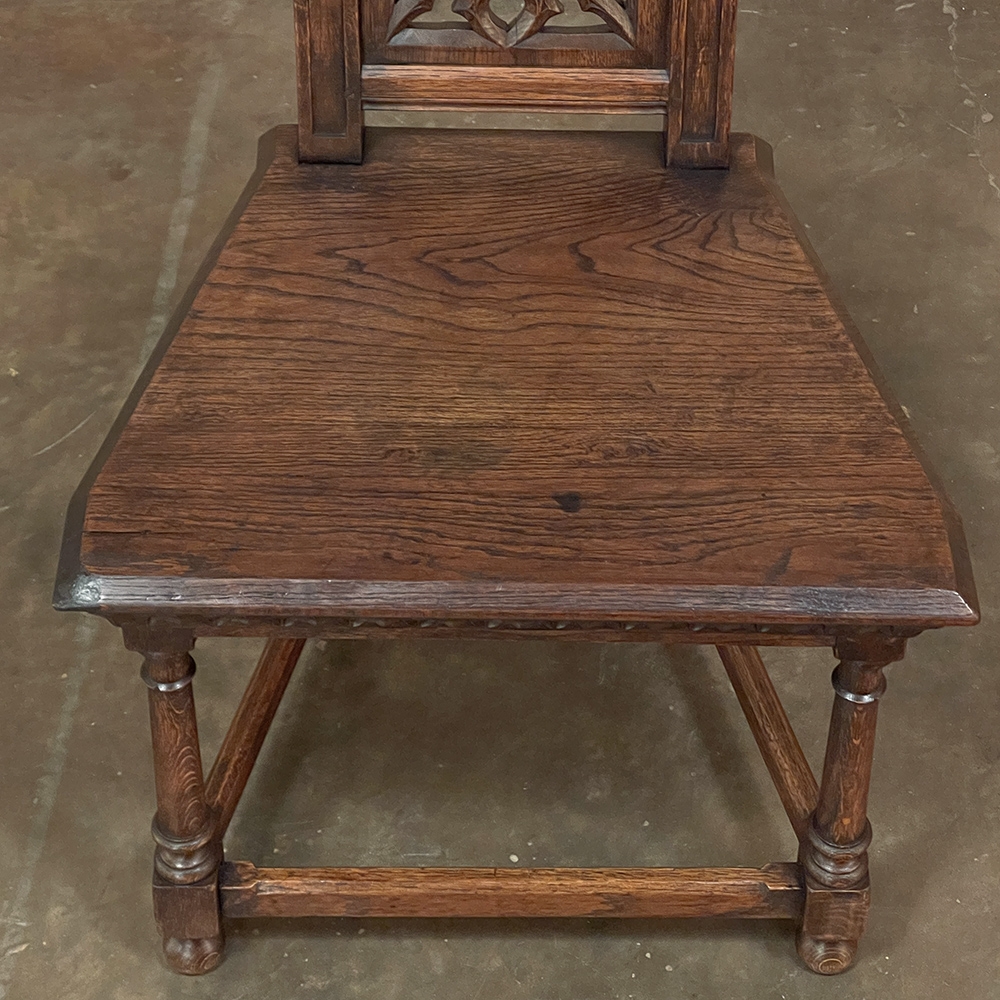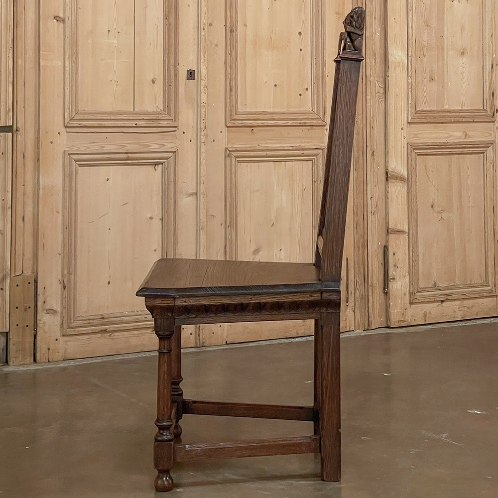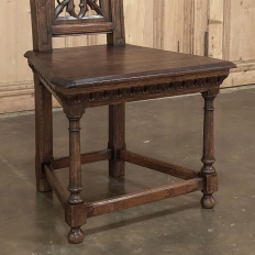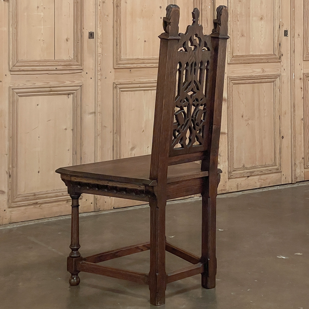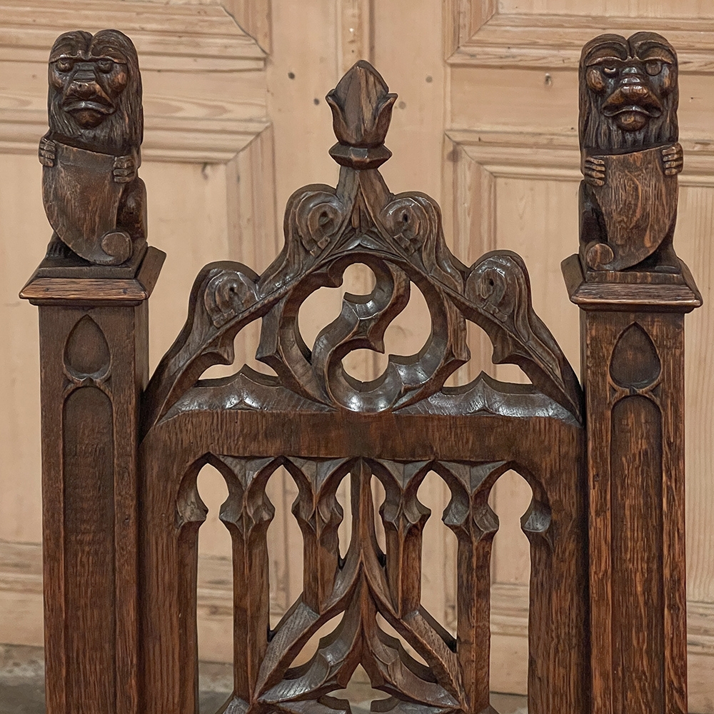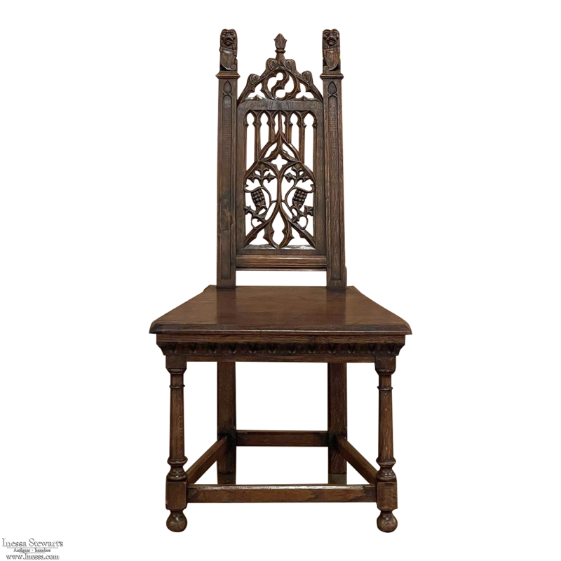 Sale19th Century French Gothic Revival Chair is a wonderful testament to the craftsmen of a bygone era! Hand-sculpted from old growth oak, it features a trapezoidal seat which creates a shape great for anywhere in the room, especially the corner. The seatback uprights are one piece of wood from the carved lions on top to the floor, and bracket the seatback which consists of a stunning pierce-carved study in the Gothic manner including a variety of geometric and symbolic shapes, including stylized fleurs de lys and grape clusters. The seat and support framework below are a study in contrast, with only an egg & dart bordering under the seat planks for adornment, while supplying sturdy support reinforced by stretchers and finished with teardrop feet in front.