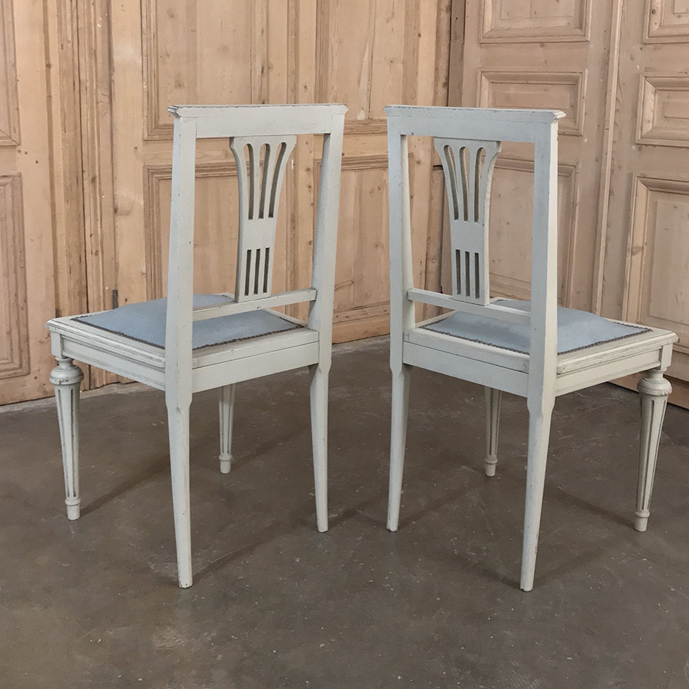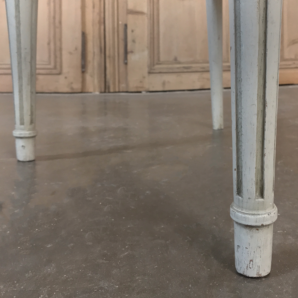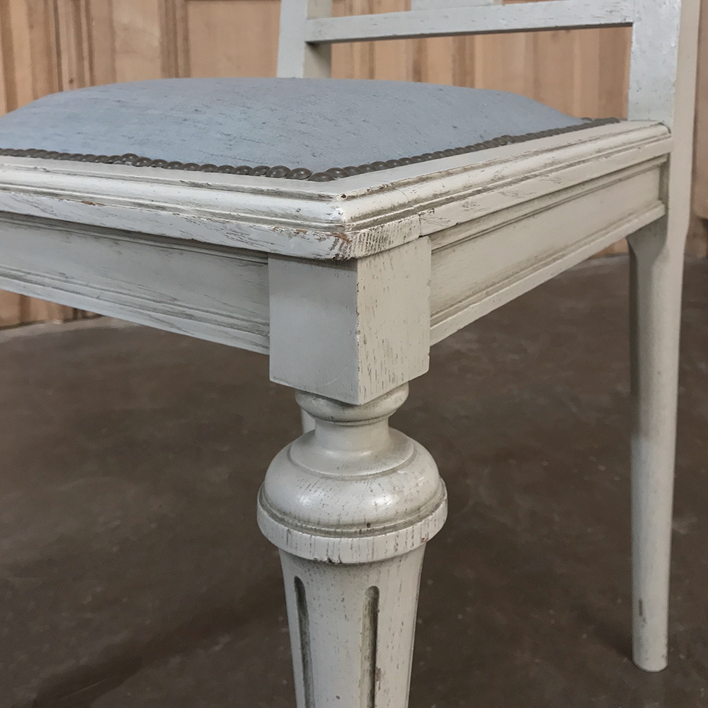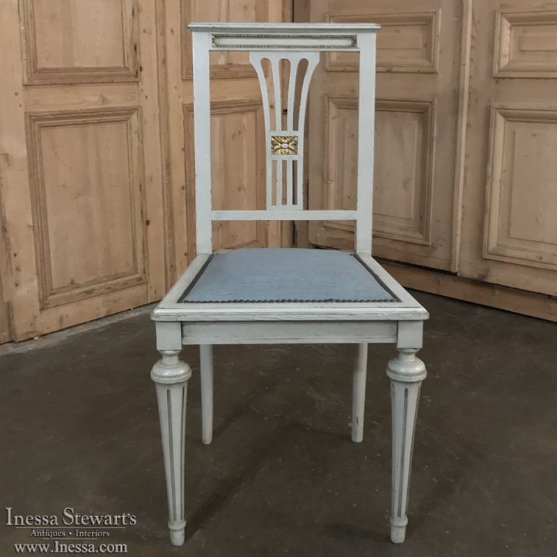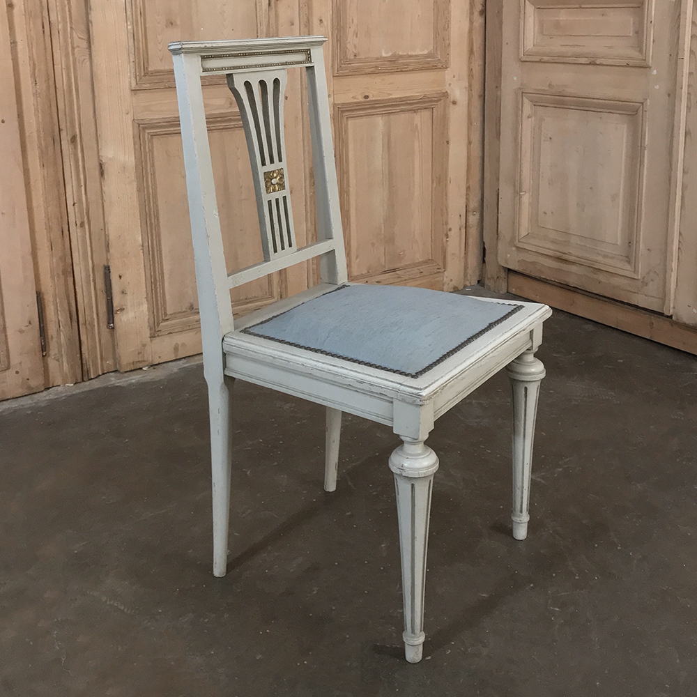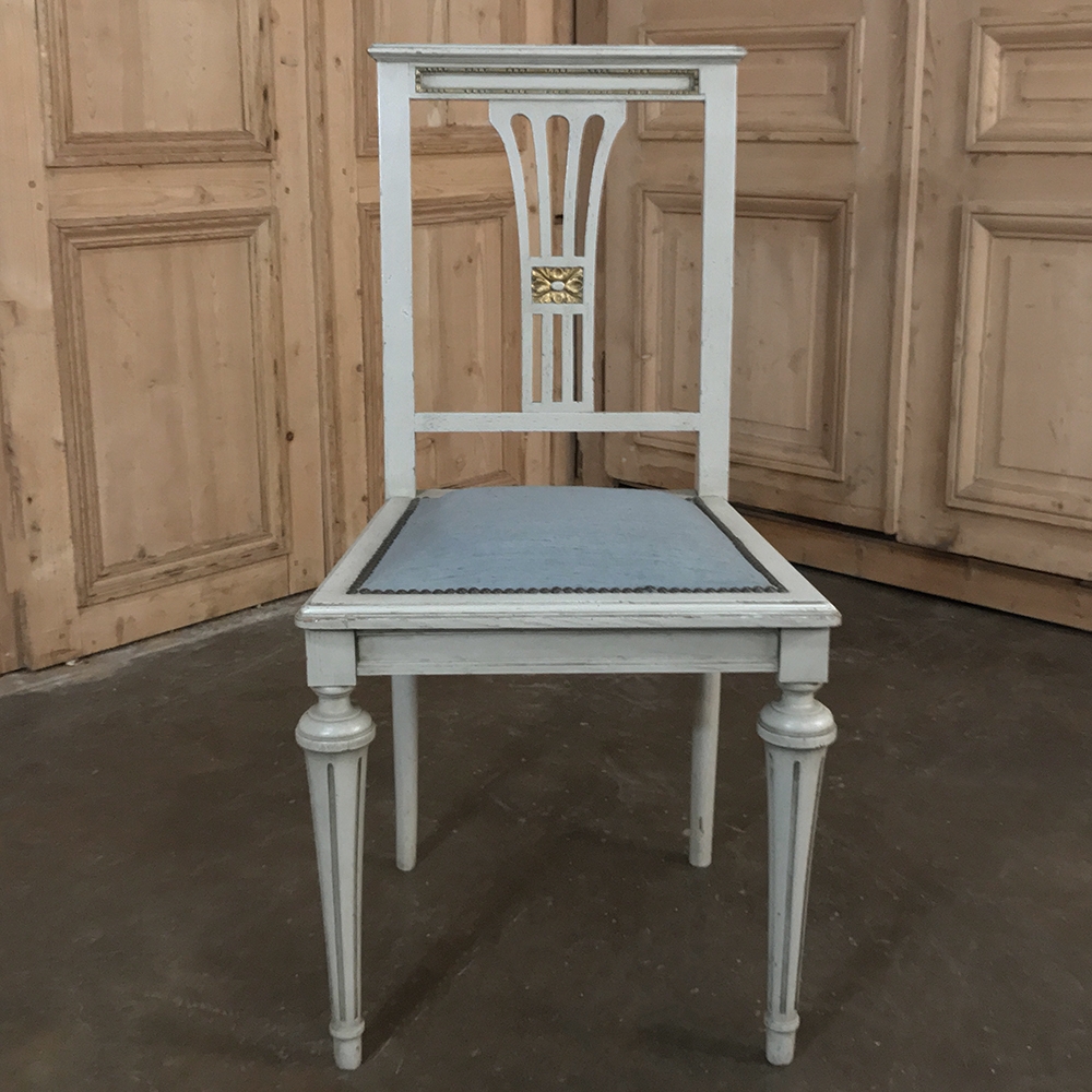 Sale19th Century French Painted Salon Chair features classic architecture enhanced by the patinaed painted finish with gold highlighting on the subtle carved detail.