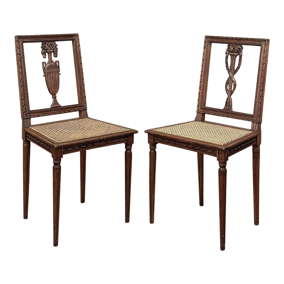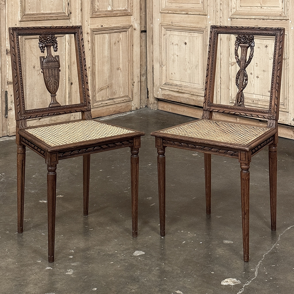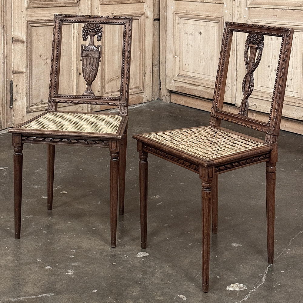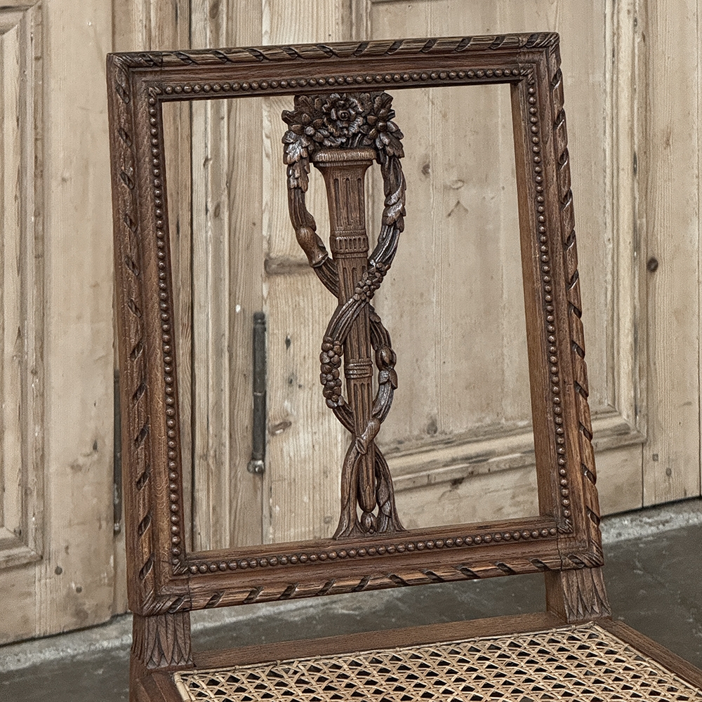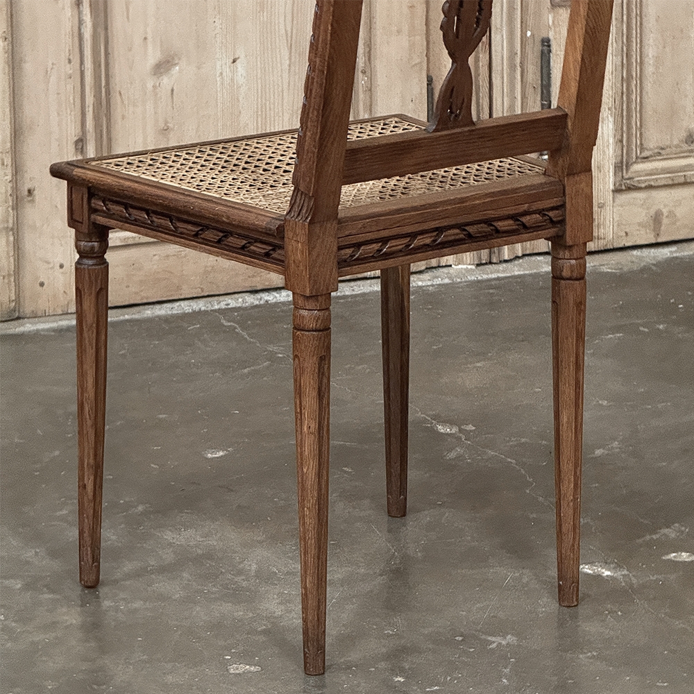 Antique French Louis XVI Caned Side Chair is a perfect choice for any occasional use, especially Southern climates where the caned seats really show their advantage of keeping cool. Framework is entirely constructed from solid oak, and features a rectilinear neoclassical architecture that includes four tapered and fluted legs supporting the caned seats, underneath which is a reinforcing apron all around carved with spiral ribbon bordering. Lotus blossom petals are carved into the transitions between the seat and seat backs, with the seat backs also treated to the same spiral ribbon bordering, and a beaded bordering inside that, similar to a frame around artwork. Of course, if you consider the sculptured back splat to be art, you would be correct, making the picture frame effect of the surroundings perfectly appropriate! Note that the back splats are not identical, either. Be sure to specify when calling in your order to 888-326-2390.