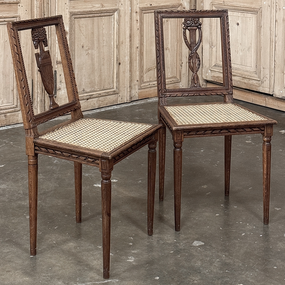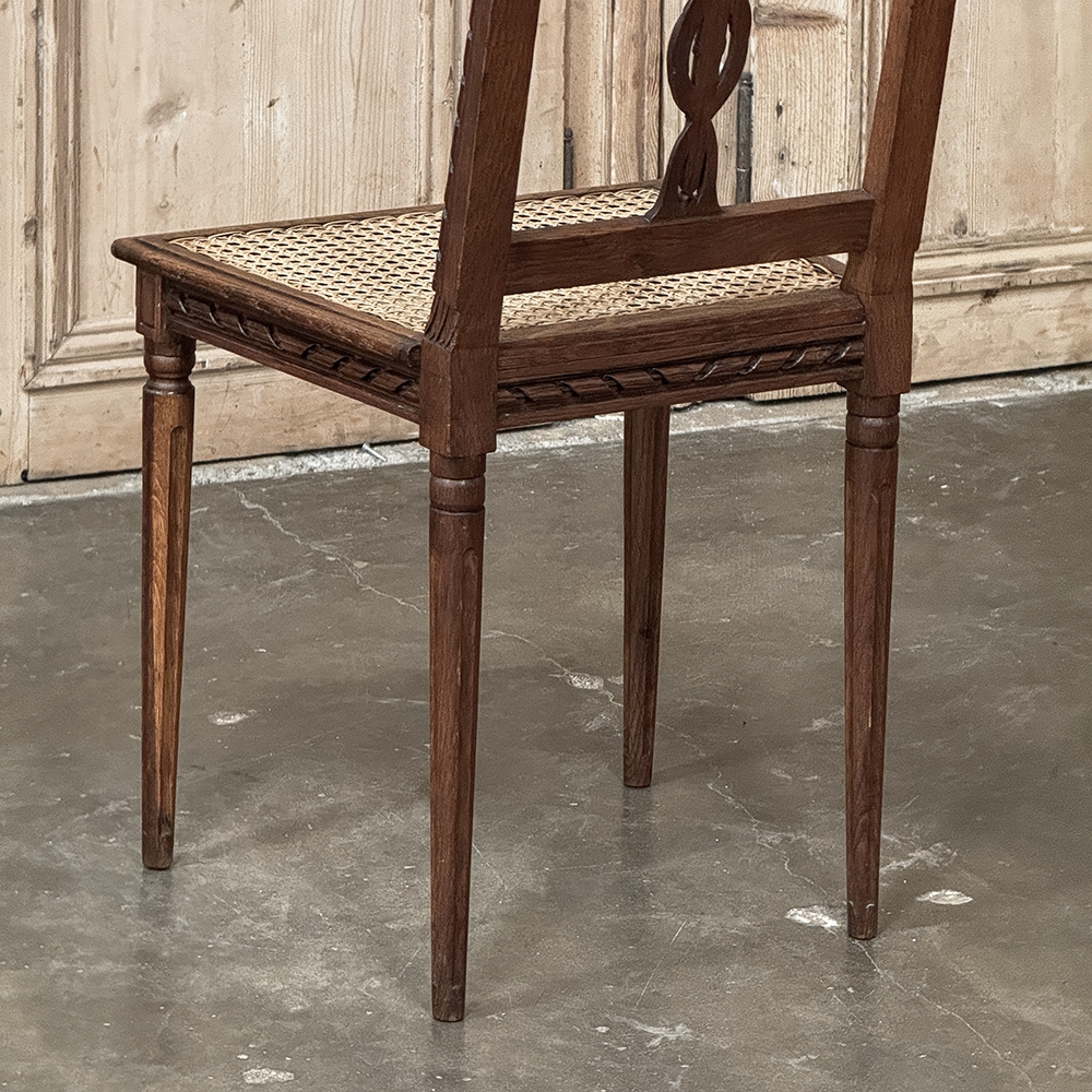 Antique French Louis XVI Caned Side Chair is a perfect choice for any occasional use, especially Southern climates where the caned seats really show their advantage of keeping cool. Framework is entirely constructed from solid oak, and features a rectilinear neoclassical architecture that includes four tapered and fluted legs supporting the caned seats, underneath which is a reinforcing apron all around carved with spiral ribbon bordering. Lotus blossom petals are carved into the transitions between the seat and seat backs, with the seat backs also treated to the same spiral ribbon bordering, and a beaded bordering inside that, similar to a frame around artwork. Of course, if you consider the sculptured back splat to be art, you would be correct, making the picture frame effect of the surroundings perfectly appropriate! Note that the back splats are not identical, either. Be sure to specify when calling in your order to 888-326-2390.