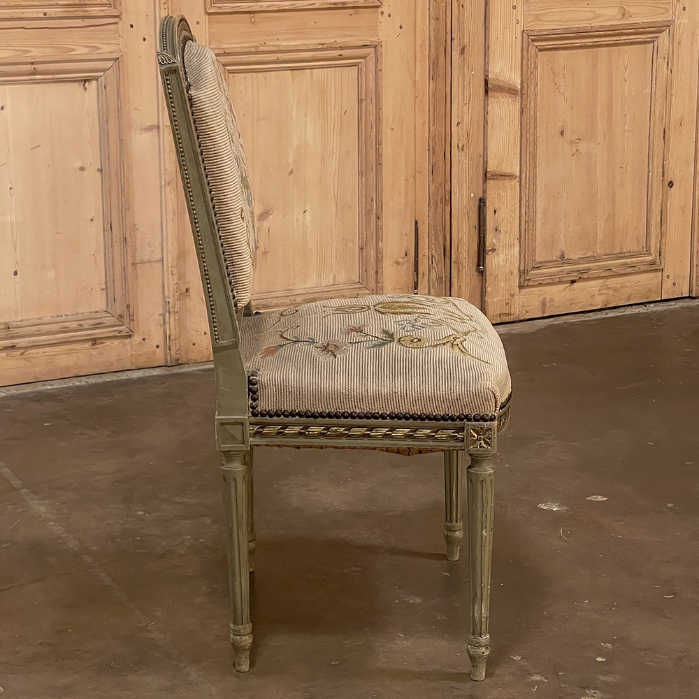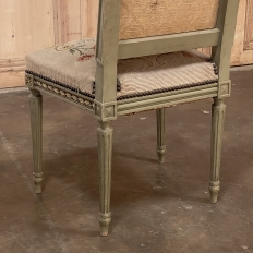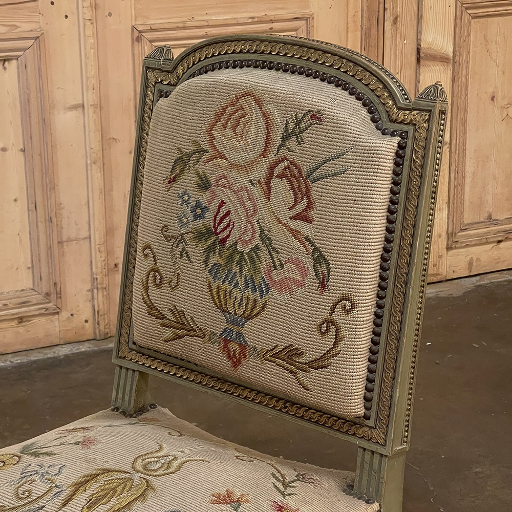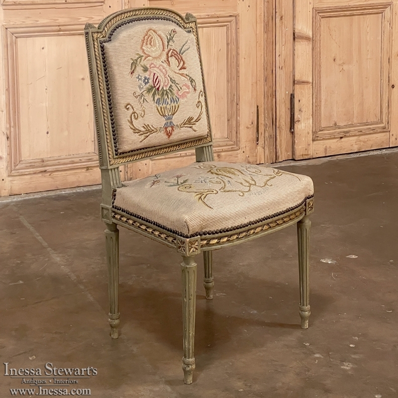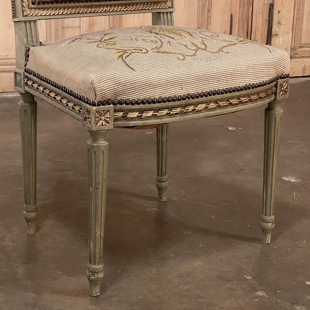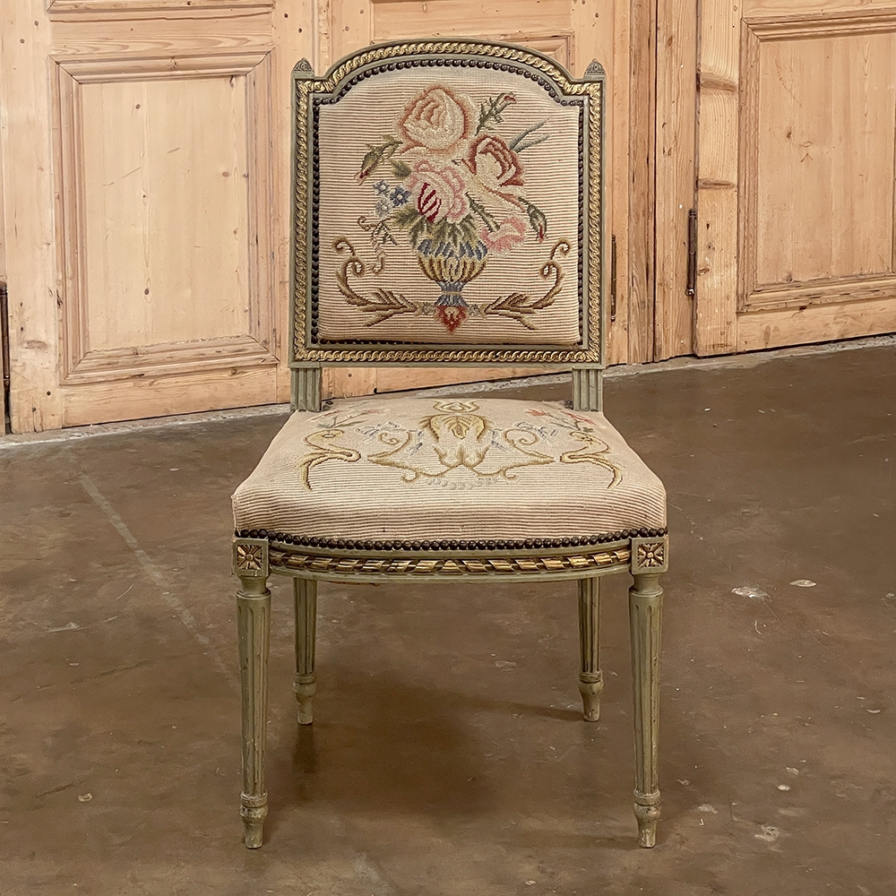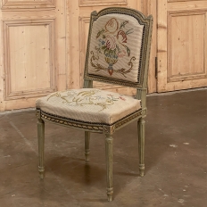 SaleThis Antique French Louis XVI Needlepoint Tapestry Chair is a part of the salon set which is sold separately (see the other related items by clicking on the thumbnails below), and would be icing on the cake for any seating group, showing finely carved yet tailored architecture that has been given an original painted finish which displays a lovely patina. Original hand embroidered needlepoint and petit point tapestry upholstery adds an opulent touch.