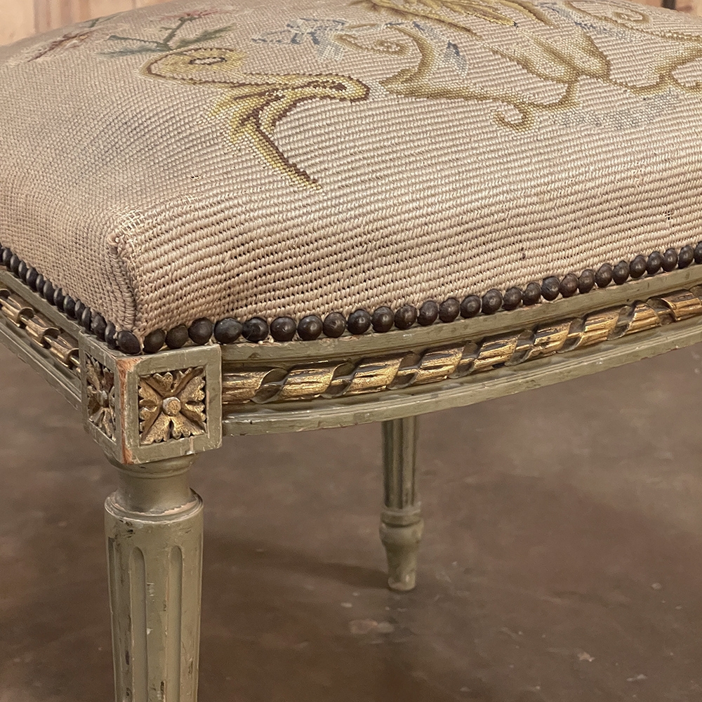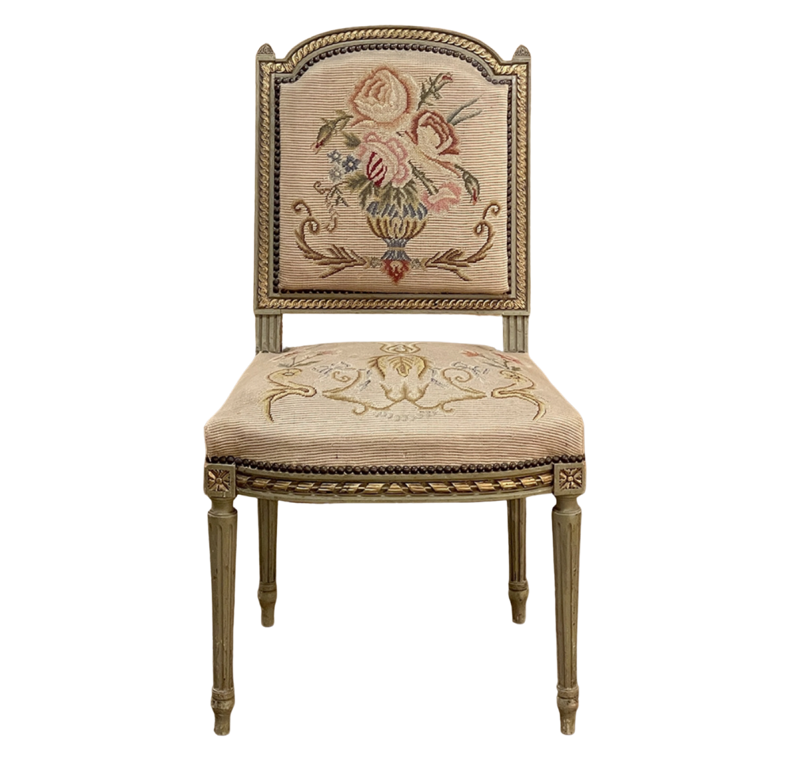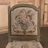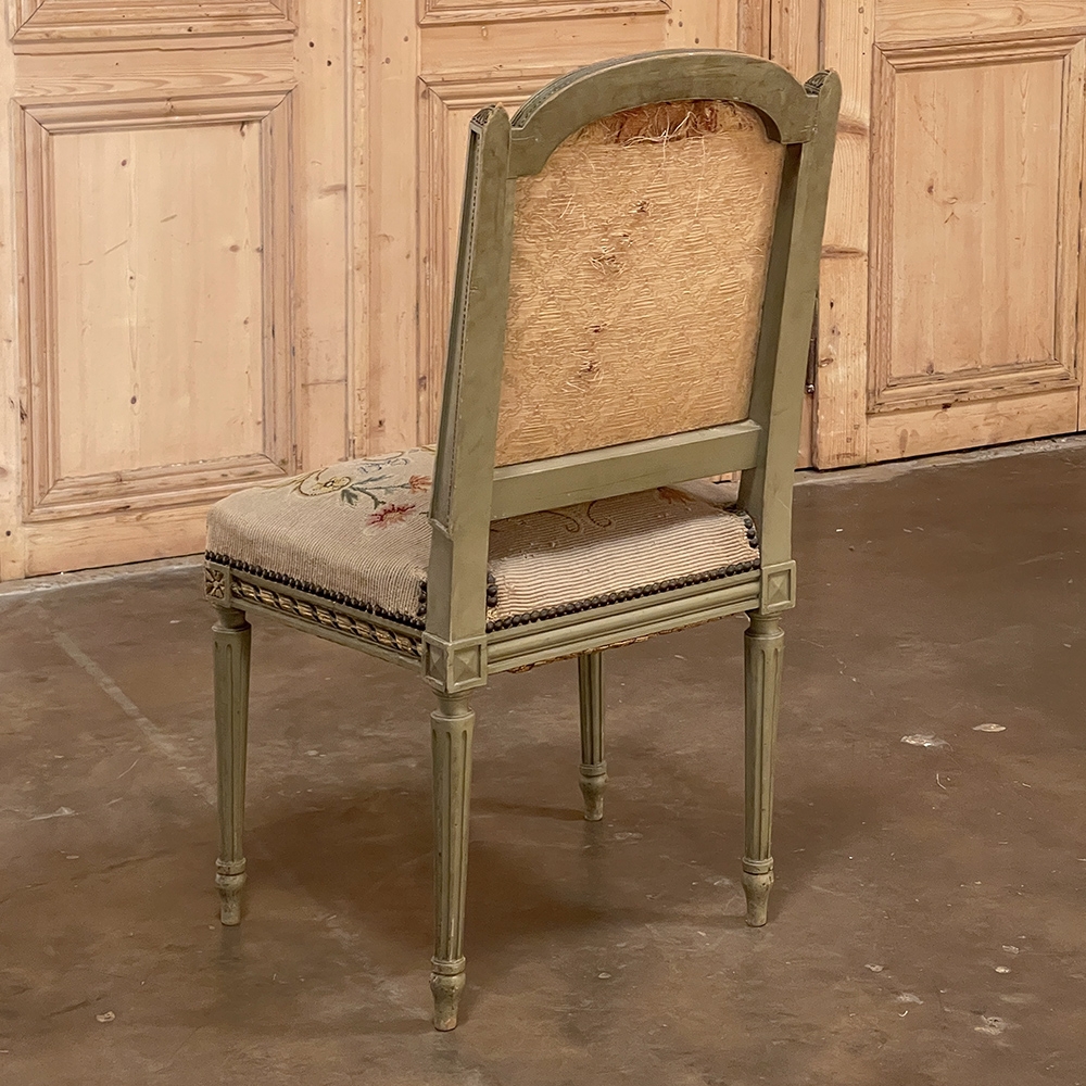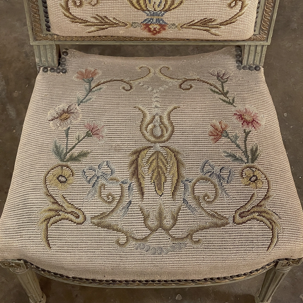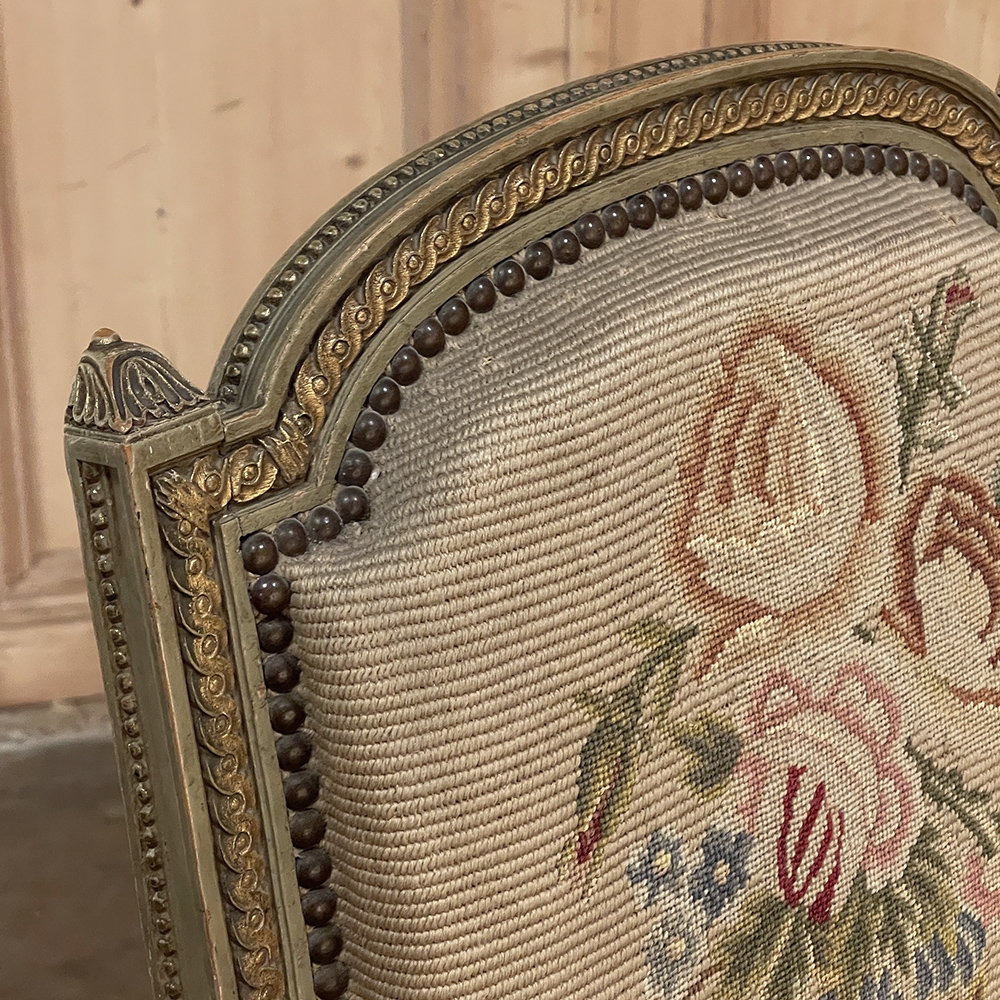 SaleThis Antique French Louis XVI Needlepoint Tapestry Chair is a part of the salon set which is sold separately (see the other related items by clicking on the thumbnails below), and would be icing on the cake for any seating group, showing finely carved yet tailored architecture that has been given an original painted finish which displays a lovely patina. Original hand embroidered needlepoint and petit point tapestry upholstery adds an opulent touch.