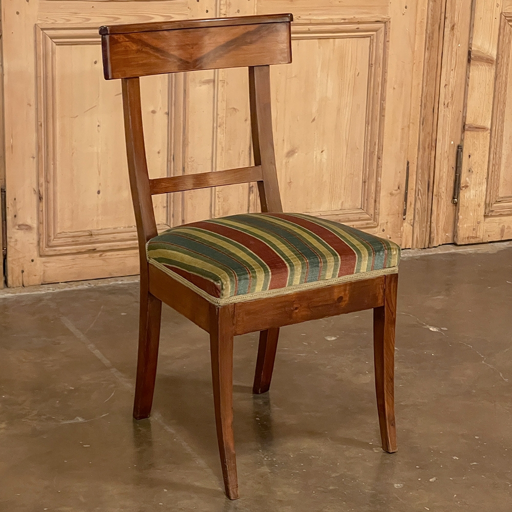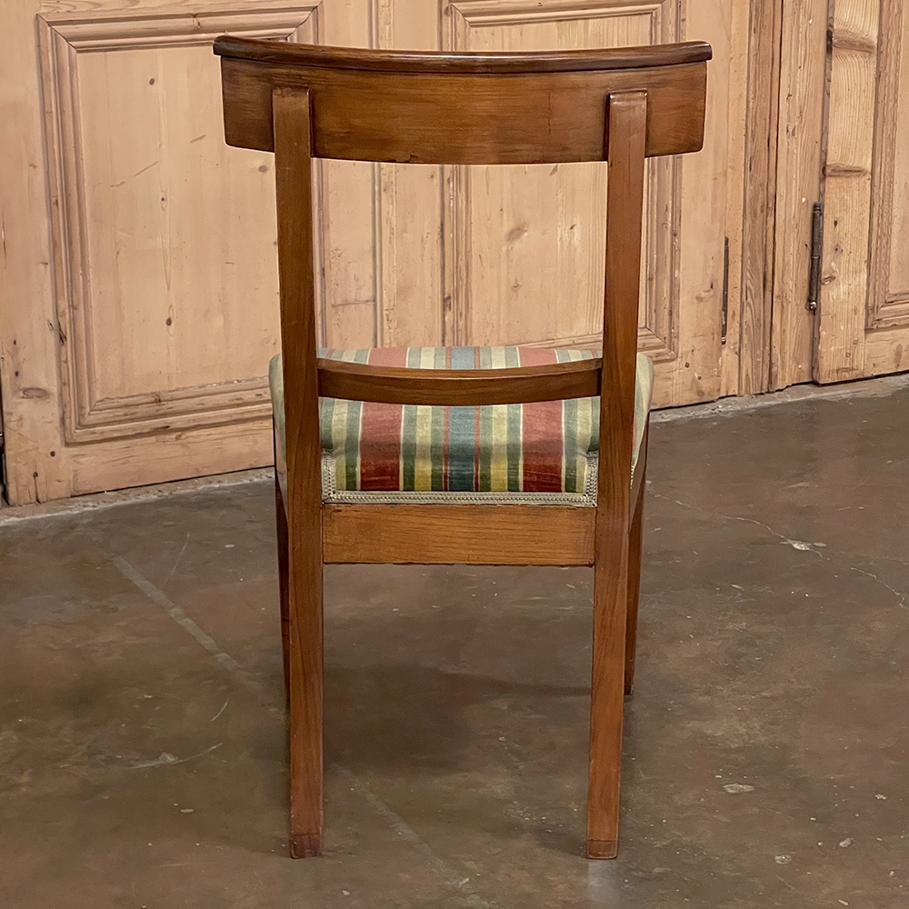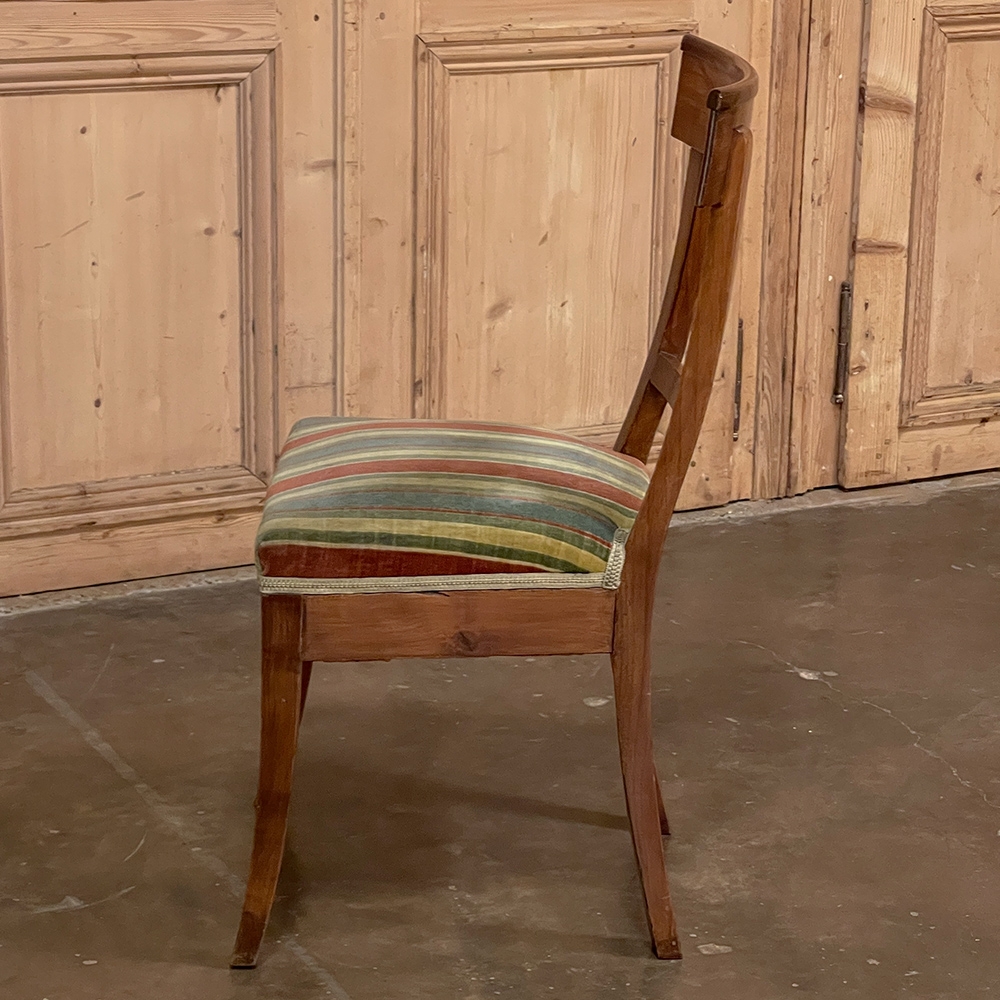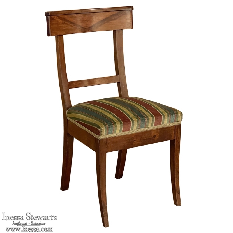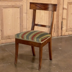 SaleFINAL SALE! Antique French Walnut Directoire Style Chair reflects an elegant simplicity of line that makes it compatible with most any decor! Perfect for formal or casual or anything in between, the seat back is contoured and comfortable, and crafted from solid French walnut like the rest of the chair which absolutely glows with beauty. The tailored lines support a seat just the right size, with subtly flared rear legs for extra stability. Upholstery shows wear and should be replaced.