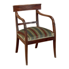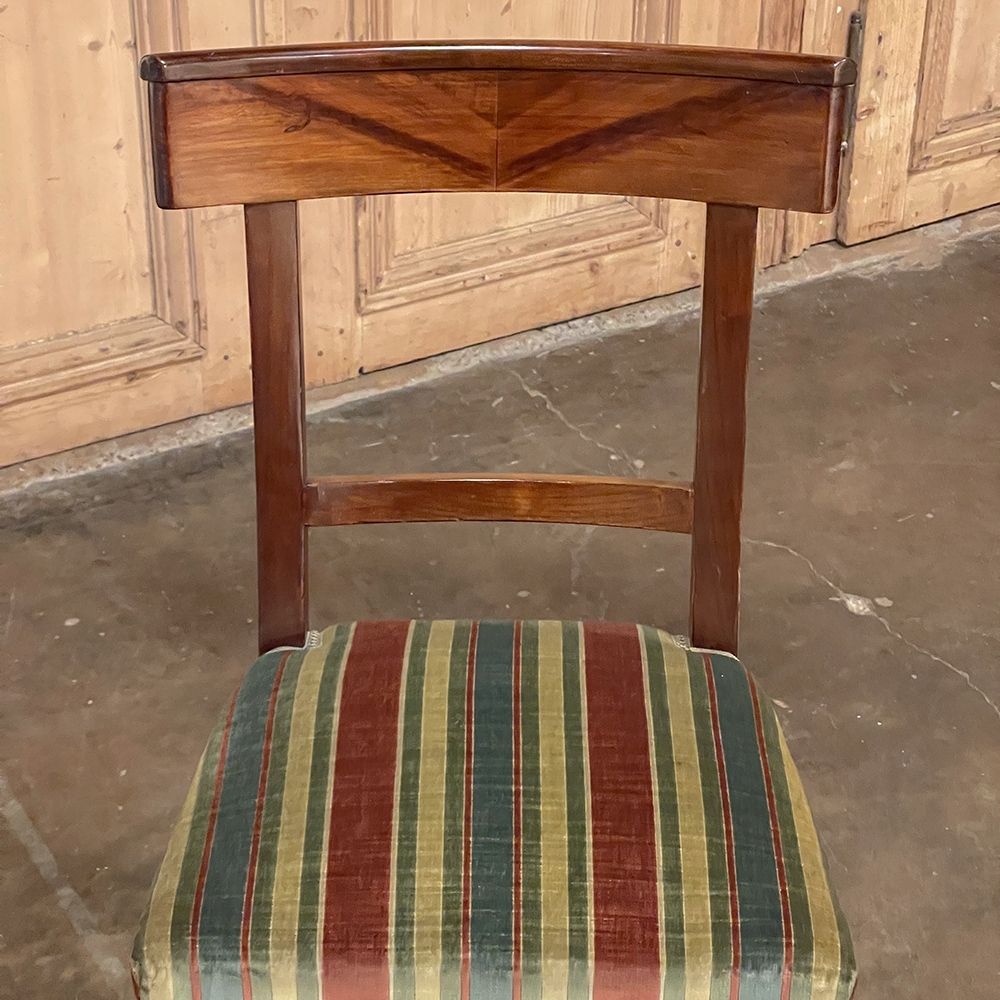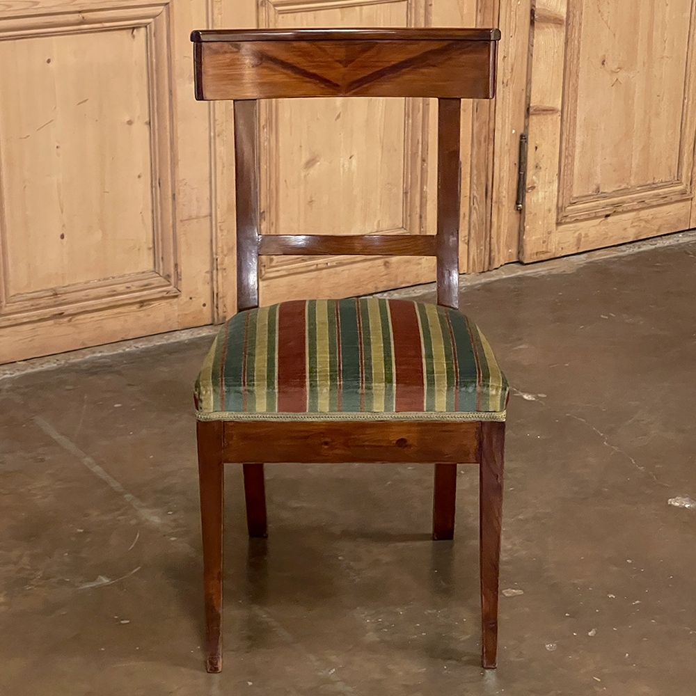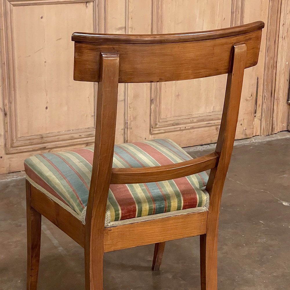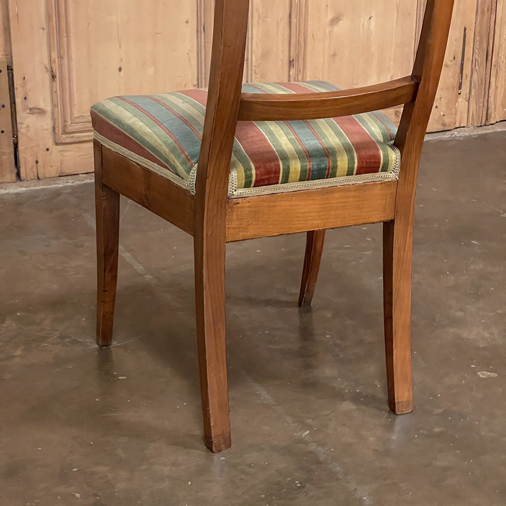 SaleFINAL SALE! Antique French Walnut Directoire Style Chair reflects an elegant simplicity of line that makes it compatible with most any decor! Perfect for formal or casual or anything in between, the seat back is contoured and comfortable, and crafted from solid French walnut like the rest of the chair which absolutely glows with beauty. The tailored lines support a seat just the right size, with subtly flared rear legs for extra stability. Upholstery shows wear and should be replaced.