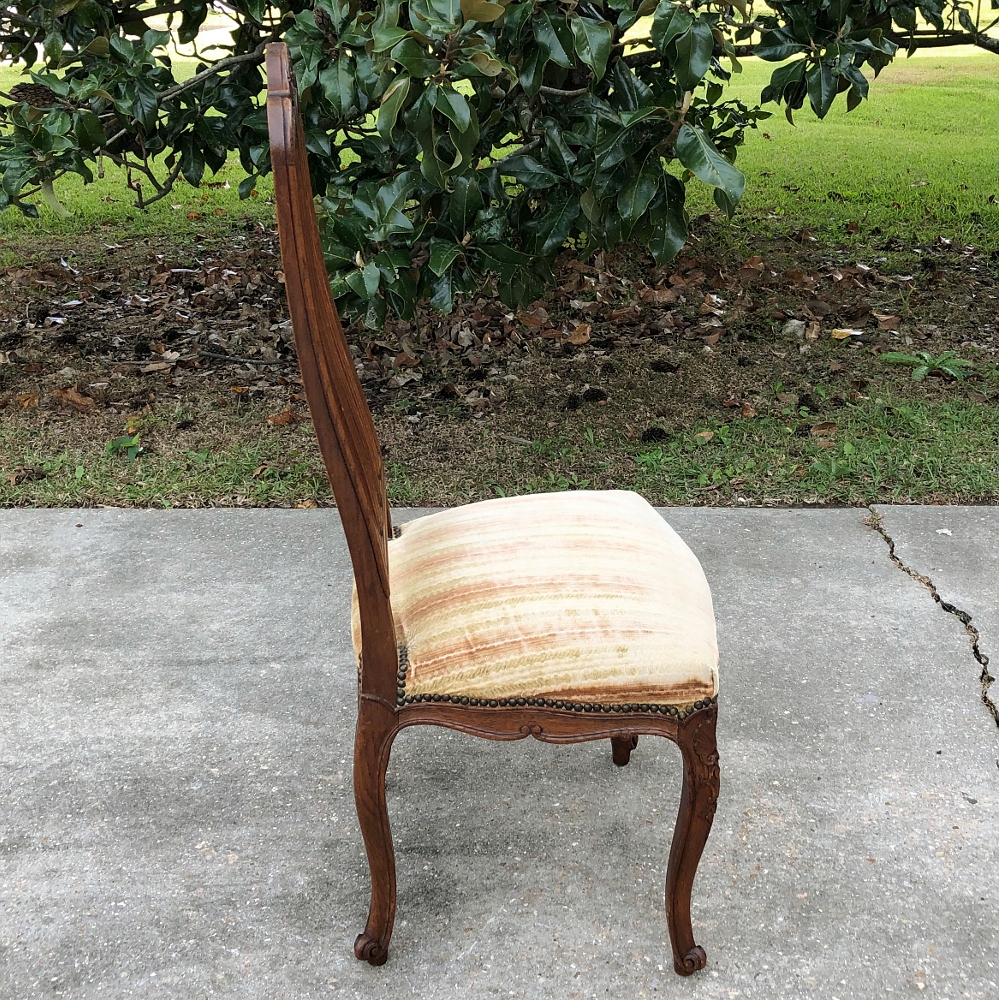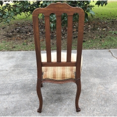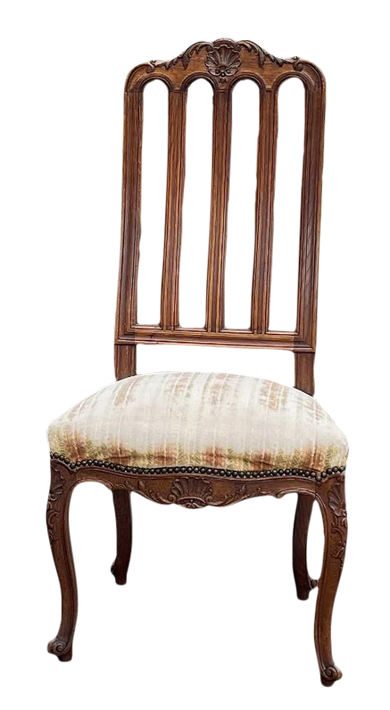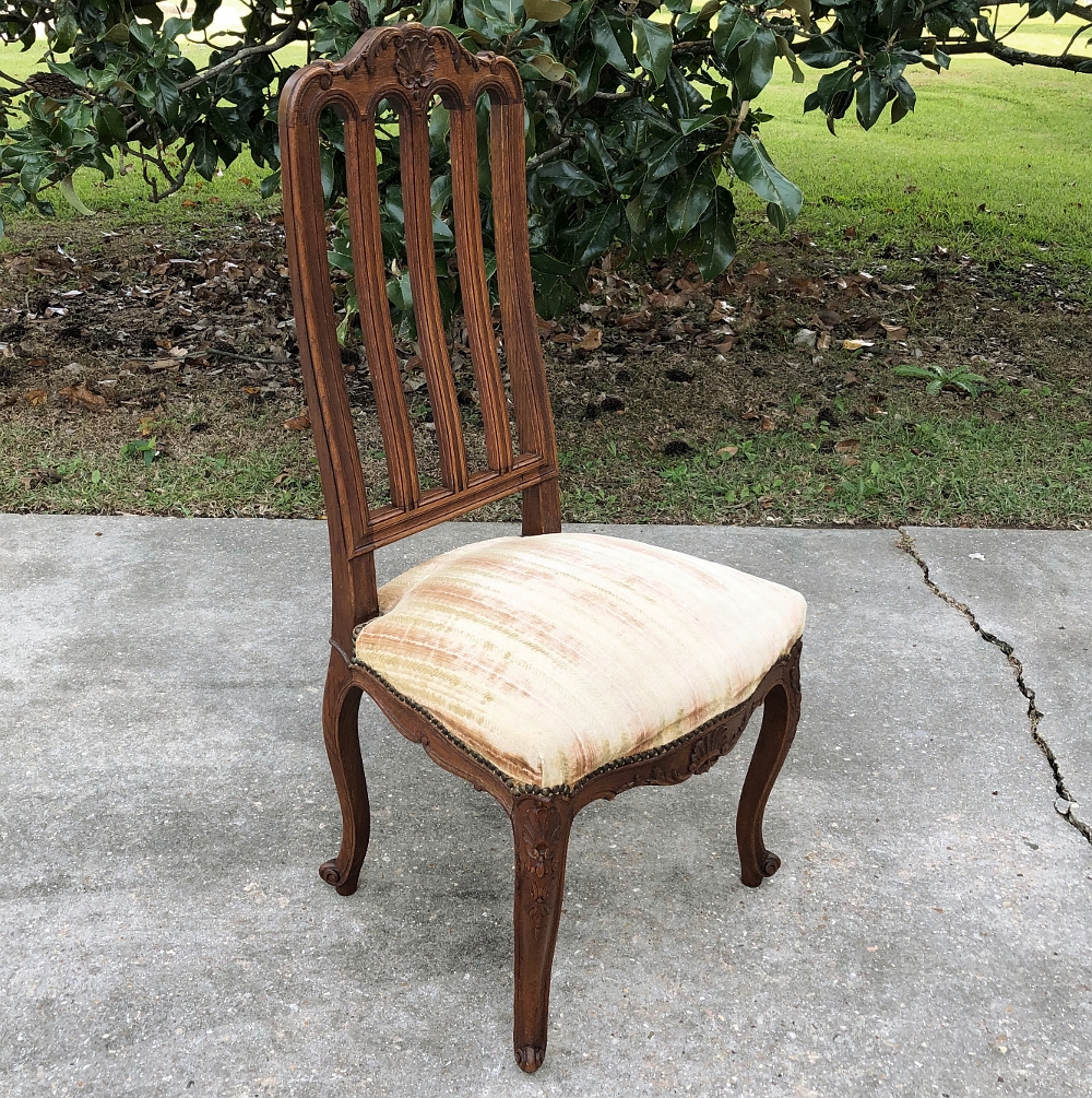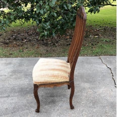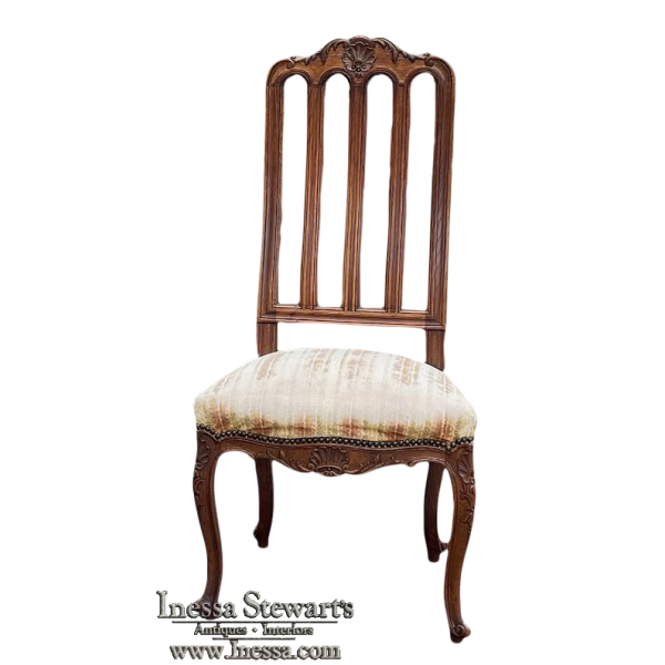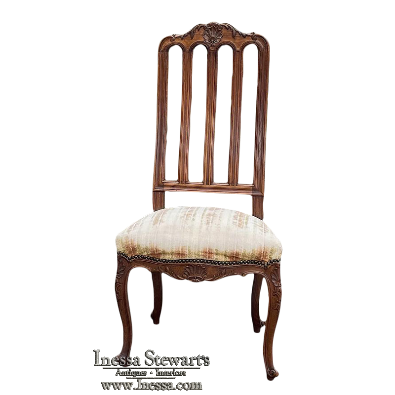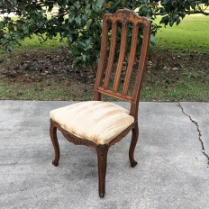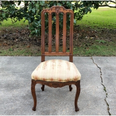 Antique Liegoise Louis XIV Side Chair features the graceful lines that are exceptionally ergonomic, designed before the word "ergonomic" had even been coined! High, S-curved seatback with vertical slats conform to one's back in comfort, without horizontal ridges at all in the design. Generous seat flares out with a trapezoidal shape, again, for comfort. Triple arched seatback crown and undulations of the apron below, as well as the elegant cabriole legs are all carved with handsome shell and foliate motifs for a classic, timeless look. Ideal as an extra chair for any room, including when guests arrive for dinner!