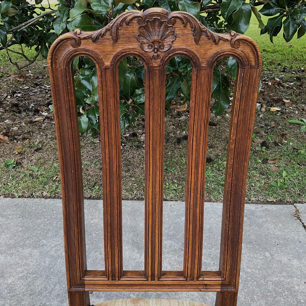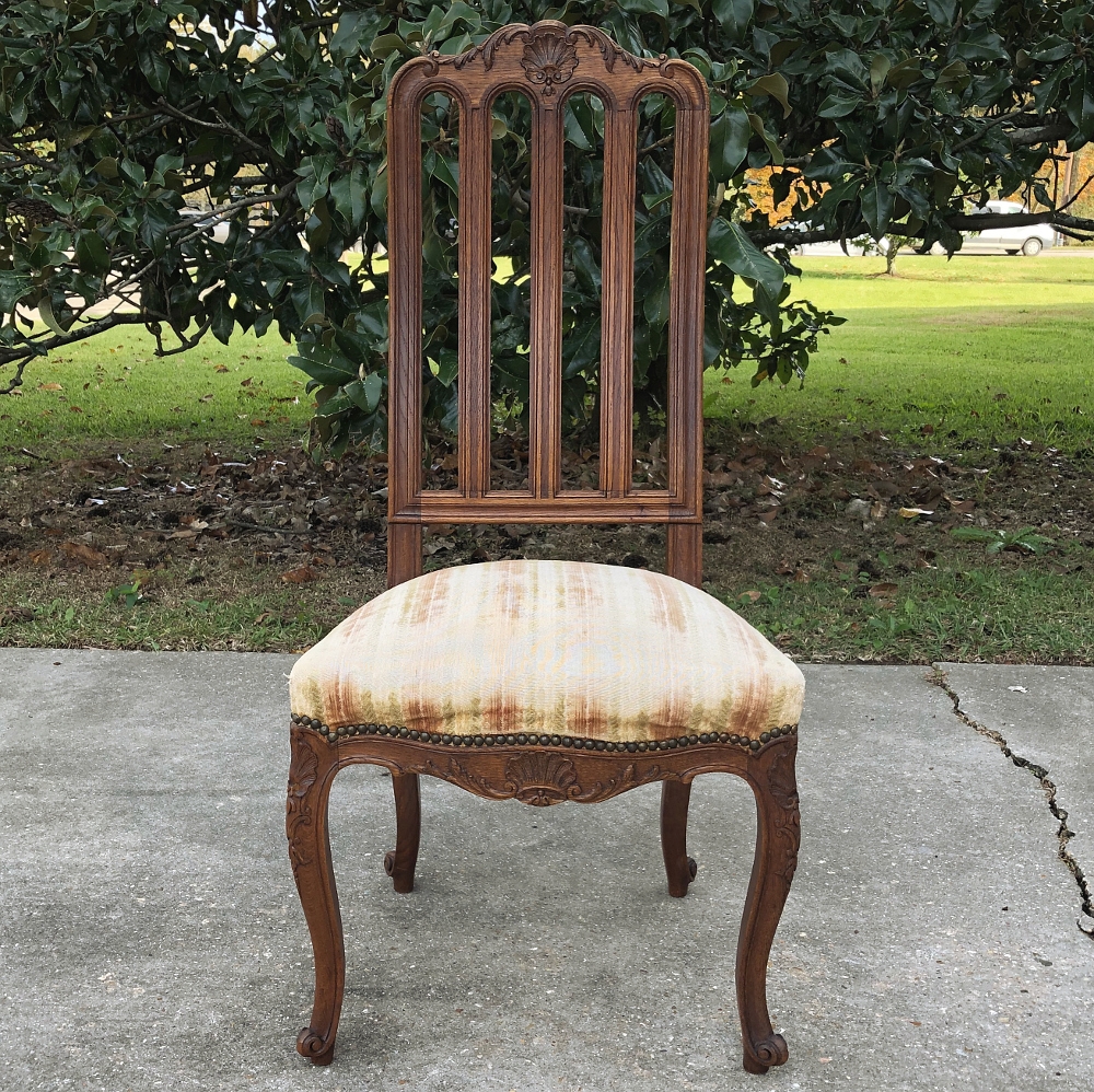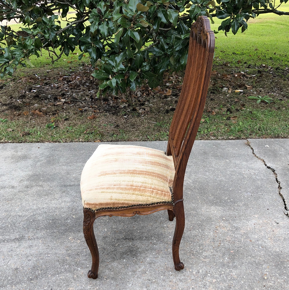 Antique Liegoise Louis XIV Side Chair features the graceful lines that are exceptionally ergonomic, designed before the word "ergonomic" had even been coined! High, S-curved seatback with vertical slats conform to one's back in comfort, without horizontal ridges at all in the design. Generous seat flares out with a trapezoidal shape, again, for comfort. Triple arched seatback crown and undulations of the apron below, as well as the elegant cabriole legs are all carved with handsome shell and foliate motifs for a classic, timeless look. Ideal as an extra chair for any room, including when guests arrive for dinner!