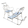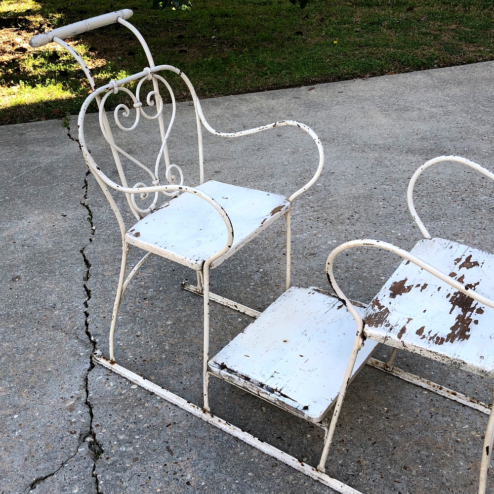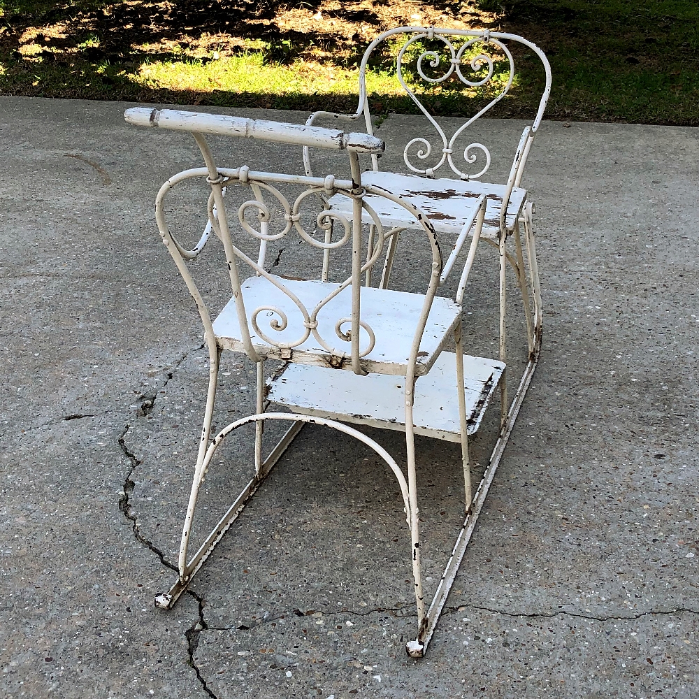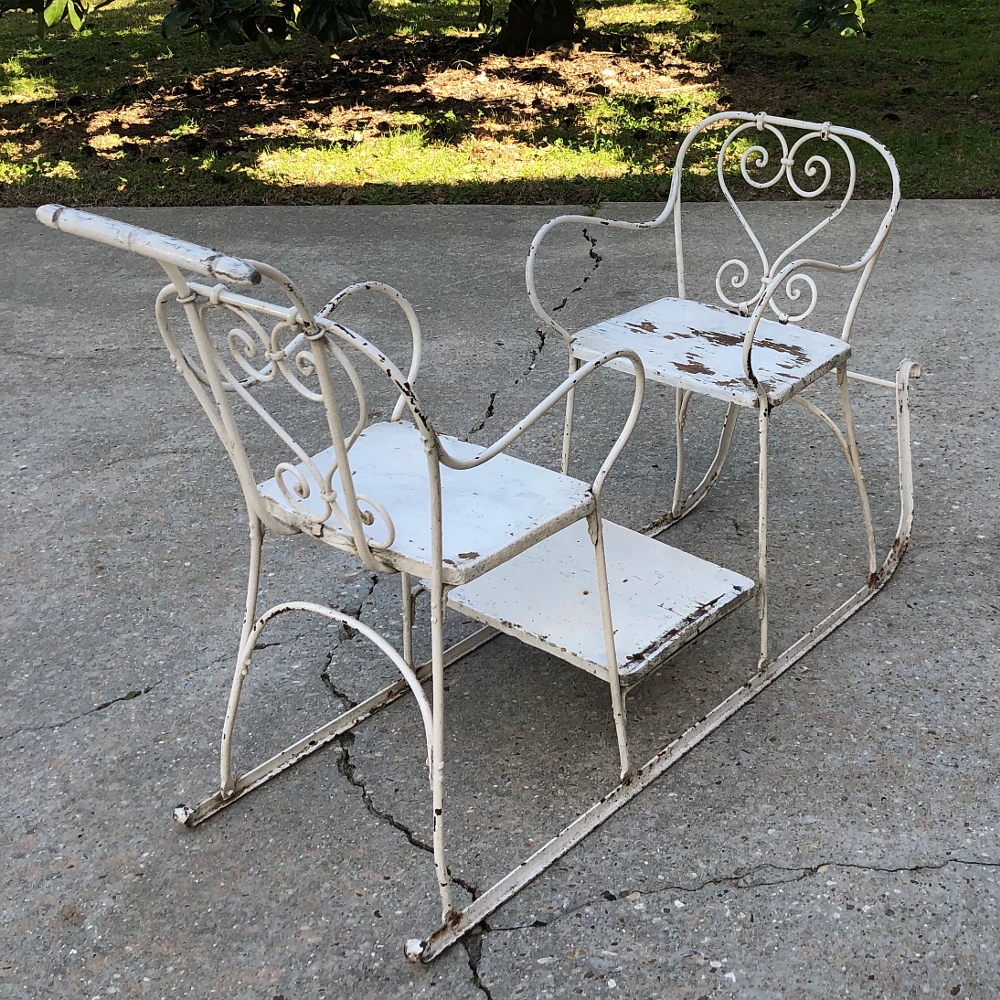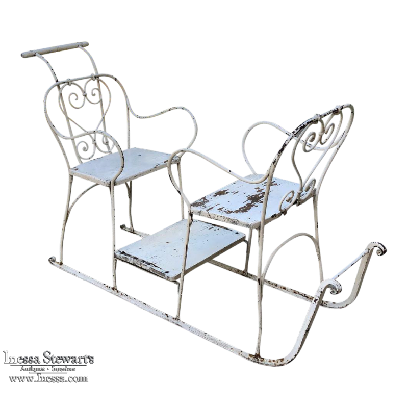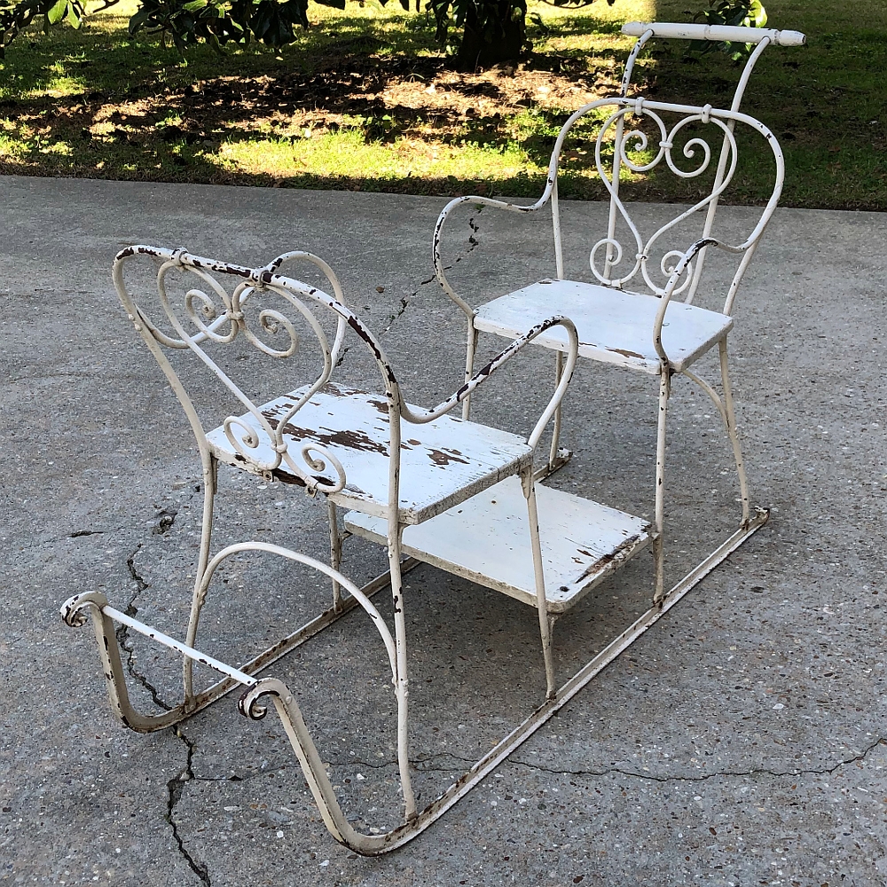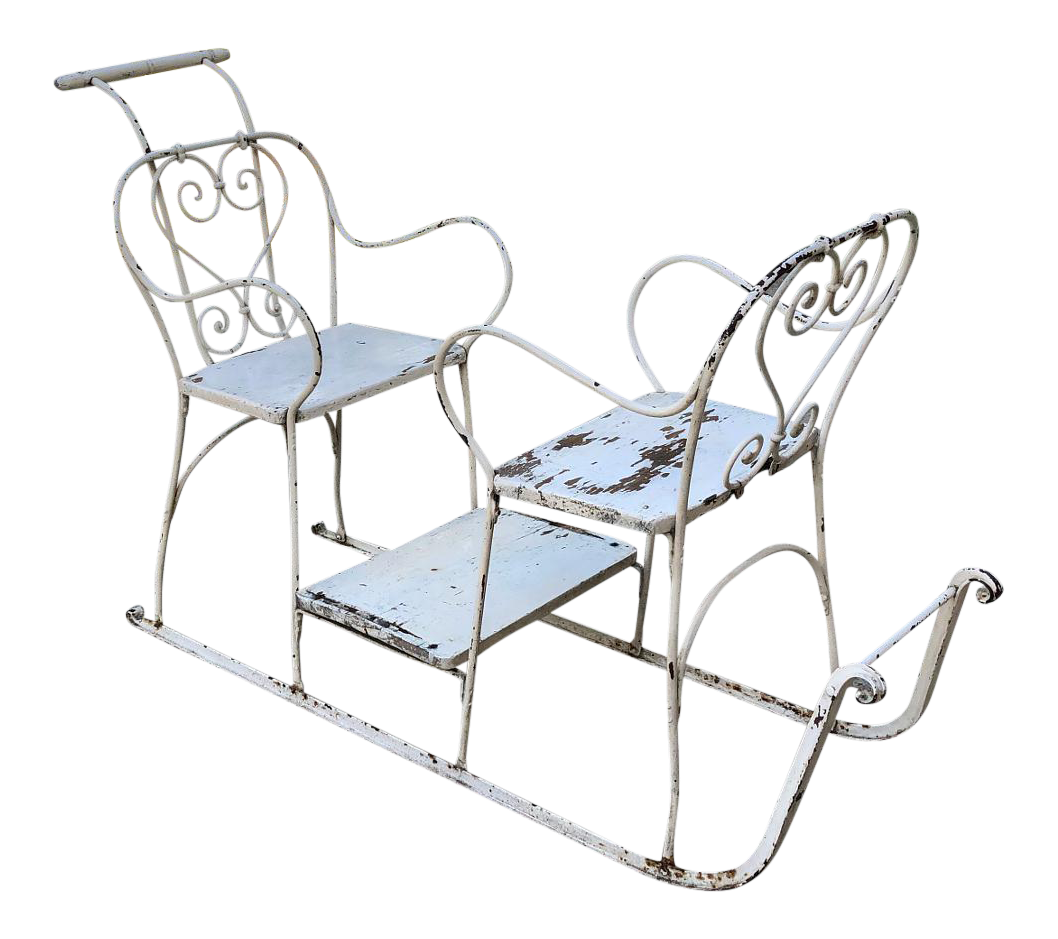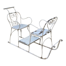 SaleCharming Antique Country French Wrought Iron Children's Sleigh provided sheer joy to the two children who were pushed in the snow as if they were in a stroller. Such devices allowed mothers to take their children to market or through the town even in snow and icy weather. Hand forged in iron in a traditional Country French design, it features its original white paint that has literally weathered the storm and time itself. Today this lovely sleigh makes a precious decorative accent during any time of the year, and especially at Christmas!