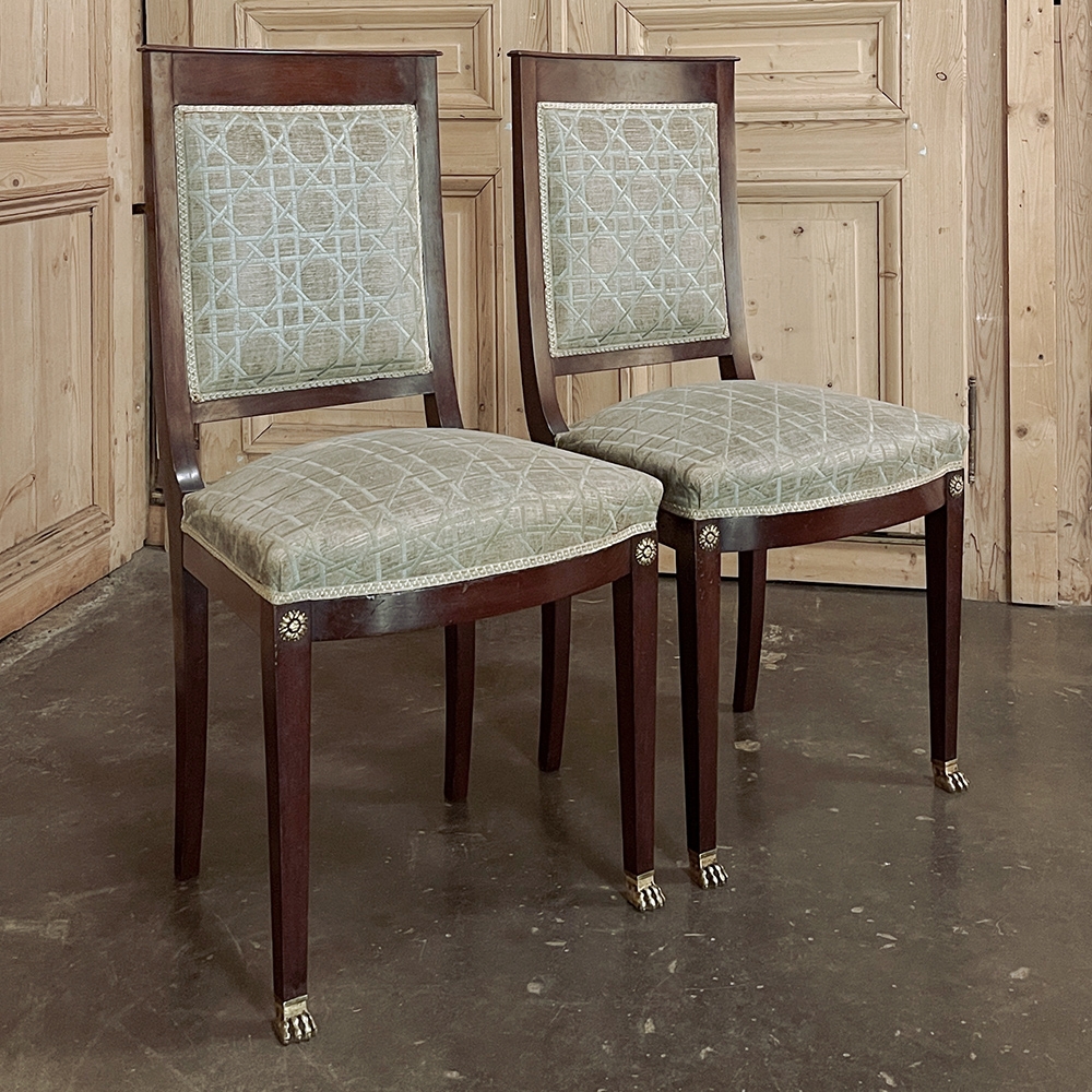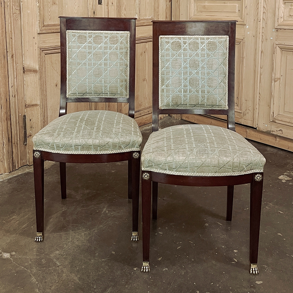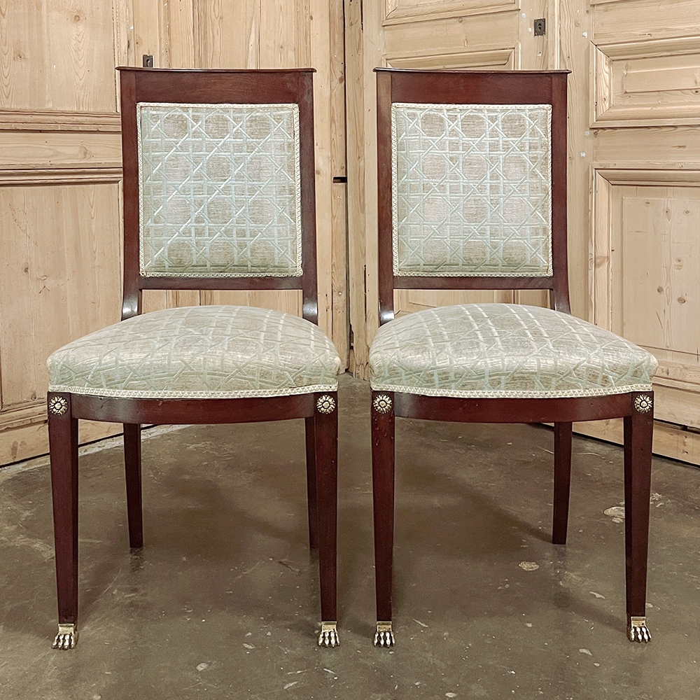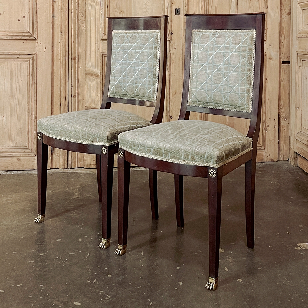 SalePair 19th Century French Napoleon III Period Mahogany Chairs reflects the stately classically-inspired architecture of the ancients, accentuated by bronze castings of rosettes and lions' paw feet which contrast beautifully with the rich sumptuousness of the exotic imported mahogany frames. Upholstery is serviceable.