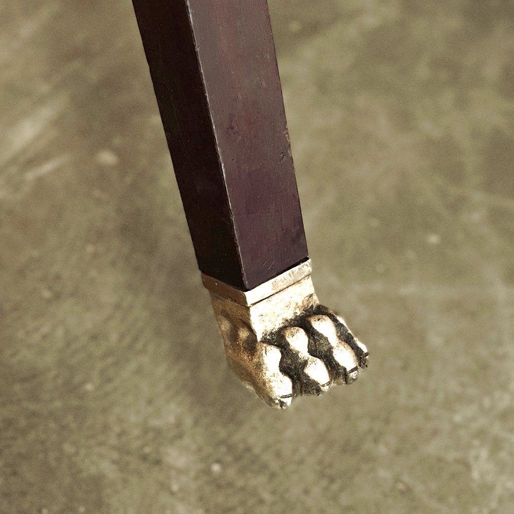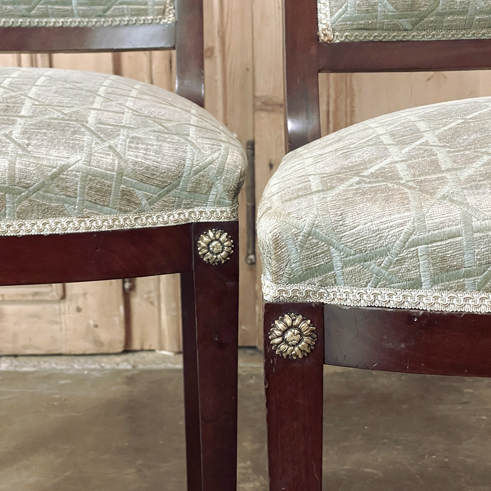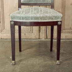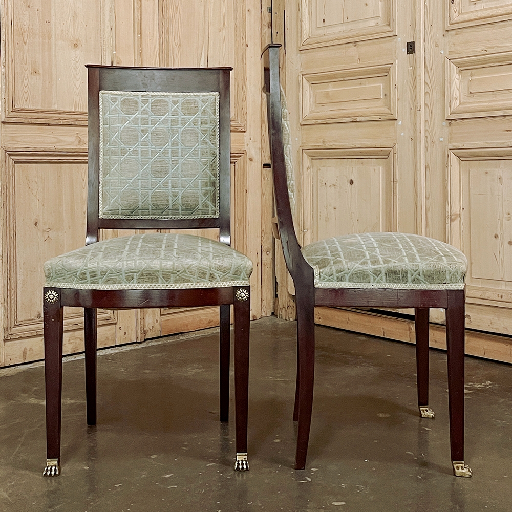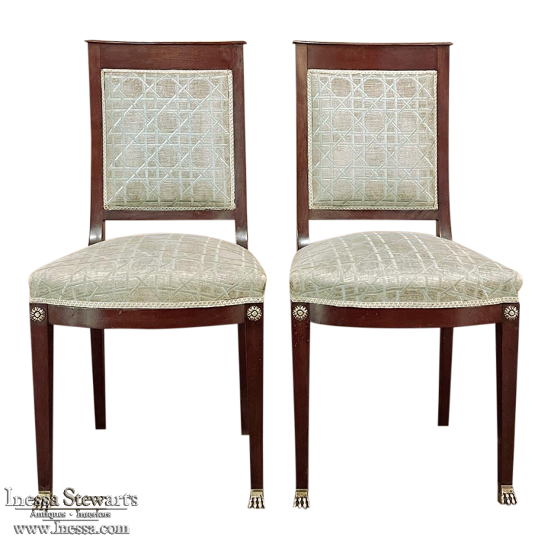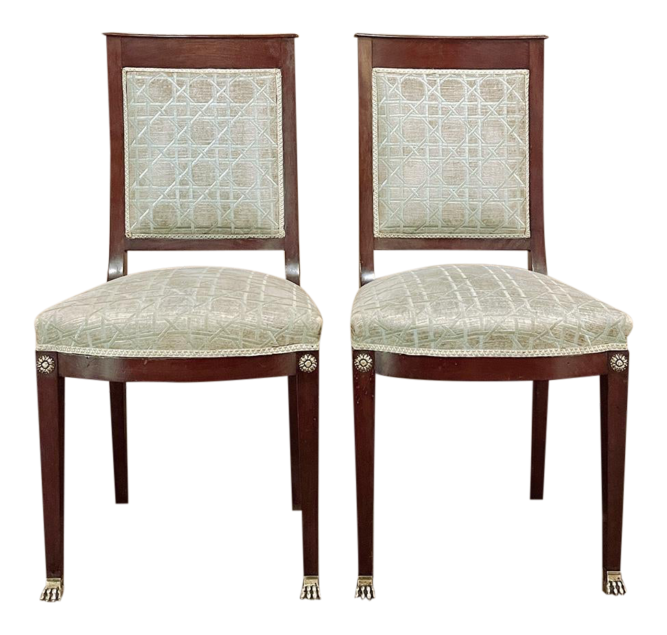SalePair 19th Century French Napoleon III Period Mahogany Chairs reflects the stately classically-inspired architecture of the ancients, accentuated by bronze castings of rosettes and lions' paw feet which contrast beautifully with the rich sumptuousness of the exotic imported mahogany frames. Upholstery is serviceable.