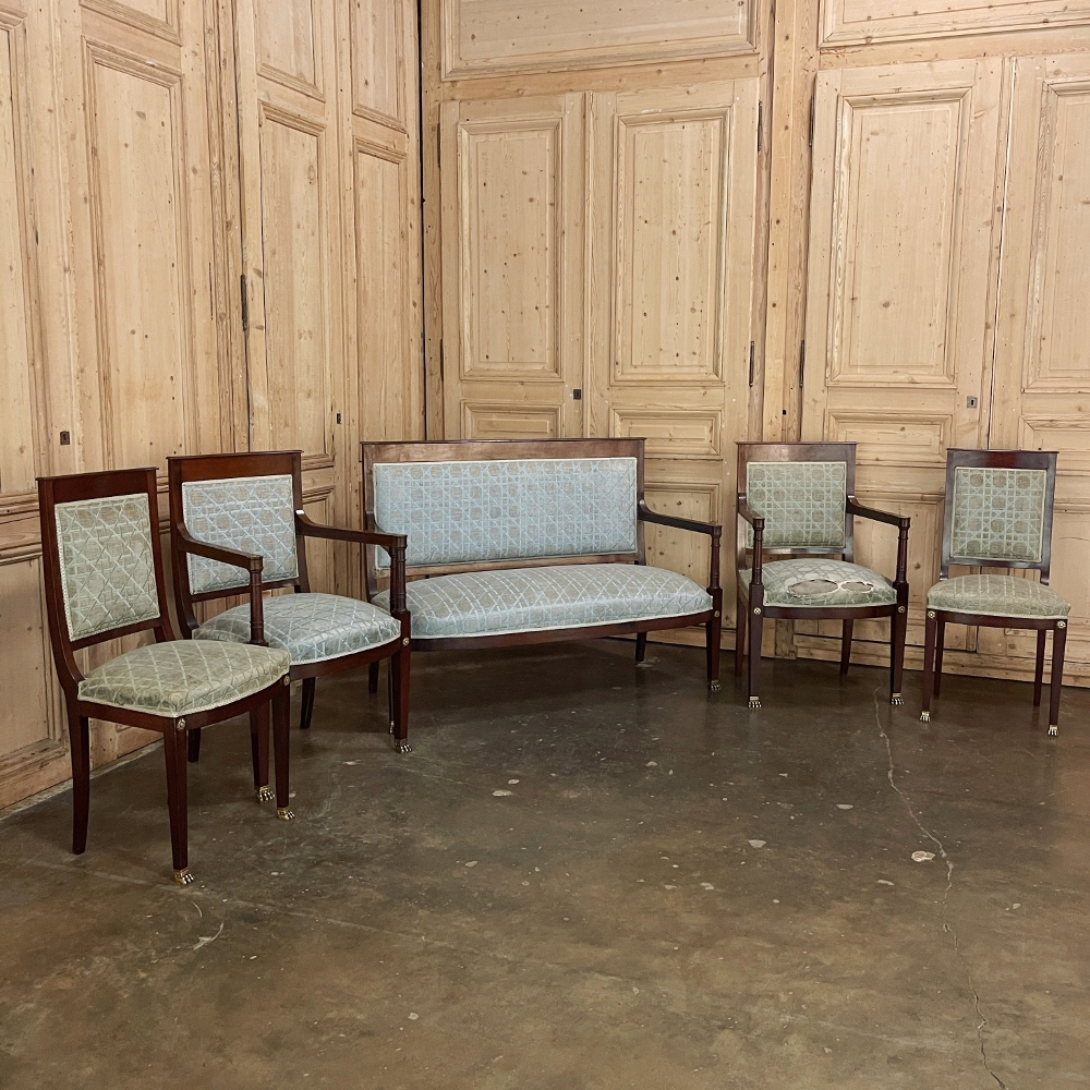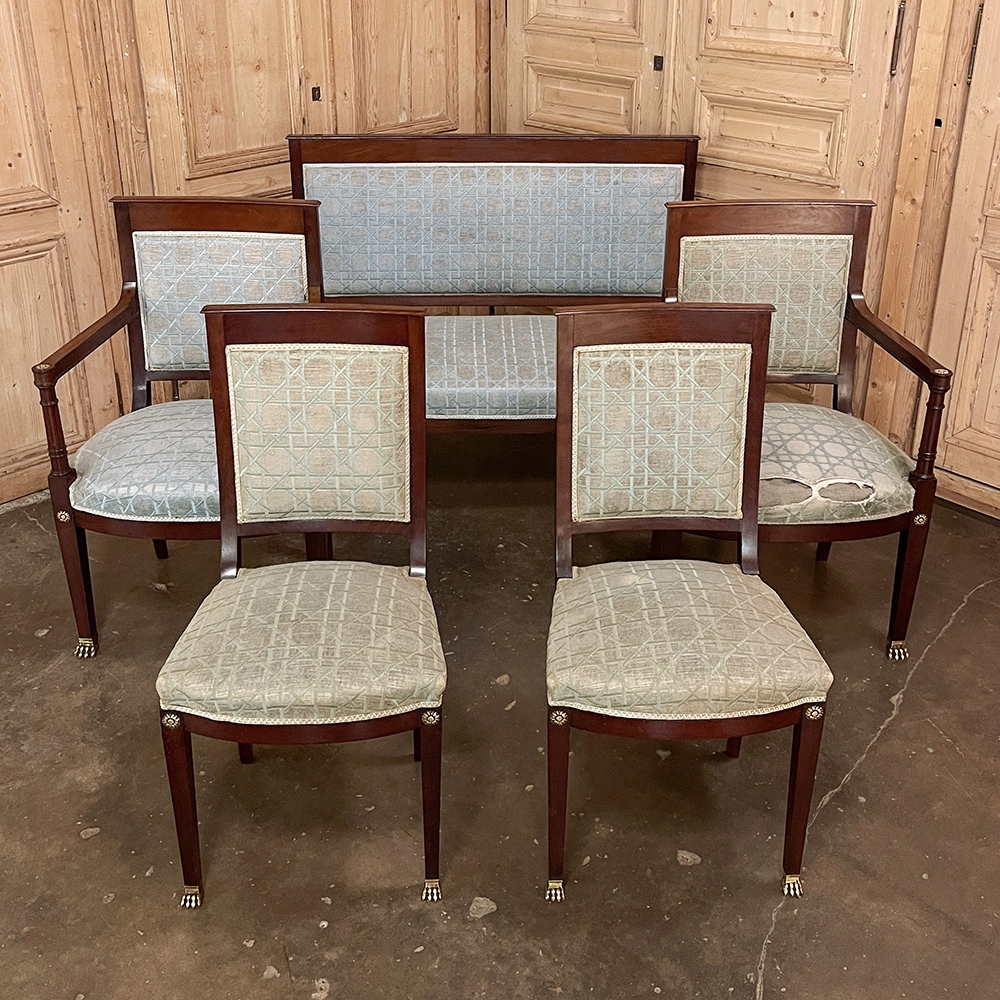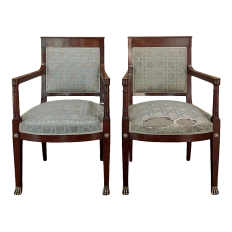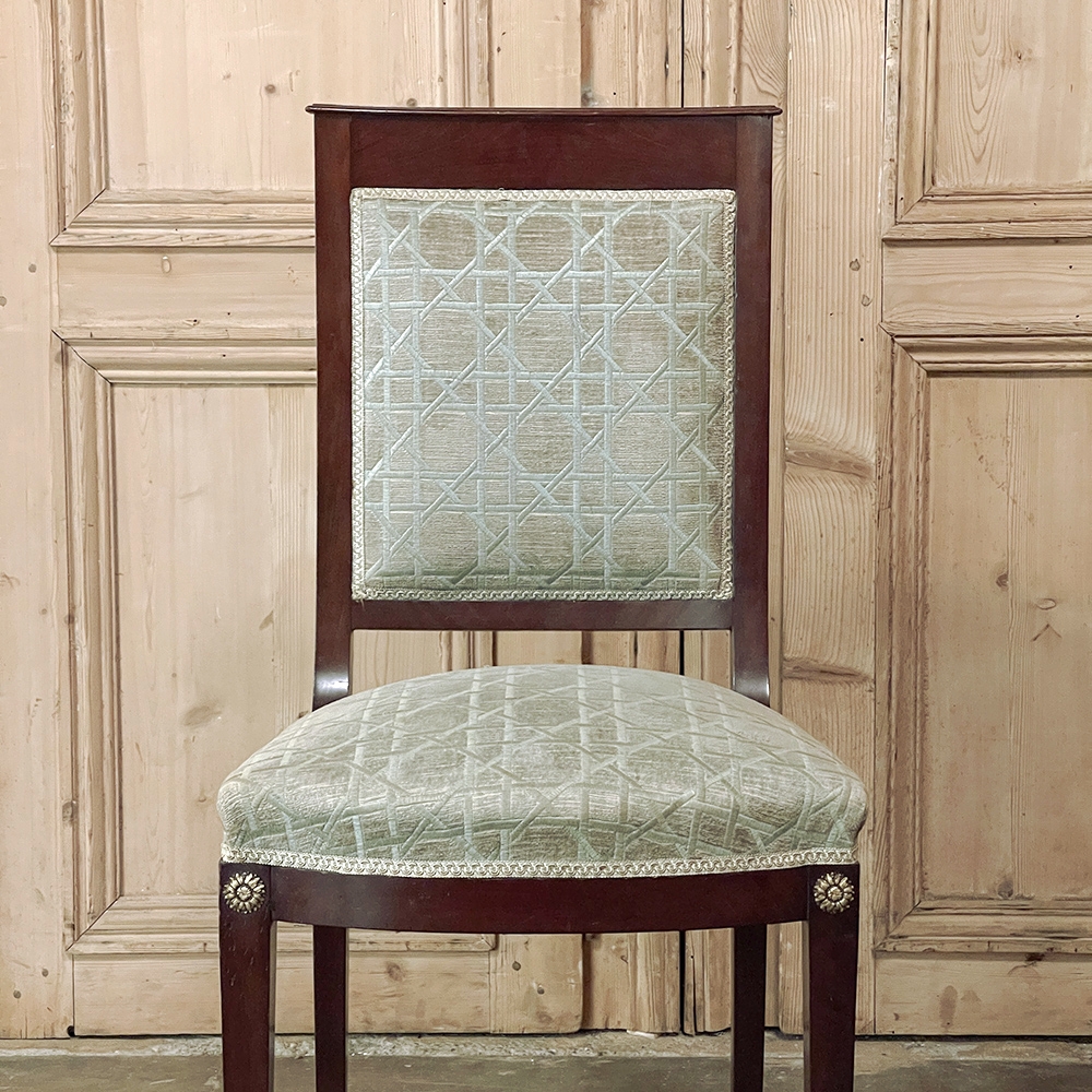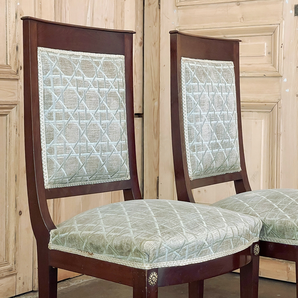SalePair 19th Century French Napoleon III Period Mahogany Chairs reflects the stately classically-inspired architecture of the ancients, accentuated by bronze castings of rosettes and lions' paw feet which contrast beautifully with the rich sumptuousness of the exotic imported mahogany frames. Upholstery is serviceable.