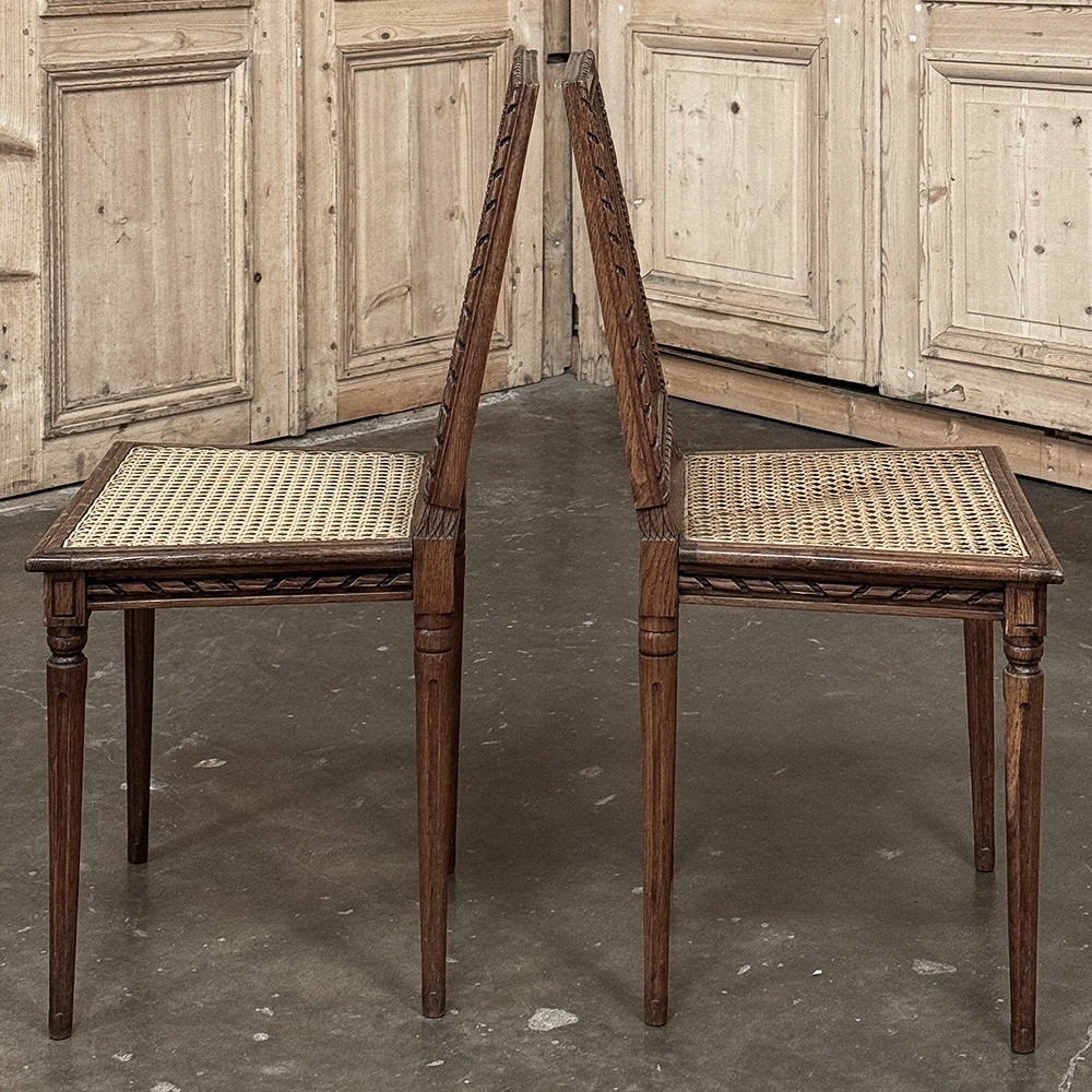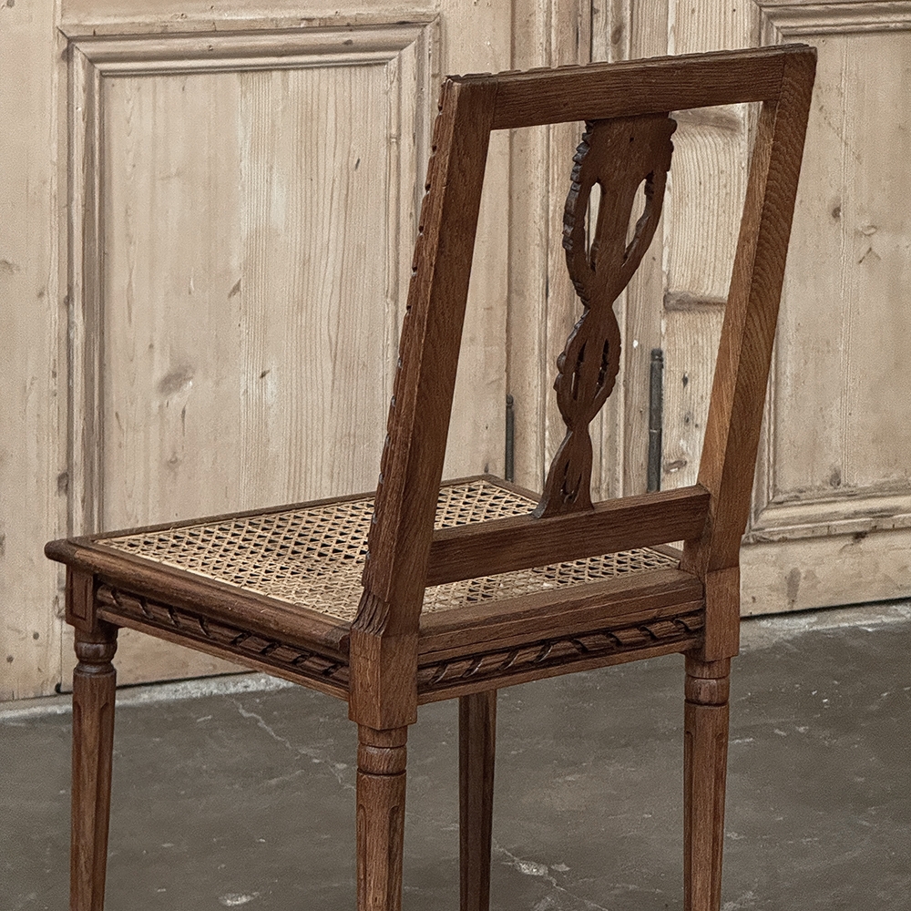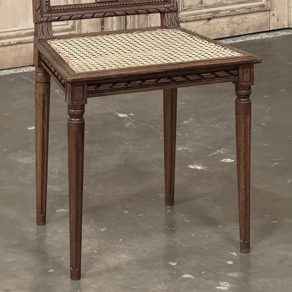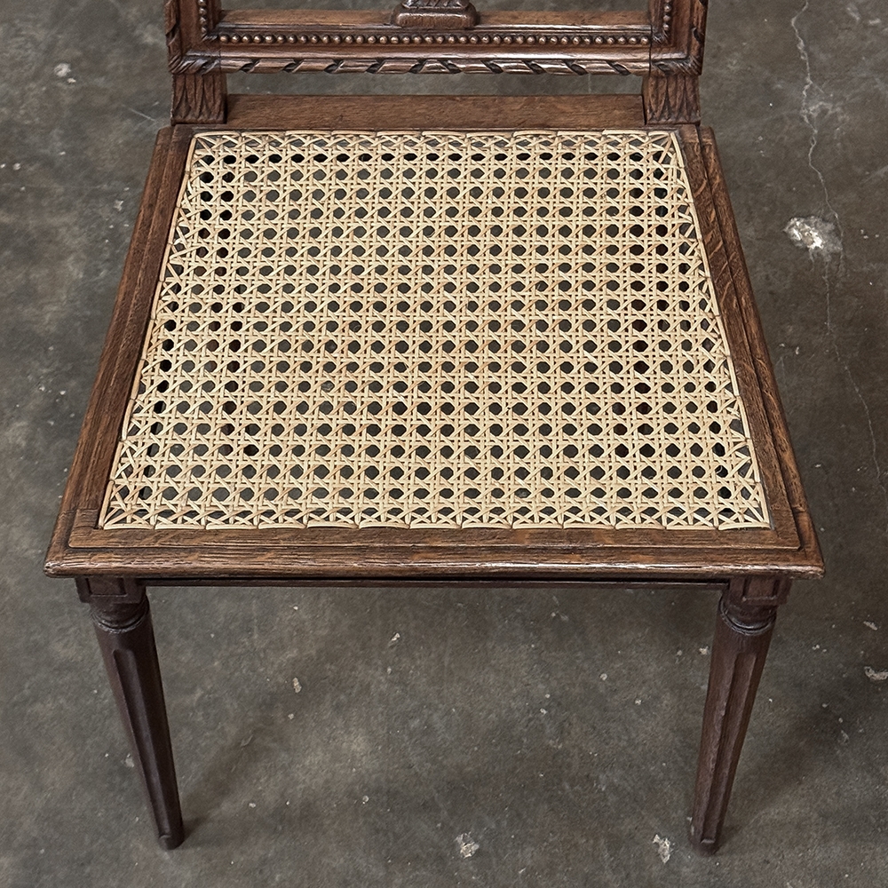 Antique French Louis XVI Caned Side Chair is a perfect choice for any occasional use, especially Southern climates where the caned seats really show their advantage of keeping cool. Framework is entirely constructed from solid oak, and features a rectilinear neoclassical architecture that includes four tapered and fluted legs supporting the caned seats, underneath which is a reinforcing apron all around carved with spiral ribbon bordering. Lotus blossom petals are carved into the transitions between the seat and seat backs, with the seat backs also treated to the same spiral ribbon bordering, and a beaded bordering inside that, similar to a frame around artwork. Of course, if you consider the sculptured back splat to be art, you would be correct, making the picture frame effect of the surroundings perfectly appropriate! Note that the back splats are not identical, either. Be sure to specify when calling in your order to 888-326-2390.
