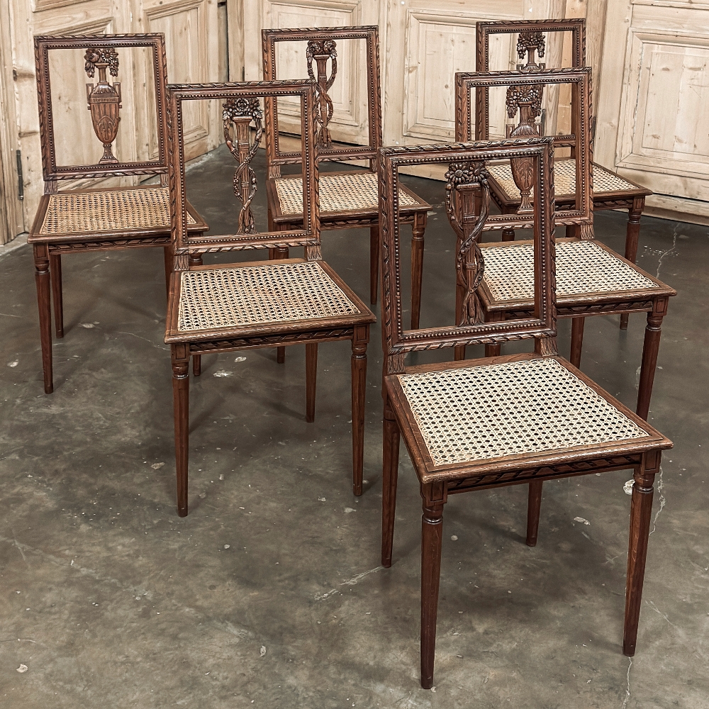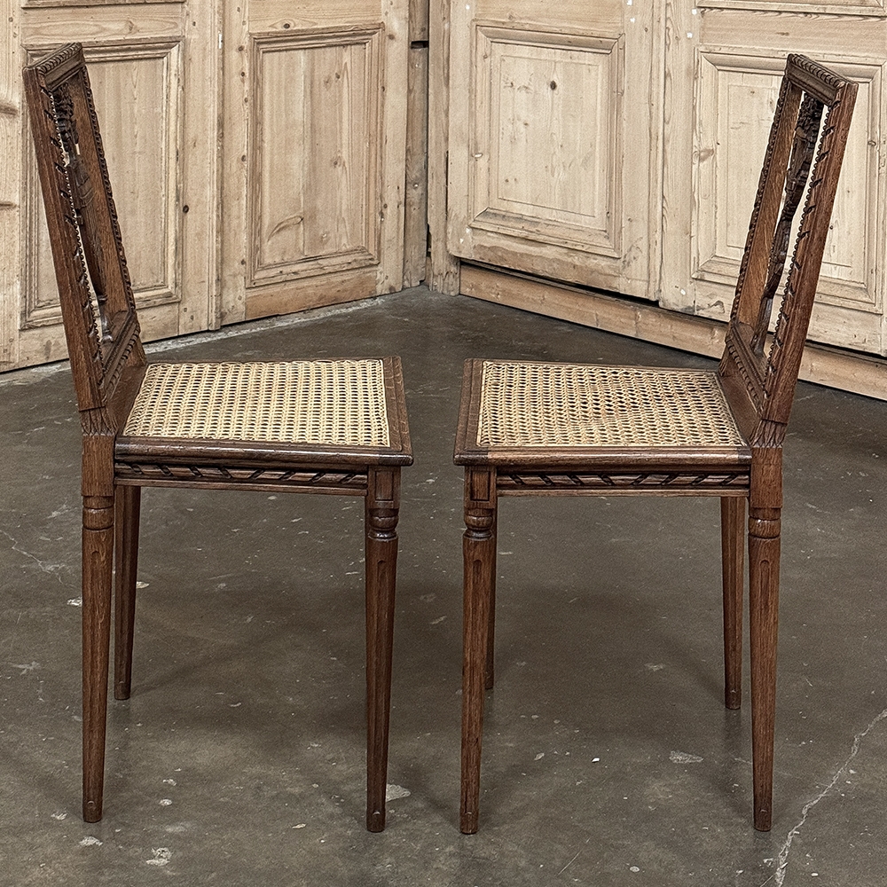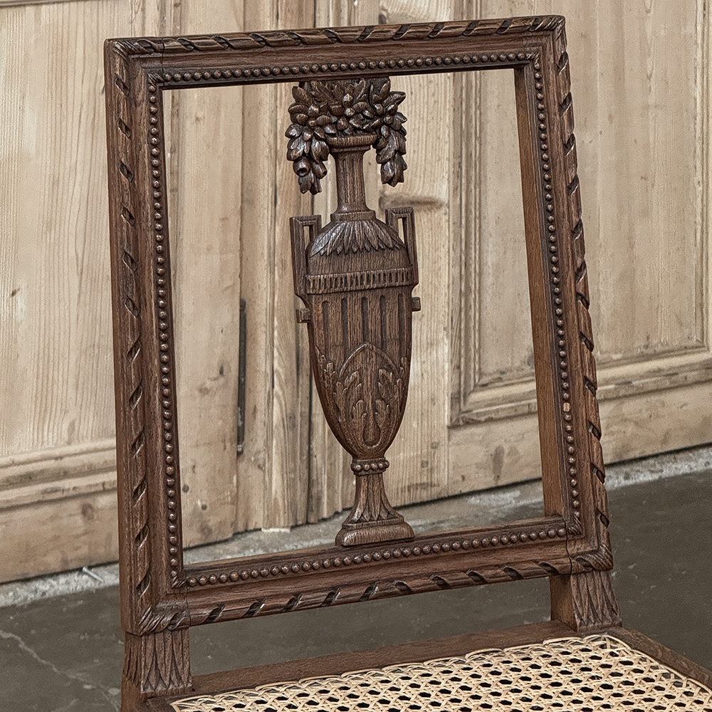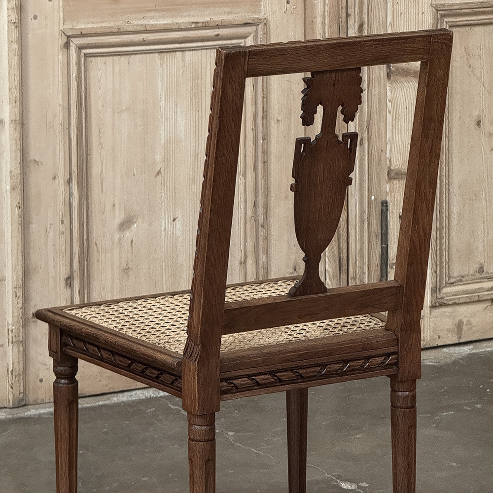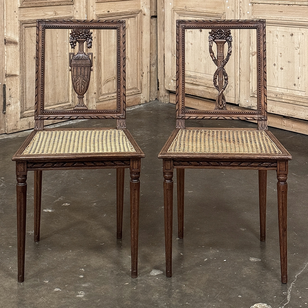 Antique French Louis XVI Caned Side Chair is a perfect choice for any occasional use, especially Southern climates where the caned seats really show their advantage of keeping cool. Framework is entirely constructed from solid oak, and features a rectilinear neoclassical architecture that includes four tapered and fluted legs supporting the caned seats, underneath which is a reinforcing apron all around carved with spiral ribbon bordering. Lotus blossom petals are carved into the transitions between the seat and seat backs, with the seat backs also treated to the same spiral ribbon bordering, and a beaded bordering inside that, similar to a frame around artwork. Of course, if you consider the sculptured back splat to be art, you would be correct, making the picture frame effect of the surroundings perfectly appropriate! Note that the back splats are not identical, either. Be sure to specify when calling in your order to 888-326-2390.