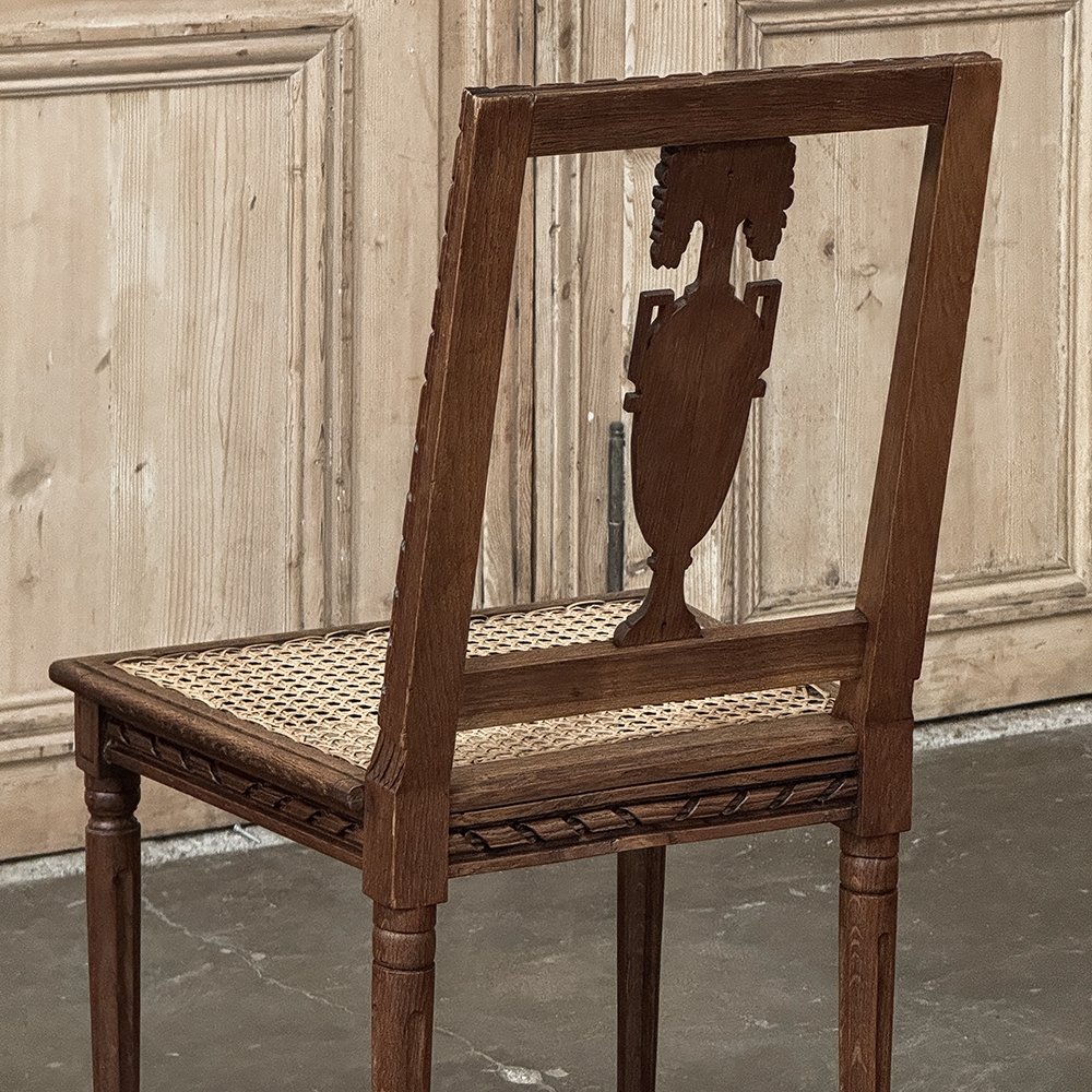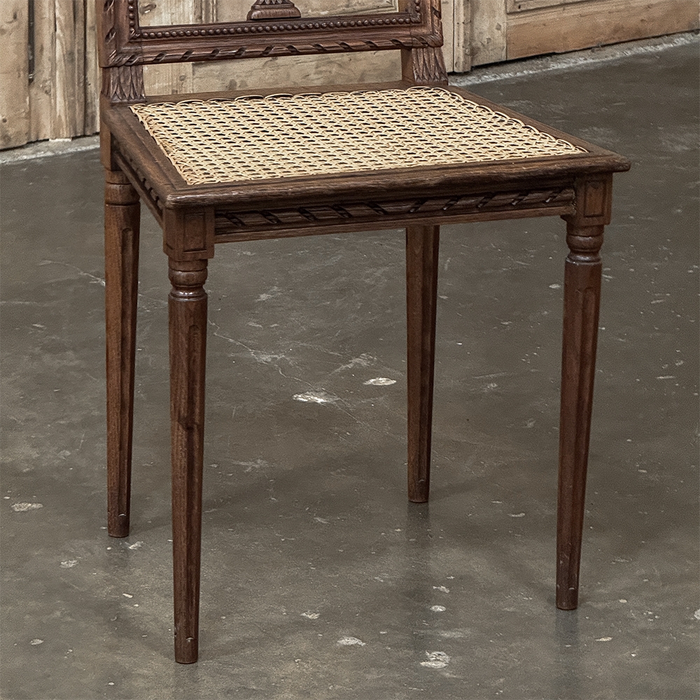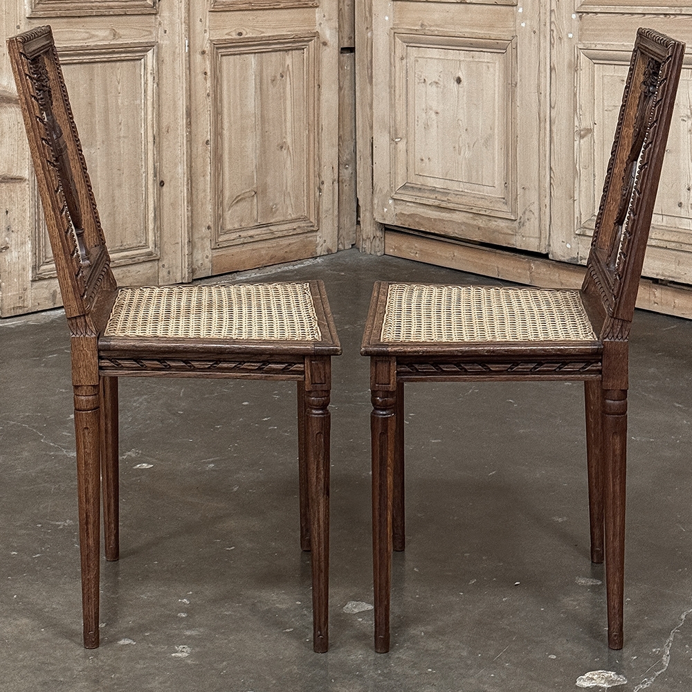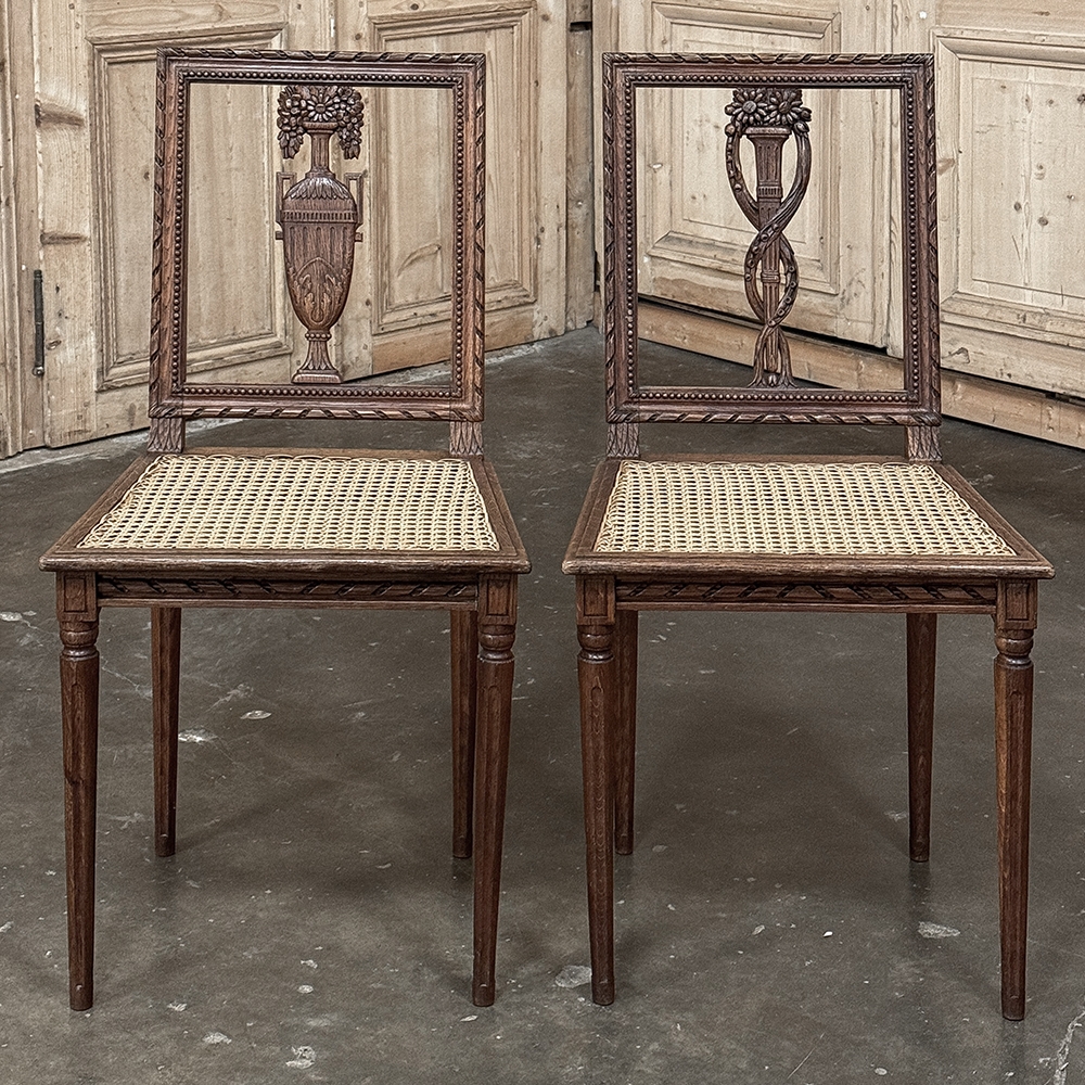 Antique French Louis XVI Caned Side Chair is a perfect choice for any occasional use, especially Southern climates where the caned seats really show their advantage of keeping cool. Framework is entirely constructed from solid oak, and features a rectilinear neoclassical architecture that includes four tapered and fluted legs supporting the caned seats, underneath which is a reinforcing apron all around carved with spiral ribbon bordering. Lotus blossom petals are carved into the transitions between the seat and seat backs, with the seat backs also treated to the same spiral ribbon bordering, and a beaded bordering inside that, similar to a frame around artwork. Of course, if you consider the sculptured back splat to be art, you would be correct, making the picture frame effect of the surroundings perfectly appropriate! Note that the back splats are not identical, either. Be sure to specify when calling in your order to 888-326-2390.