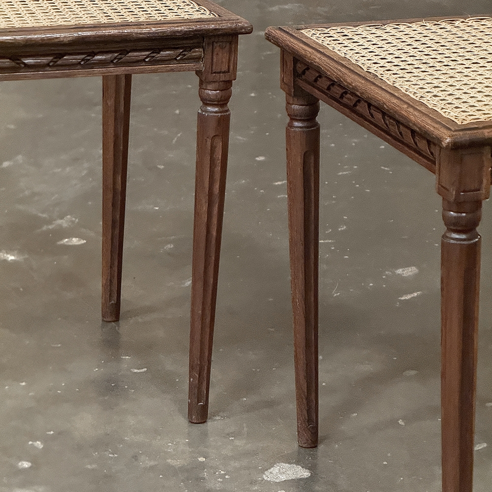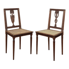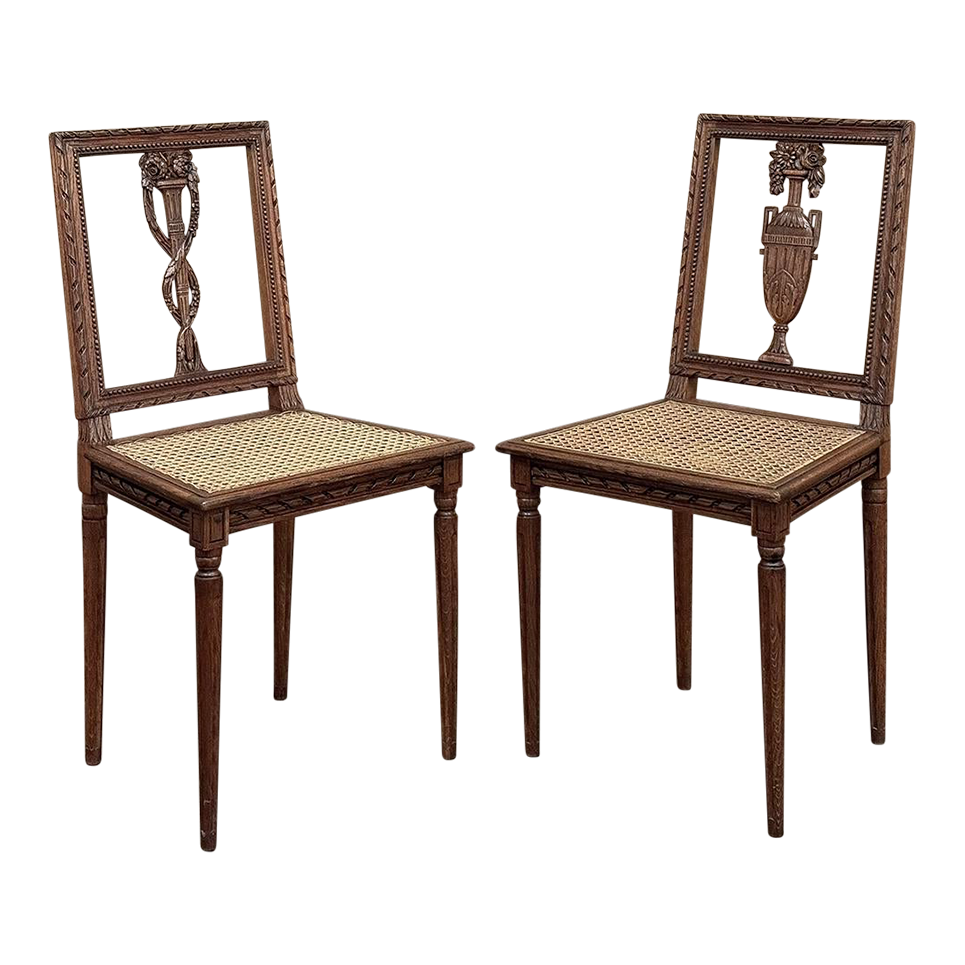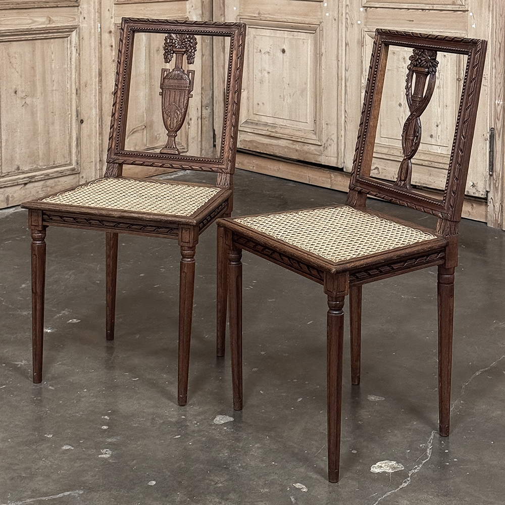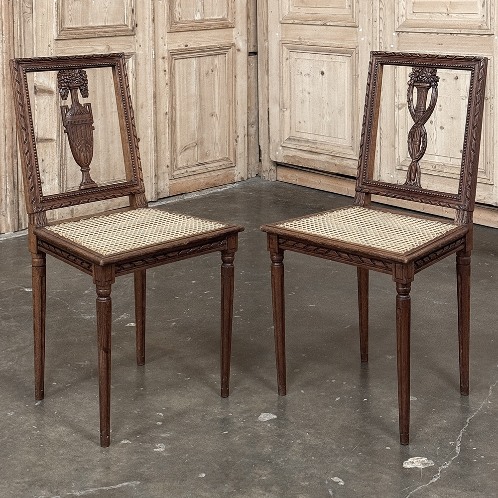 Antique French Louis XVI Caned Side Chair is a perfect choice for any occasional use, especially Southern climates where the caned seats really show their advantage of keeping cool. Framework is entirely constructed from solid oak, and features a rectilinear neoclassical architecture that includes four tapered and fluted legs supporting the caned seats, underneath which is a reinforcing apron all around carved with spiral ribbon bordering. Lotus blossom petals are carved into the transitions between the seat and seat backs, with the seat backs also treated to the same spiral ribbon bordering, and a beaded bordering inside that, similar to a frame around artwork. Of course, if you consider the sculptured back splat to be art, you would be correct, making the picture frame effect of the surroundings perfectly appropriate! Note that the back splats are not identical, either. Be sure to specify when calling in your order to 888-326-2390.