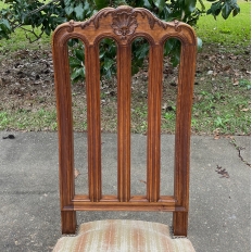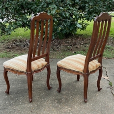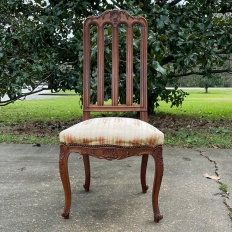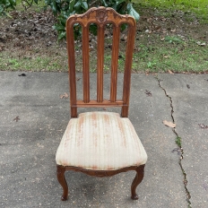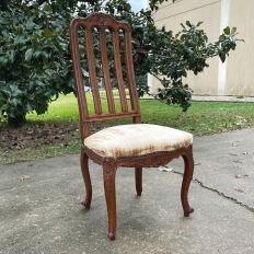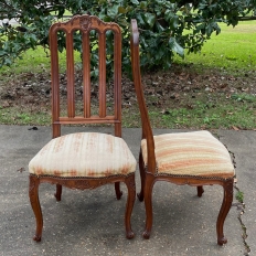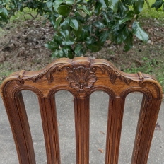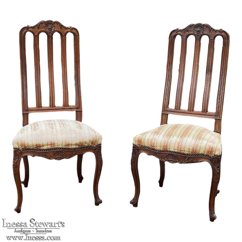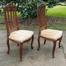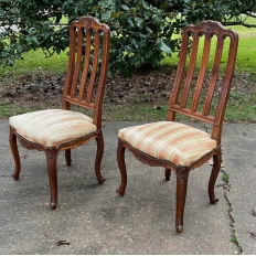 Pair Antique Liegoise Louis XIV Side Chairs feature the graceful lines that are exceptionally ergonomic, designed before the word "ergonomic" had even been coined! High, S-curved seatbacks with vertical slats conform to one's back in comfort, without horizontal ridges at all in the design. Generous seat flares out with a trapezoidal shape, again, for comfort. Triple arched seatback crown and undulations of the apron below, as well as the elegant cabriole legs are all carved with handsome shell and foliate motifs for a classic, timeless look. Ideal as extra chairs for any room, including when guests arrive for dinner!