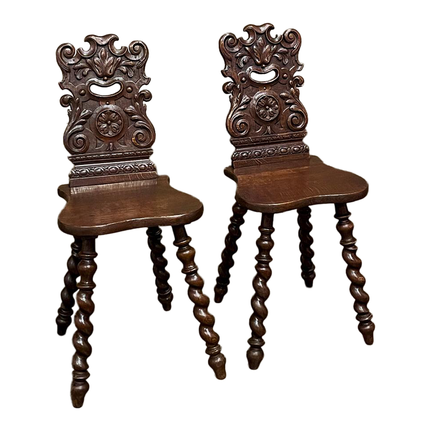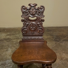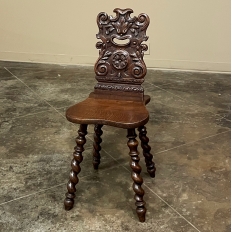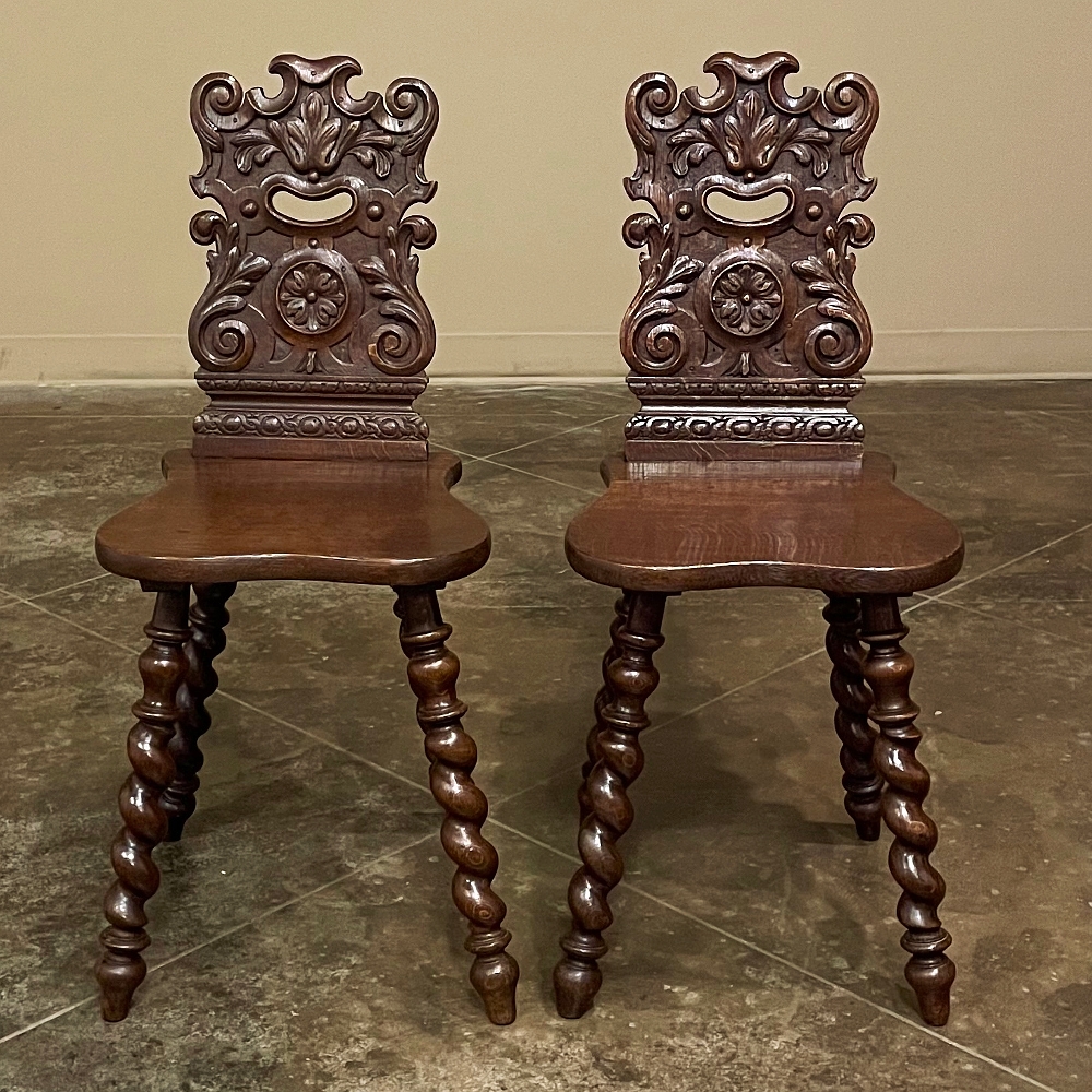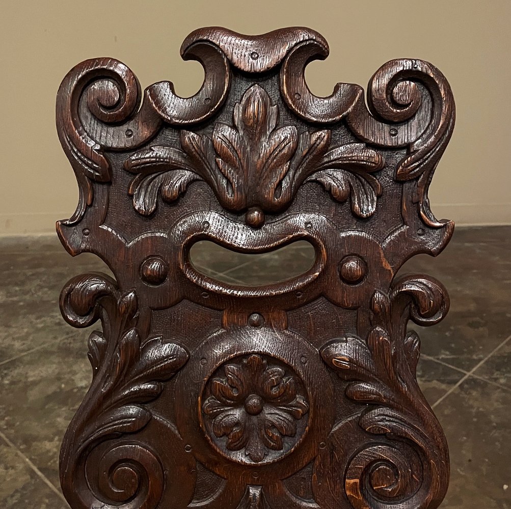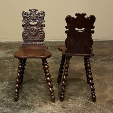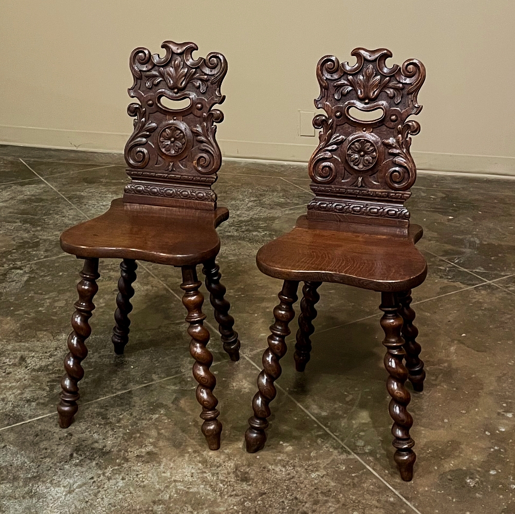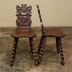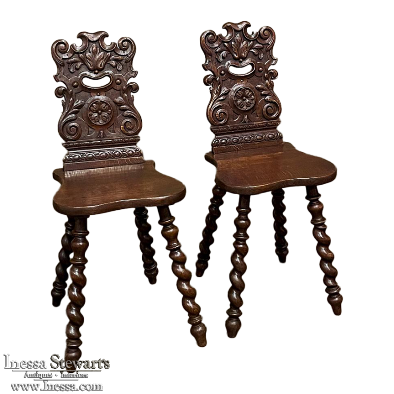 SalePair Dutch Renaissance Side Chairs are perfect for an Old World touch, and feature solid plank shield-shaped seats supported by four barley twist column legs. The real eye-catcher, though, is the artfully sculpted seatbacks with an intriguing naturalistic sculpture depicting foliates in many guises, and a wonderfully scrolled overall form. The hole cut into the seatback is a hand-grip allowing one to easily pick up and move the chair around the room Ingenious!