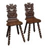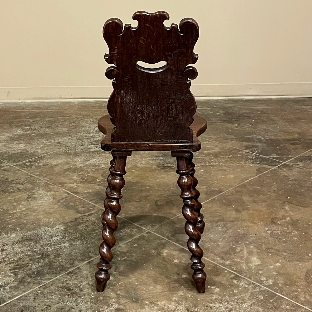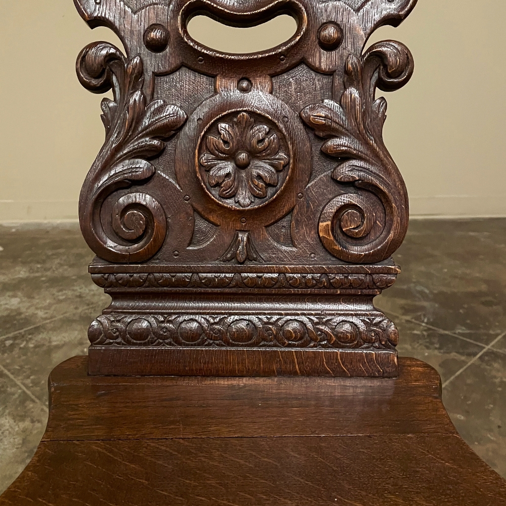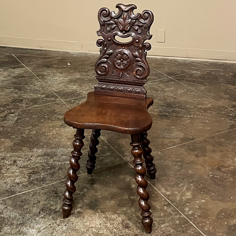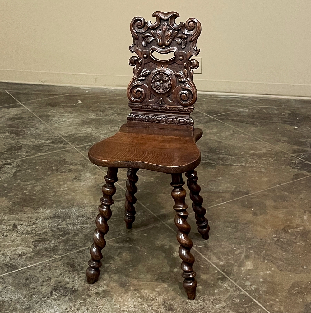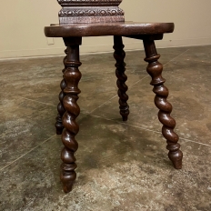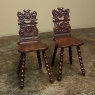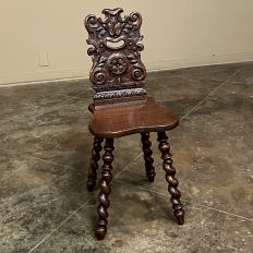 SalePair Dutch Renaissance Side Chairs are perfect for an Old World touch, and feature solid plank shield-shaped seats supported by four barley twist column legs. The real eye-catcher, though, is the artfully sculpted seatbacks with an intriguing naturalistic sculpture depicting foliates in many guises, and a wonderfully scrolled overall form. The hole cut into the seatback is a hand-grip allowing one to easily pick up and move the chair around the room Ingenious!