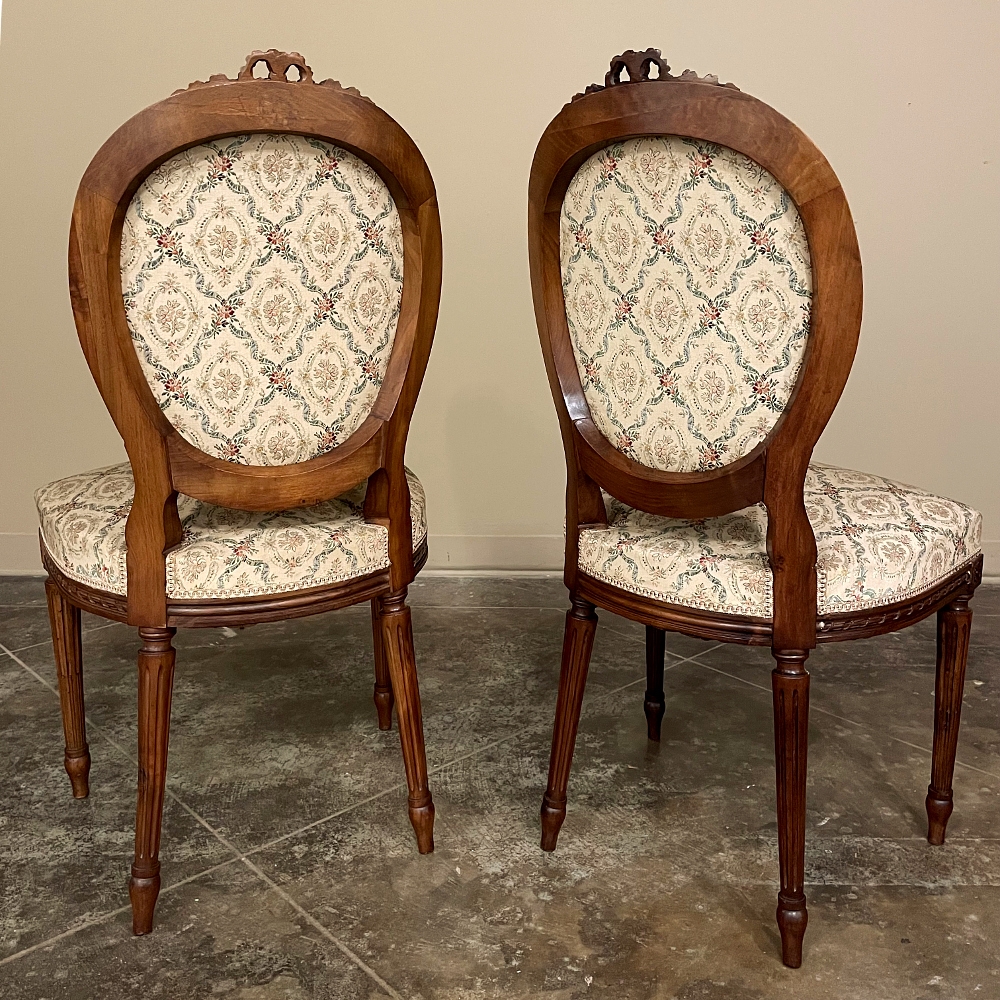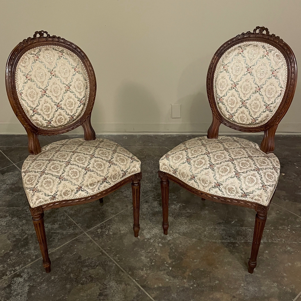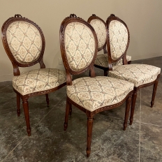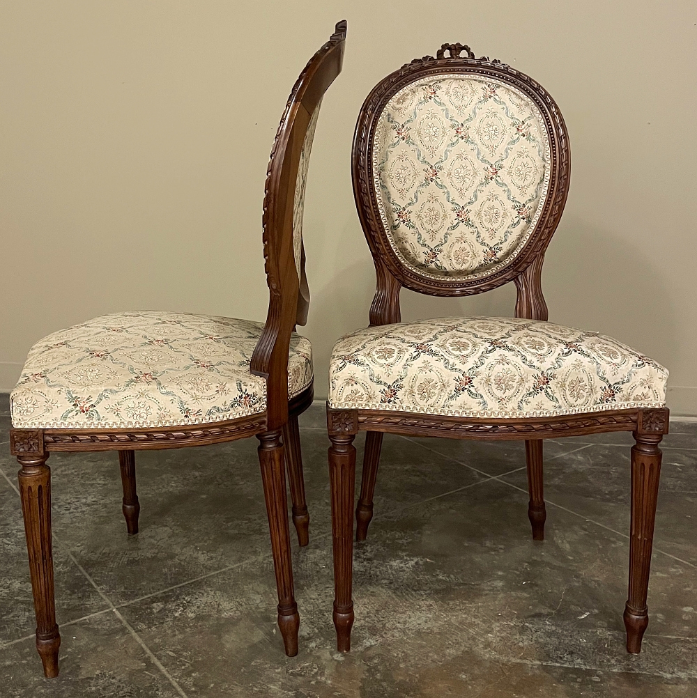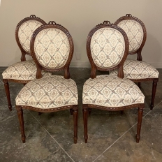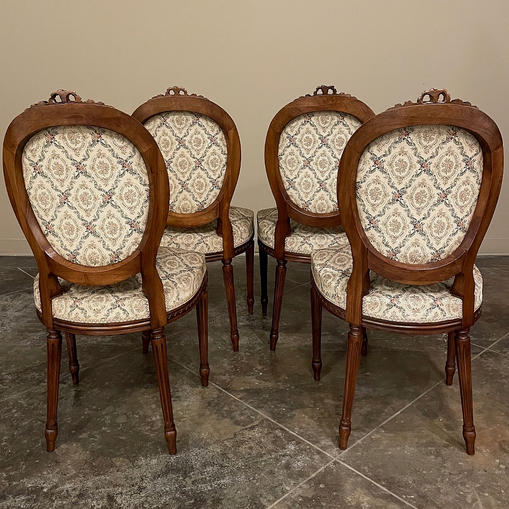 Set of Four 19th Century French Louis XVI Walnut Chairs is truly a timeless classic! Featuring curved oval seatbacks and generous seats, the set offers surprising comfort, and the very high quality of the upholstery ensures decades of enjoyment with a modicum of care. The frames are works of the furniture-maker's art with fine sculpted details appearing over the entire facade. Flowing ribbon appears at the crown of the seatback, cascading onto the frame, the entirety of which is carved with spiral ribbon and beading. Spiral ribbon motif is again used on the apron, punctuated by the plinth blocks carved with rosettes upon which the tapered and fluted legs are affixed. An incredible, timeless combination perfect for providing the finishing touches on your decor!