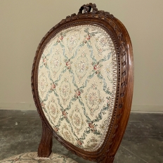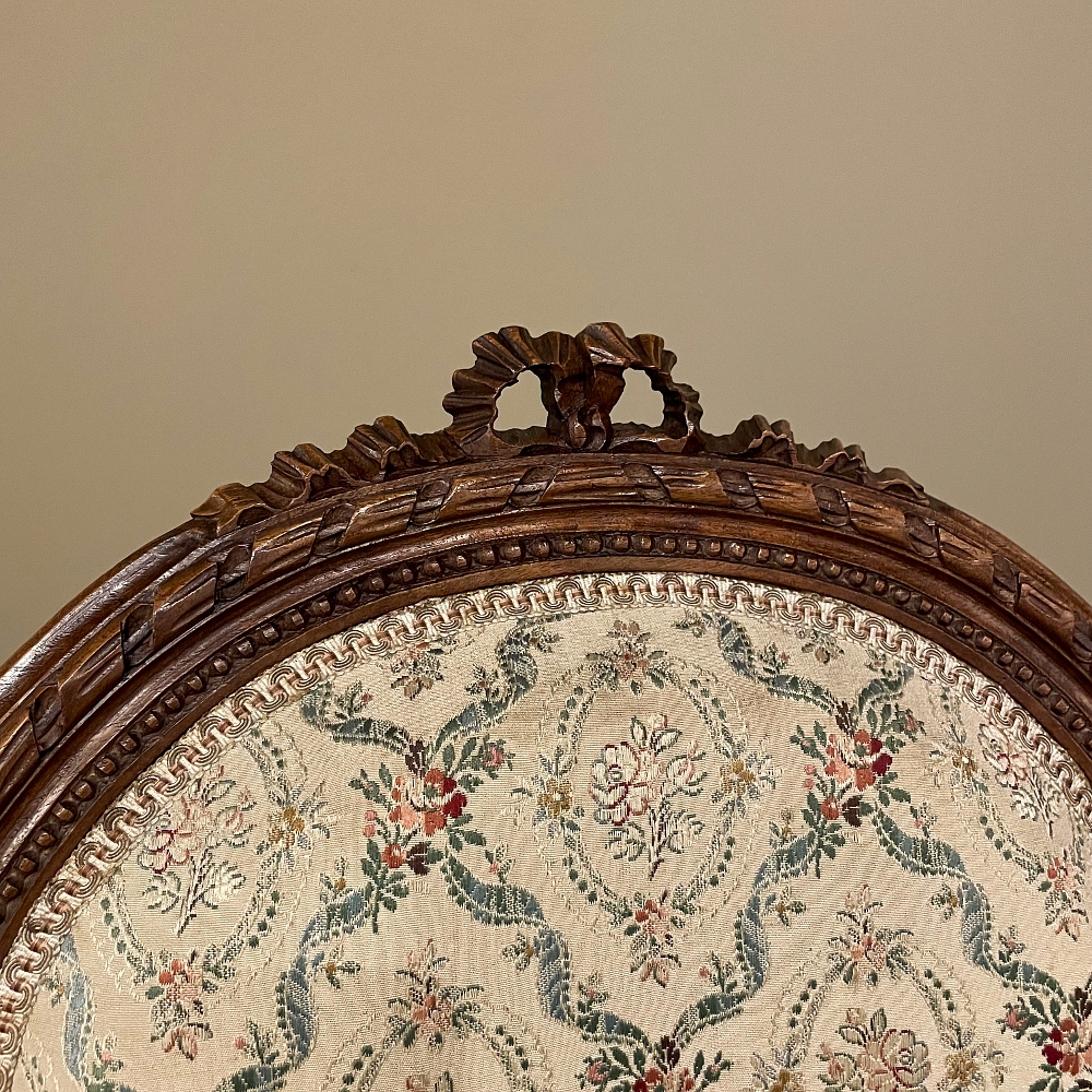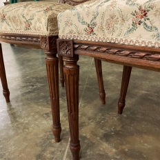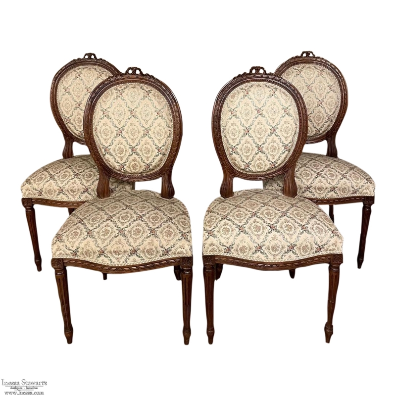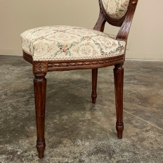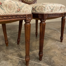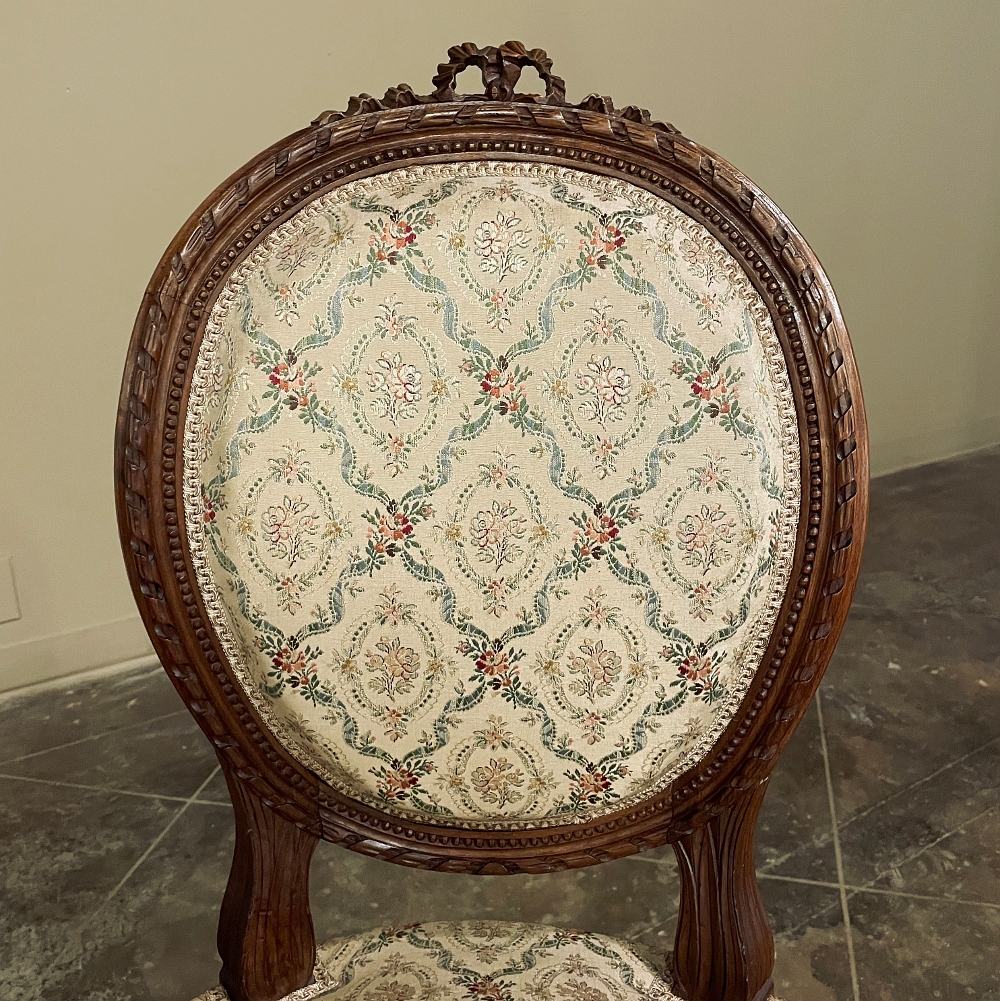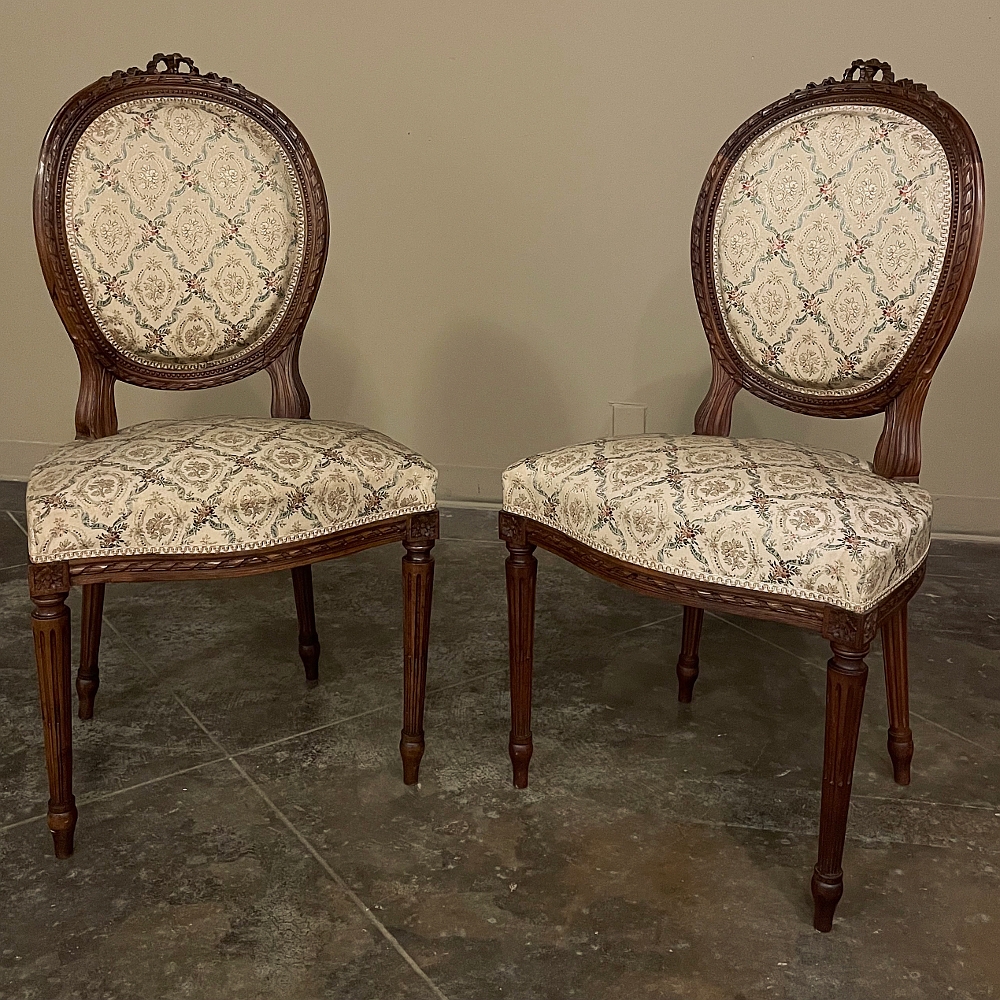 Set of Four 19th Century French Louis XVI Walnut Chairs is truly a timeless classic! Featuring curved oval seatbacks and generous seats, the set offers surprising comfort, and the very high quality of the upholstery ensures decades of enjoyment with a modicum of care. The frames are works of the furniture-maker's art with fine sculpted details appearing over the entire facade. Flowing ribbon appears at the crown of the seatback, cascading onto the frame, the entirety of which is carved with spiral ribbon and beading. Spiral ribbon motif is again used on the apron, punctuated by the plinth blocks carved with rosettes upon which the tapered and fluted legs are affixed. An incredible, timeless combination perfect for providing the finishing touches on your decor!