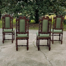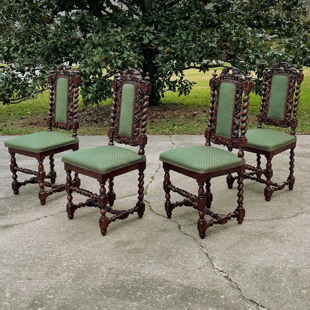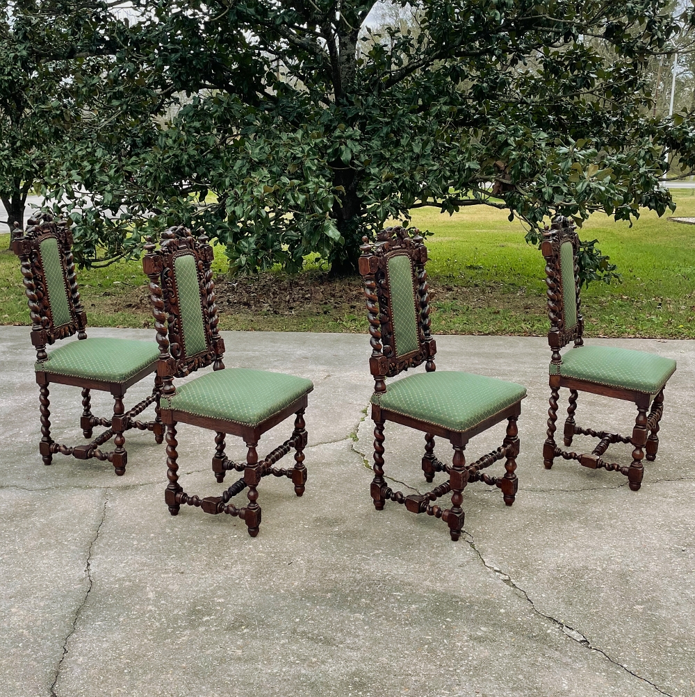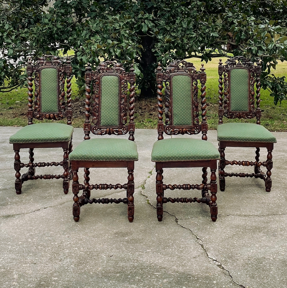 Set of Four 19th Century French Renaissance Barley Twist Chairs are perfect for a cozy breakfast nook, a wine room, or just to spread about the home or office for occasional use! Hand-carved from dense, old-growth oak, each features an incredible grapevine motif sculpted to frame the seatback cushion, which in turn is flanked by clockwise and counter-clockwise barley twist columns. The barley twist motif continues in vertical and horizontal form on the support structure under the fully upholstered seats. The upholstery itself has been recently applied, and is of a very high quality fabric with a subtle, pastel green tone. Timeless!