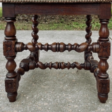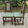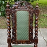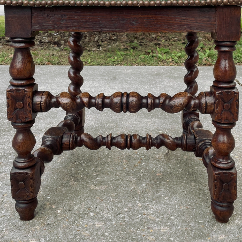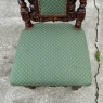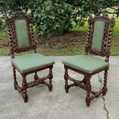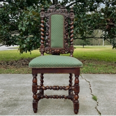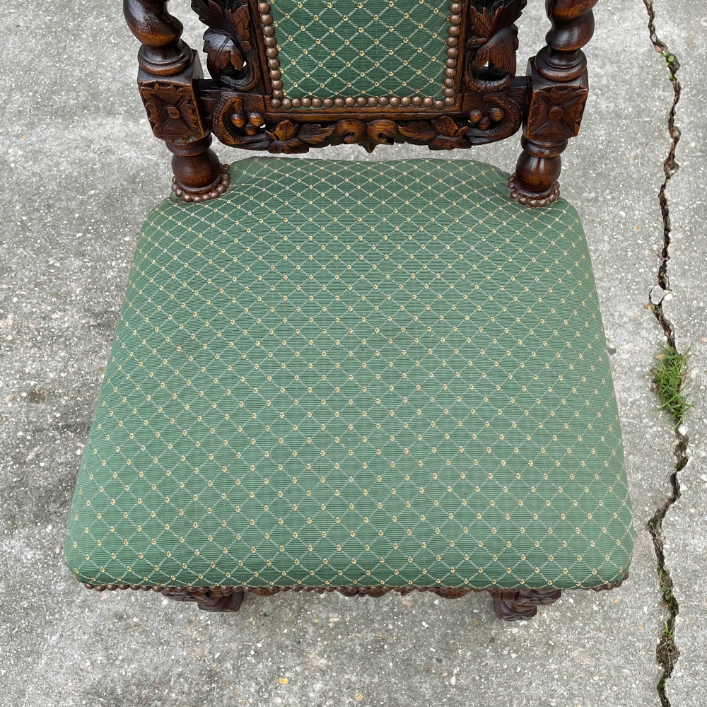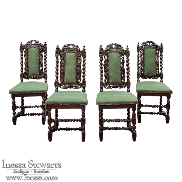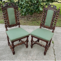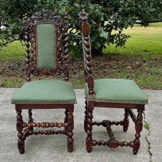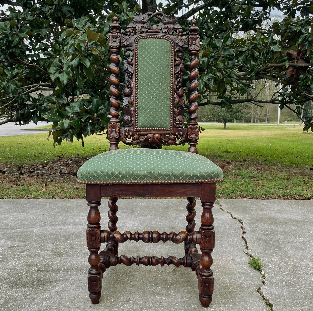Set of Four 19th Century French Renaissance Barley Twist Chairs are perfect for a cozy breakfast nook, a wine room, or just to spread about the home or office for occasional use! Hand-carved from dense, old-growth oak, each features an incredible grapevine motif sculpted to frame the seatback cushion, which in turn is flanked by clockwise and counter-clockwise barley twist columns. The barley twist motif continues in vertical and horizontal form on the support structure under the fully upholstered seats. The upholstery itself has been recently applied, and is of a very high quality fabric with a subtle, pastel green tone. Timeless!