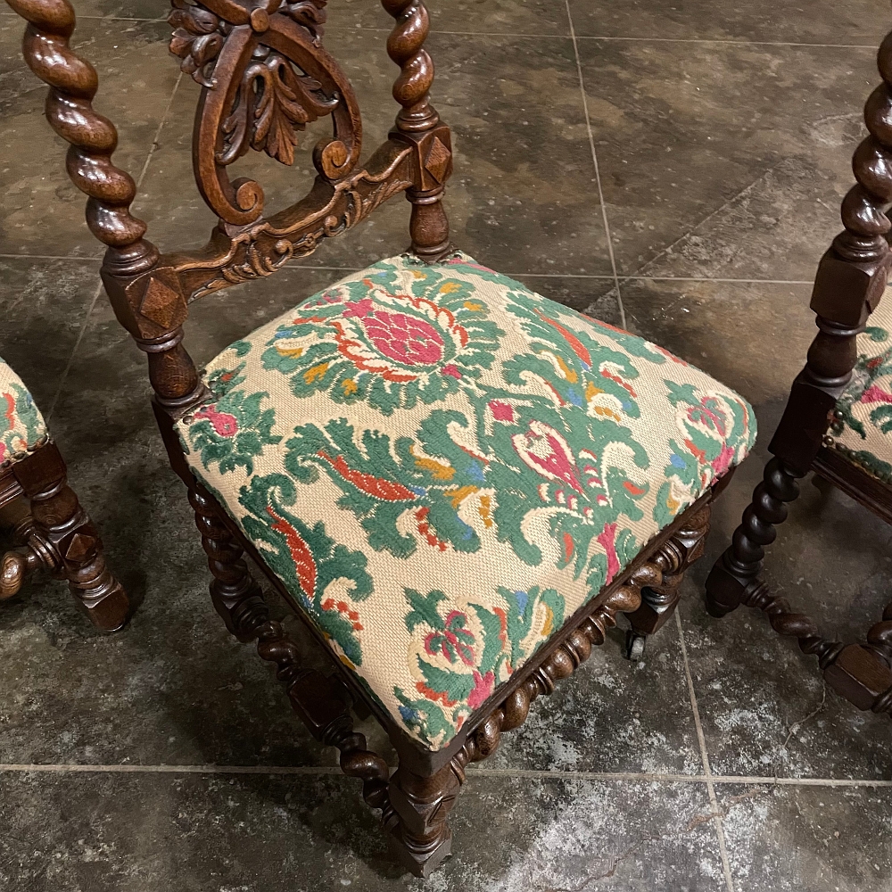 Set of four 19th century Renaissance Revival side chairs crafted in solid oak and conceived as part of the same Louis XIII style parlor suite as the matching sofa and armchairs. Their sculptural silhouettes are defined by spiral barley twist legs and stretchers, carved crest rails, and pierced backs with scrolling Renaissance ornament consistent throughout the ensemble.