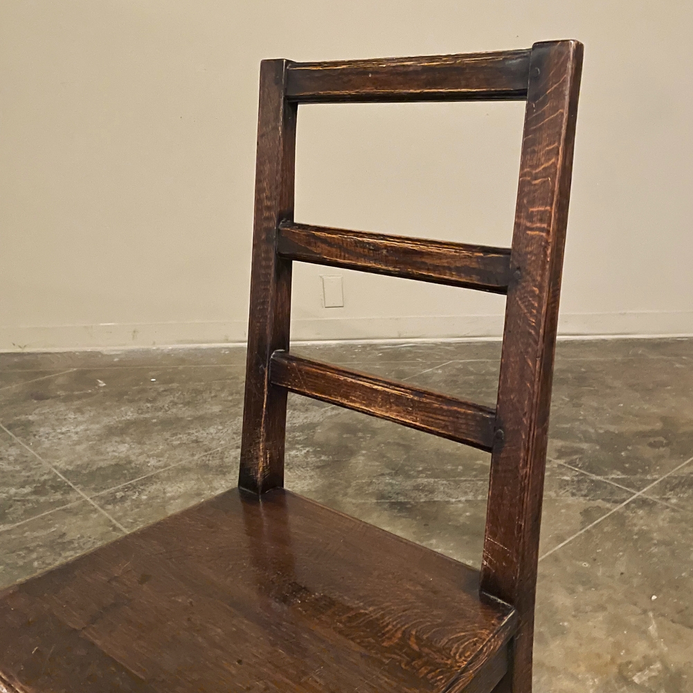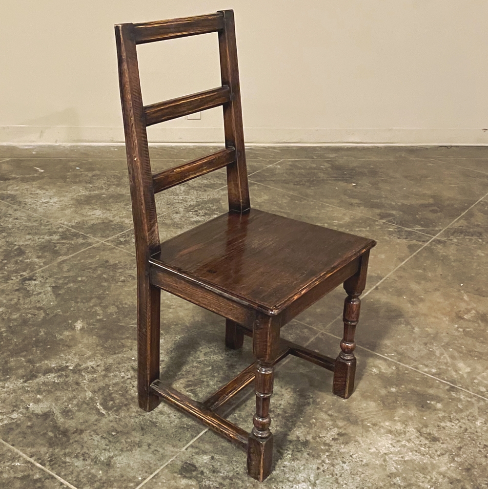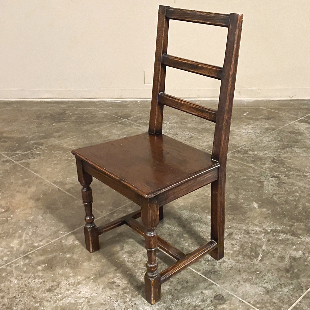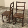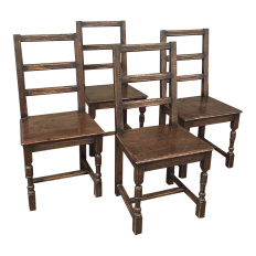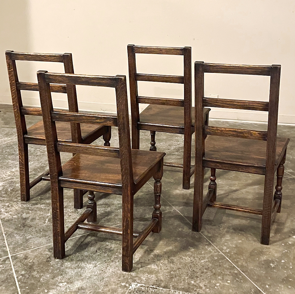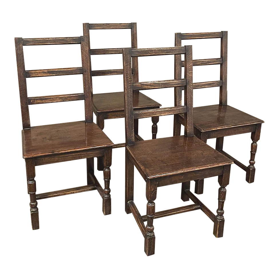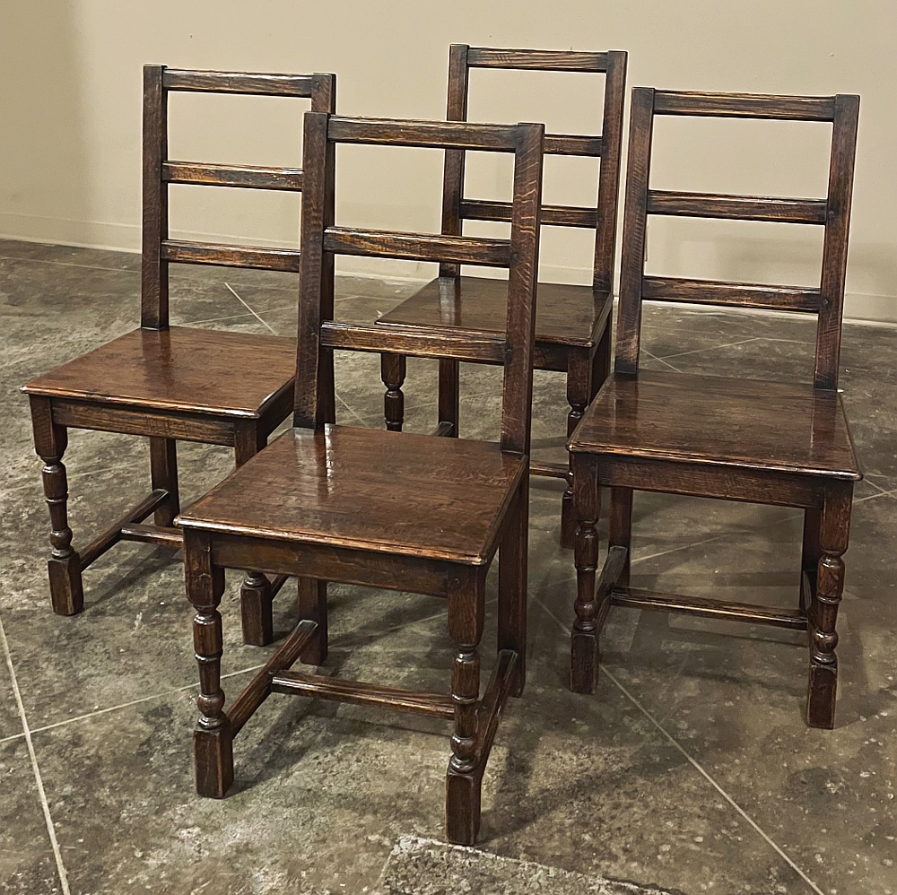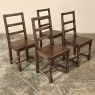Set of Four Rustic 18th Country French Chairs work great as breakfast room chairs, around a game table, or just for occasional use throughout a casual decor. Hand-made from solid oak, each features solid plank seats which were designed for tie-on cushions coordinated with your interior fabrics and colors. Simple slat back design and sturdy turned legs in front combined with single uprights from the floor to the top of the seatback which are connected with an "H" stretcher below combine to create sturdiness that you'll enjoy for decades to come.