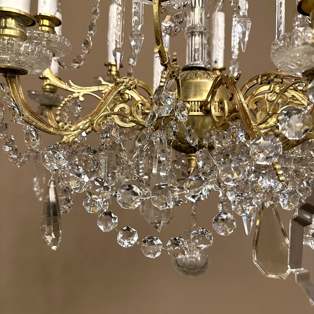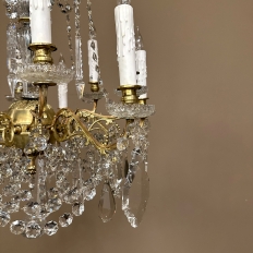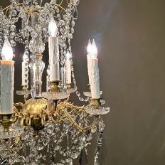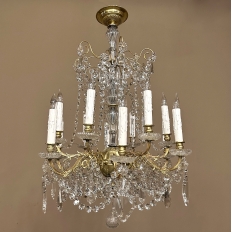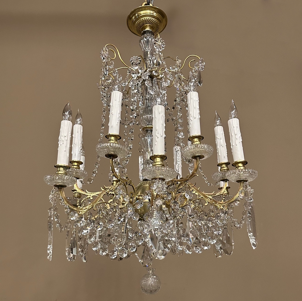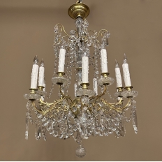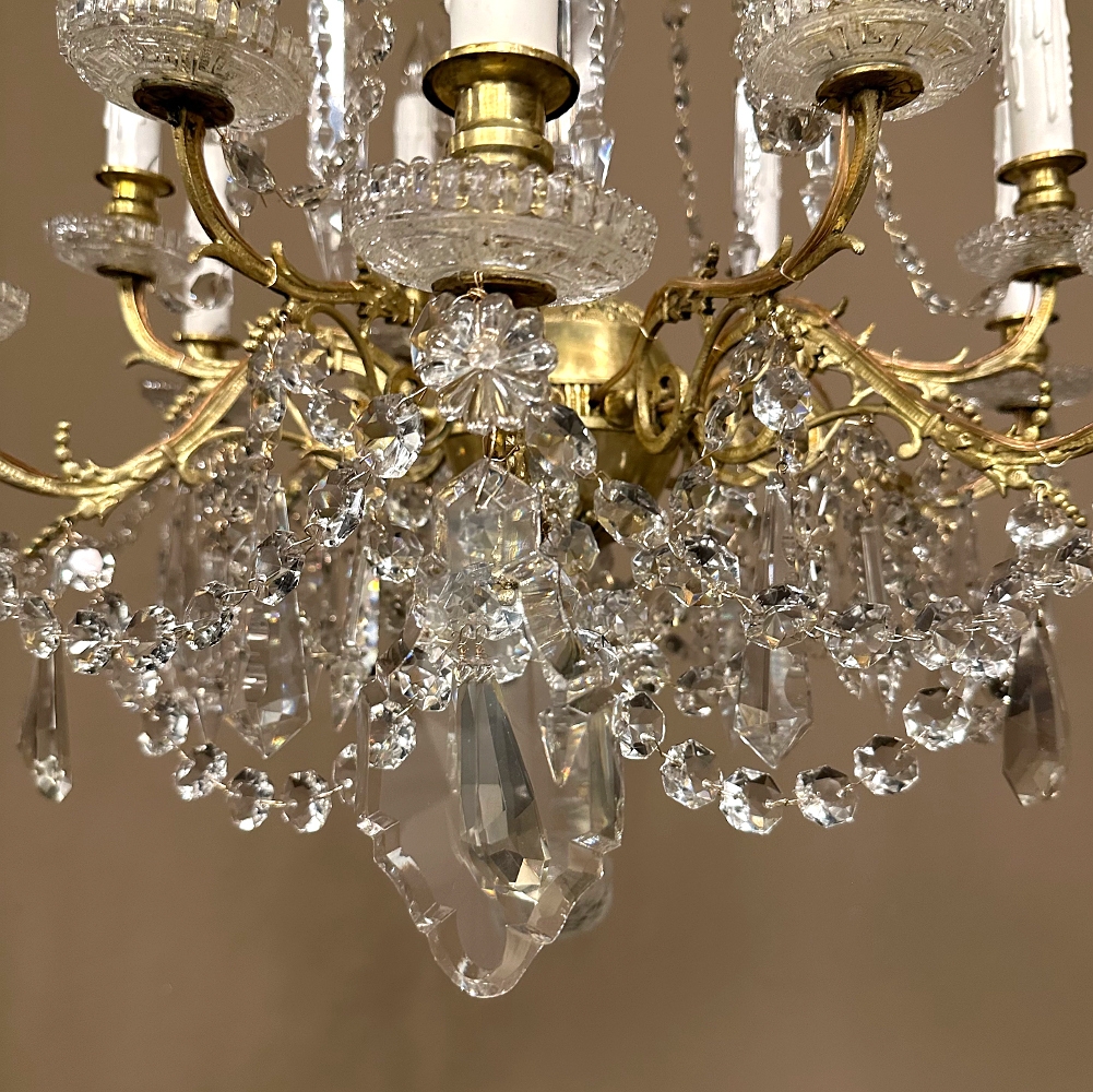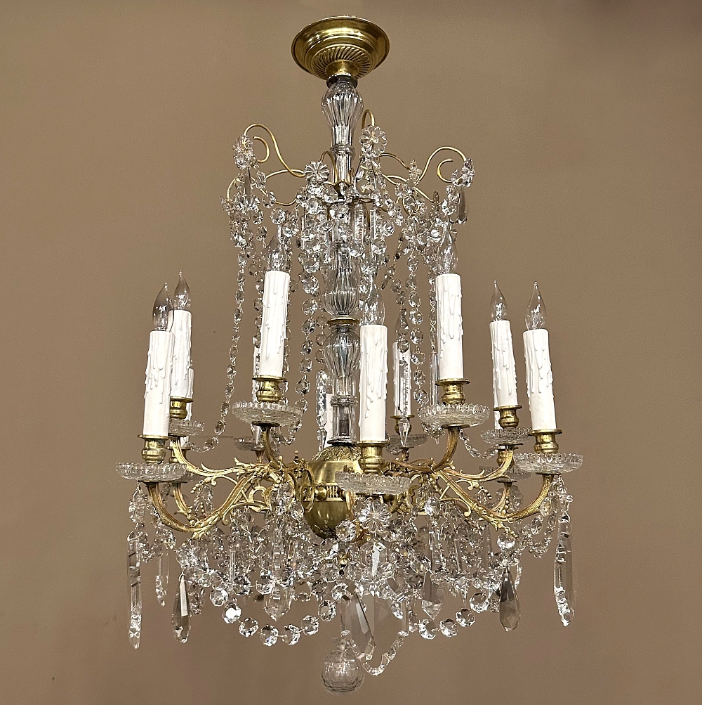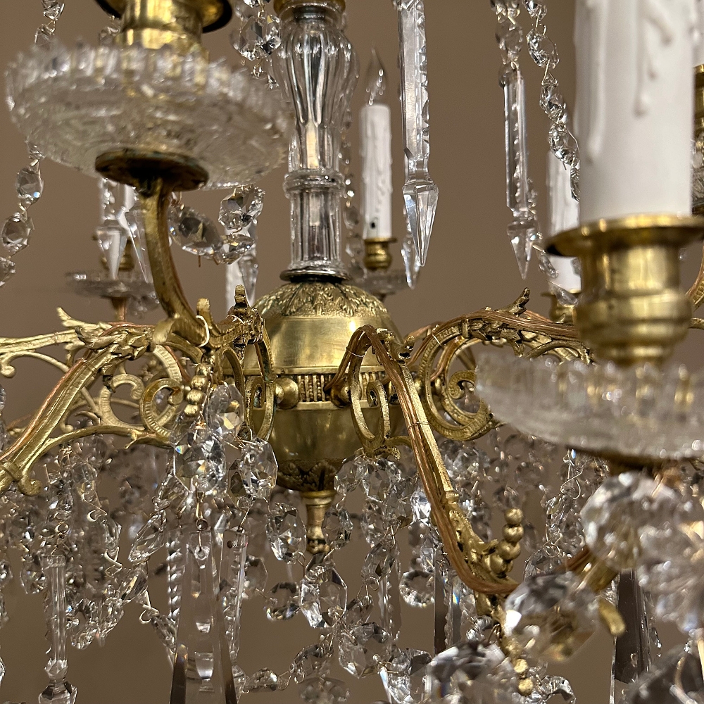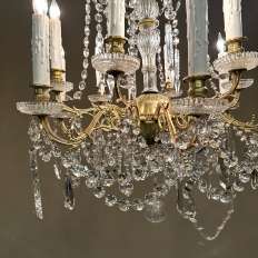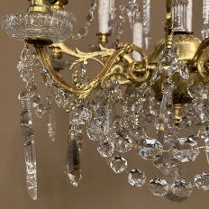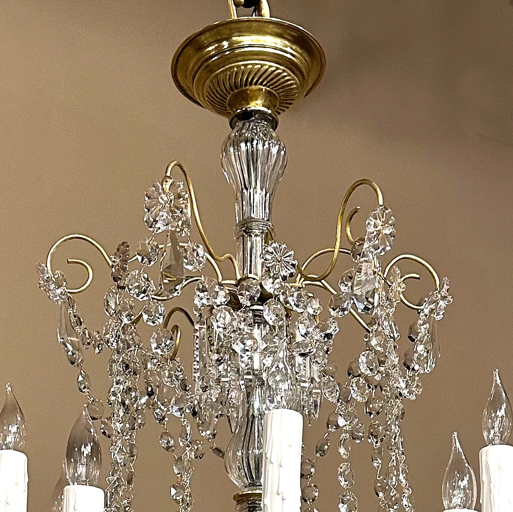 Antique French Louis XIV Brass & Crystal Chandelier will make any room sparkle with opulence! Crafted from finely embossed and cast brass, it features an intricately designed body that includes naturalistic foliates on the elegantly scrolled arms. The central shaft is a combination of brass and fluted crystal, leading the eye down to the faceted ball at the bottom. In between, a combination of faceted round crystals arranged in swags, rosettes, flat beveled crystals in various shapes, and even crystal bobeches under the realistic-looking candle sleeve covers, all included of course! Painstakingly and professionally wired to US Standards, it is poised to create a central focal point for your favorite room.