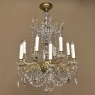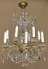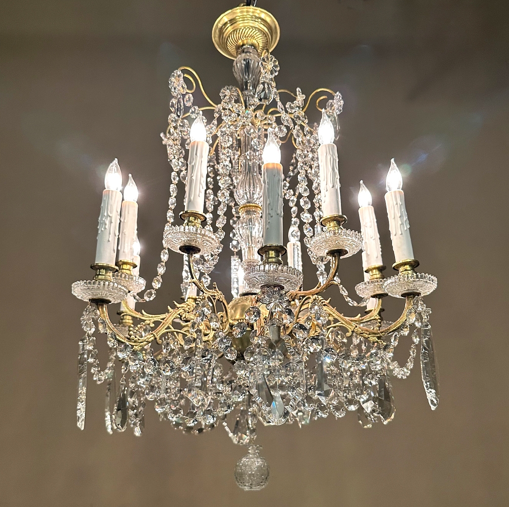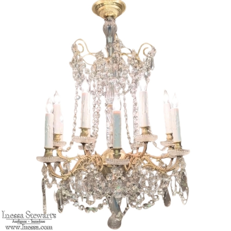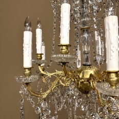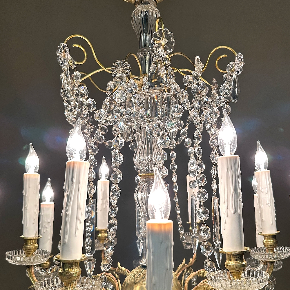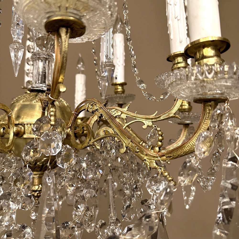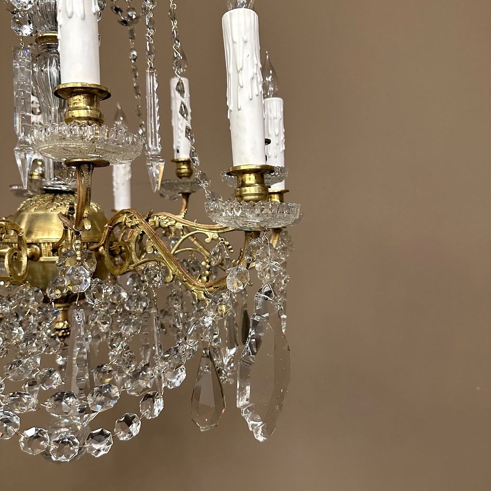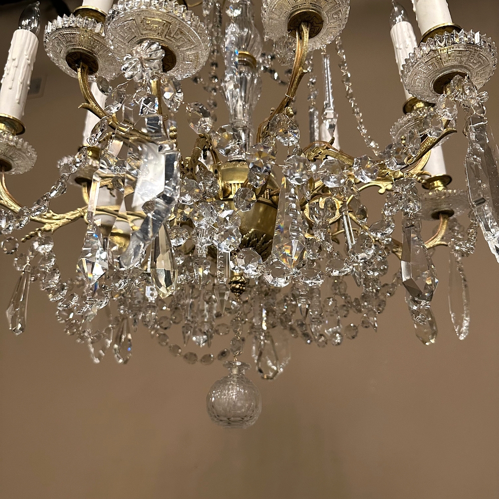 Antique French Louis XIV Brass & Crystal Chandelier will make any room sparkle with opulence! Crafted from finely embossed and cast brass, it features an intricately designed body that includes naturalistic foliates on the elegantly scrolled arms. The central shaft is a combination of brass and fluted crystal, leading the eye down to the faceted ball at the bottom. In between, a combination of faceted round crystals arranged in swags, rosettes, flat beveled crystals in various shapes, and even crystal bobeches under the realistic-looking candle sleeve covers, all included of course! Painstakingly and professionally wired to US Standards, it is poised to create a central focal point for your favorite room.