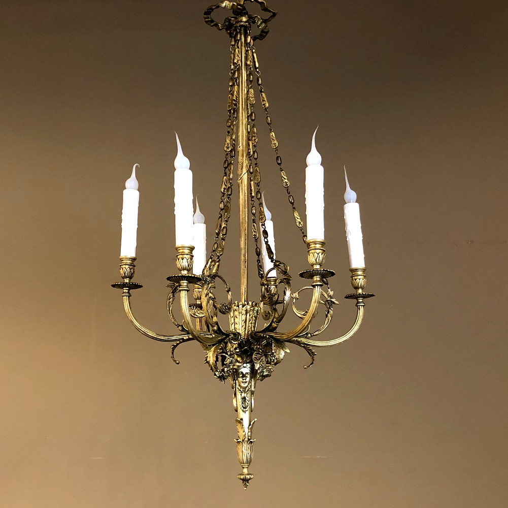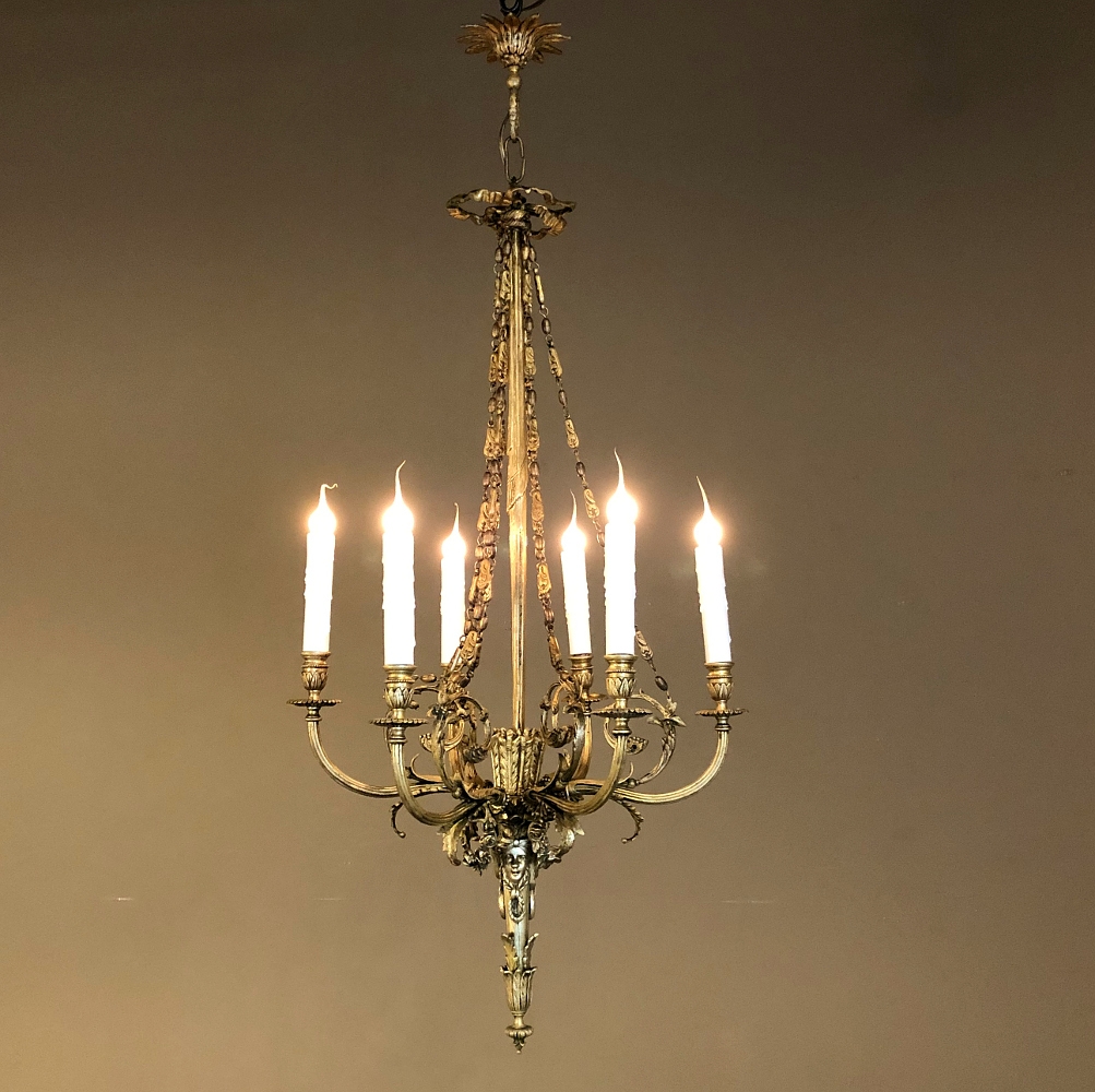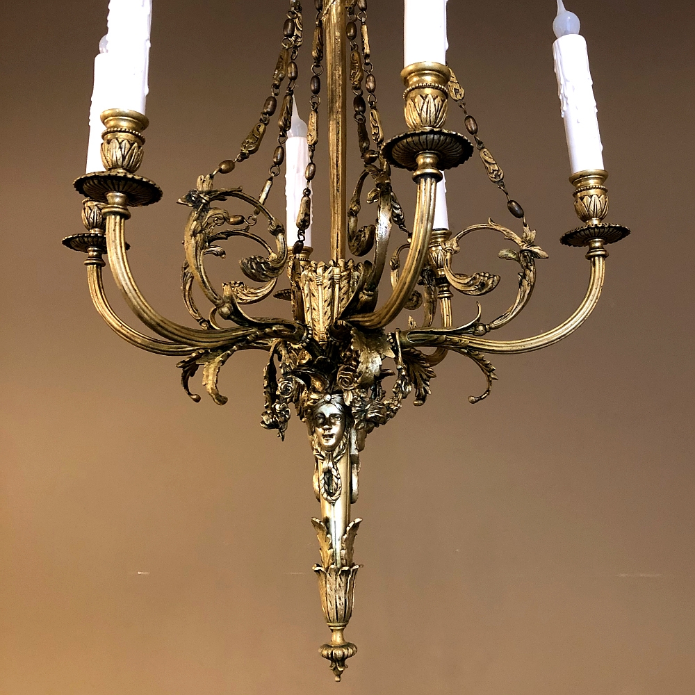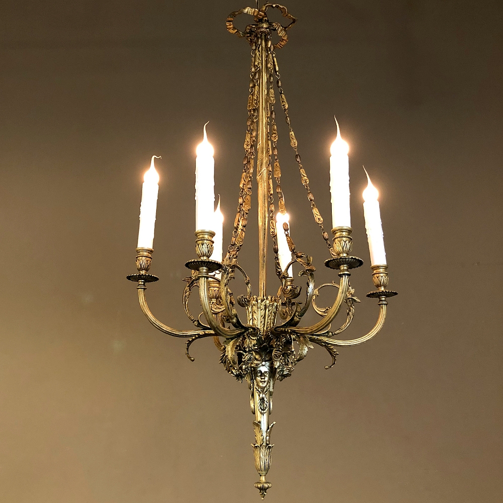 Antique French Louis XVI Bronze Chandelier is a spectacular design, inspired by ancient Greek and Roman architecture! The original canopy survives, cast to depict a laurel rosette, which leads the eye down to the top of the fixture which has been cast to depict a bow of ribbon. Cascading down from the bow are cast chain segments connected to each upturned arm below, which are fitted with matching laurel bobeches and candlestick holders. Exquisite foliate and acanthus leaf flourishes are abundant surrounding the central shaft, and below where the arms are affixed appear beautiful angel's faces, flanked by floral garlands and affixed to the central shaft cast to depict a carquois de fleche, symbol of the power of the French monarchy for centuries! Newly electrified with standard wiring.