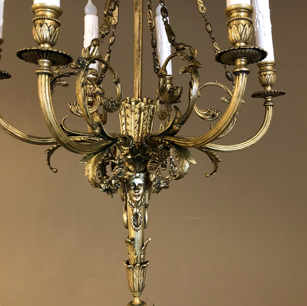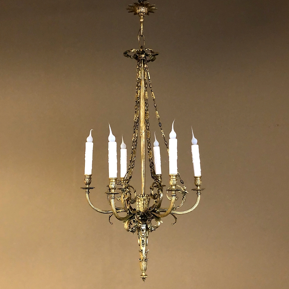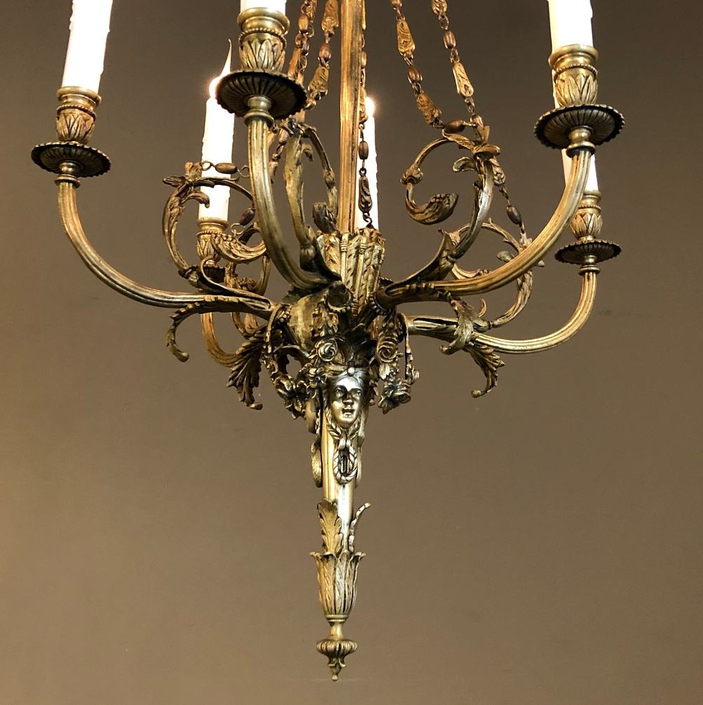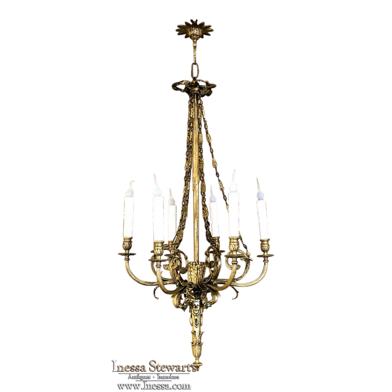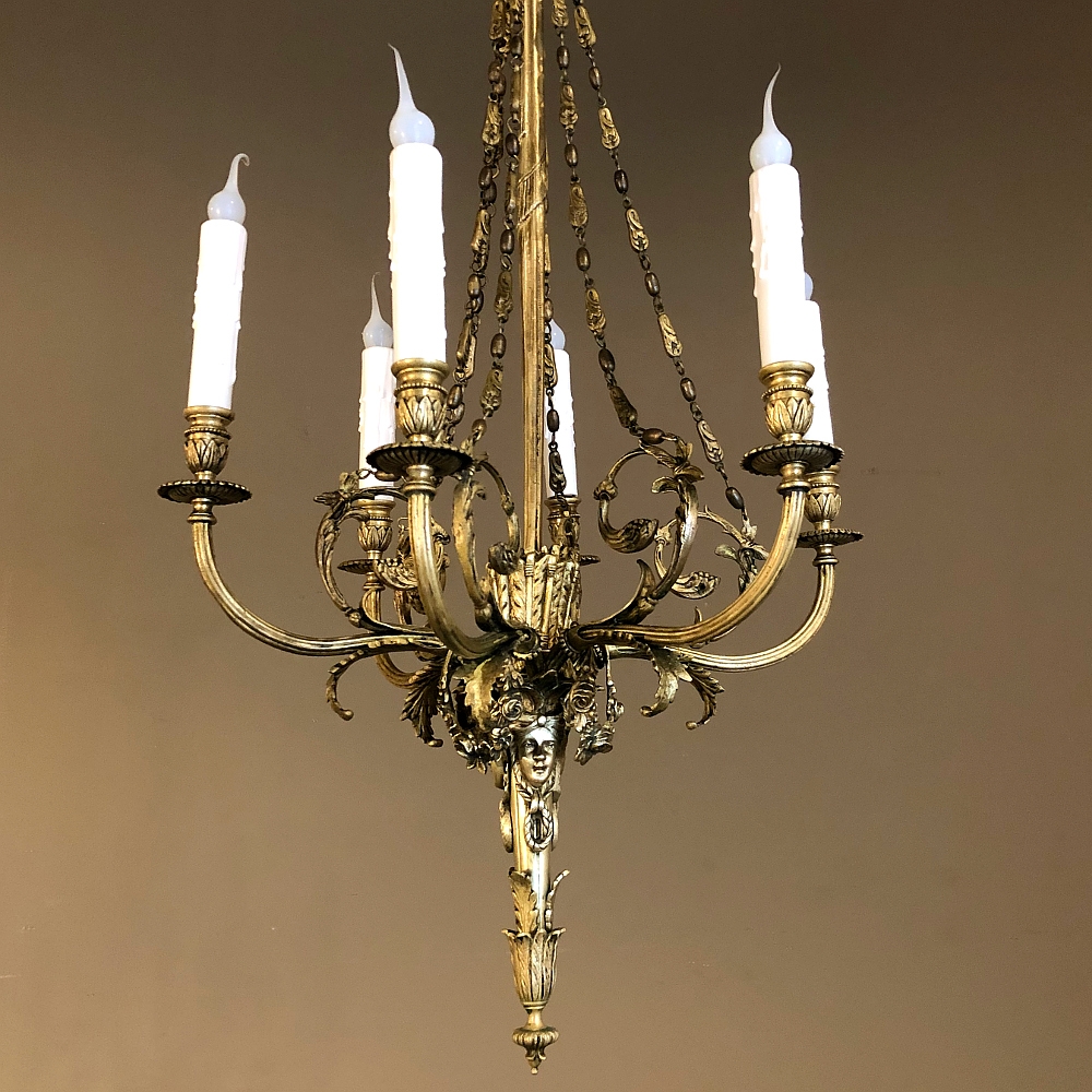 Antique French Louis XVI Bronze Chandelier is a spectacular design, inspired by ancient Greek and Roman architecture! The original canopy survives, cast to depict a laurel rosette, which leads the eye down to the top of the fixture which has been cast to depict a bow of ribbon. Cascading down from the bow are cast chain segments connected to each upturned arm below, which are fitted with matching laurel bobeches and candlestick holders. Exquisite foliate and acanthus leaf flourishes are abundant surrounding the central shaft, and below where the arms are affixed appear beautiful angel's faces, flanked by floral garlands and affixed to the central shaft cast to depict a carquois de fleche, symbol of the power of the French monarchy for centuries! Newly electrified with standard wiring.