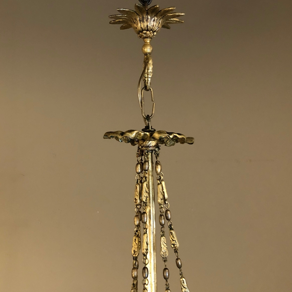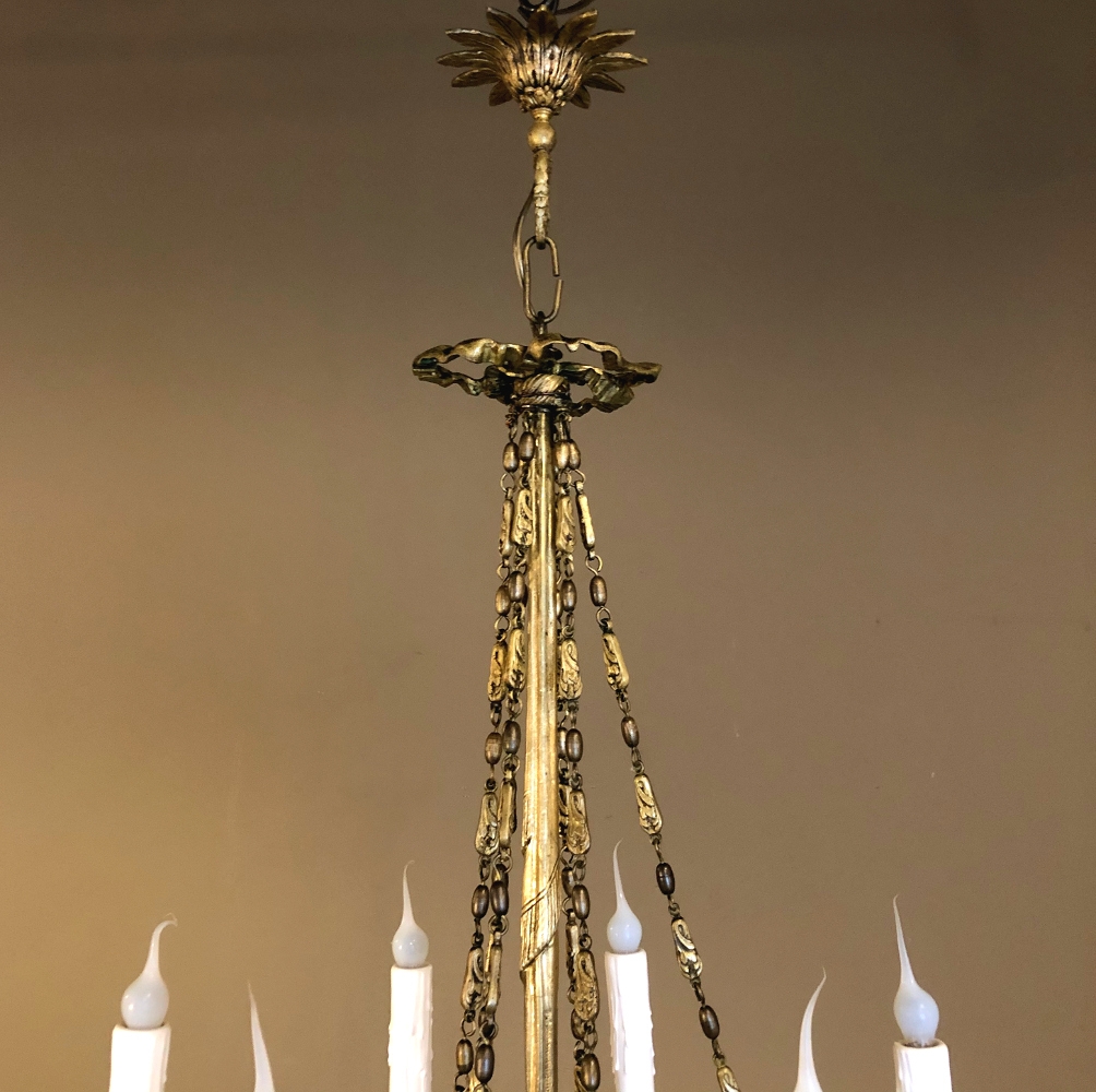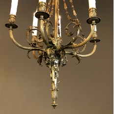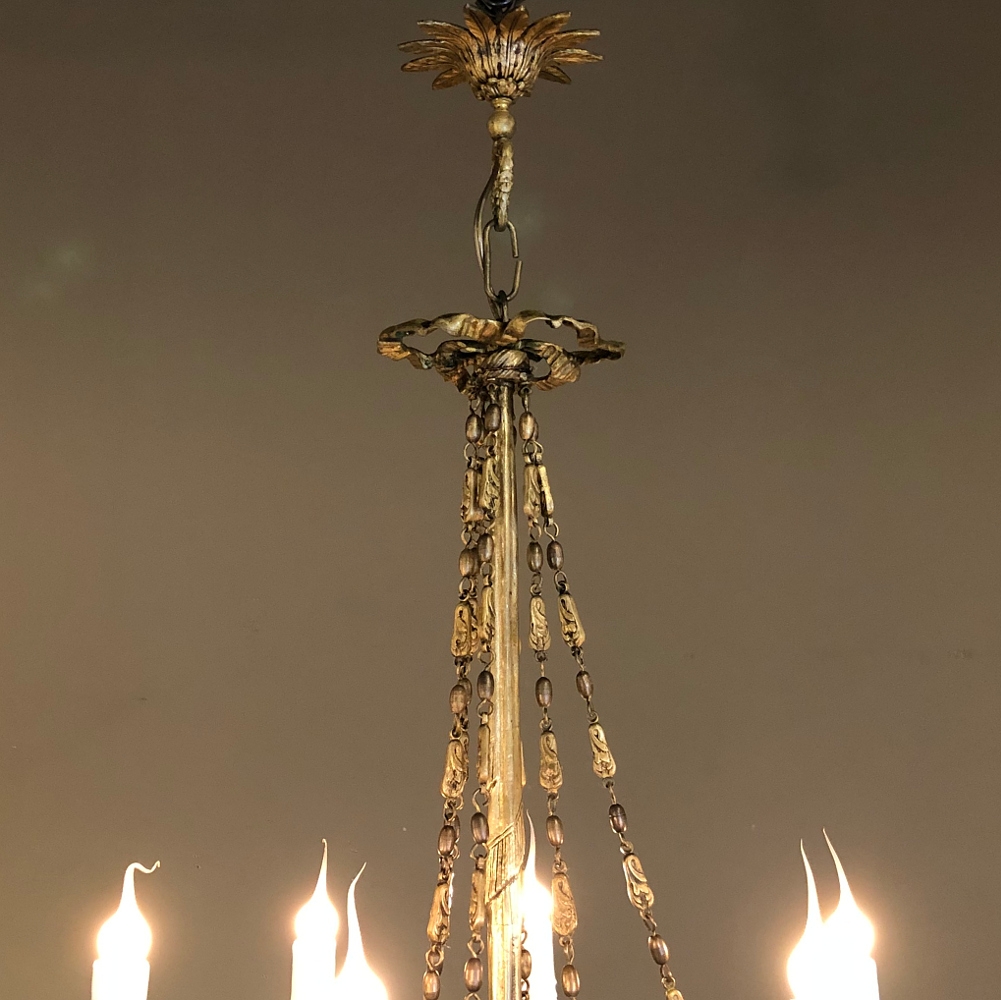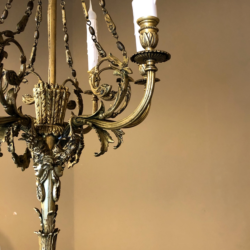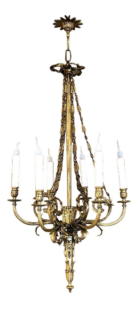 Antique French Louis XVI Bronze Chandelier is a spectacular design, inspired by ancient Greek and Roman architecture! The original canopy survives, cast to depict a laurel rosette, which leads the eye down to the top of the fixture which has been cast to depict a bow of ribbon. Cascading down from the bow are cast chain segments connected to each upturned arm below, which are fitted with matching laurel bobeches and candlestick holders. Exquisite foliate and acanthus leaf flourishes are abundant surrounding the central shaft, and below where the arms are affixed appear beautiful angel's faces, flanked by floral garlands and affixed to the central shaft cast to depict a carquois de fleche, symbol of the power of the French monarchy for centuries! Newly electrified with standard wiring.