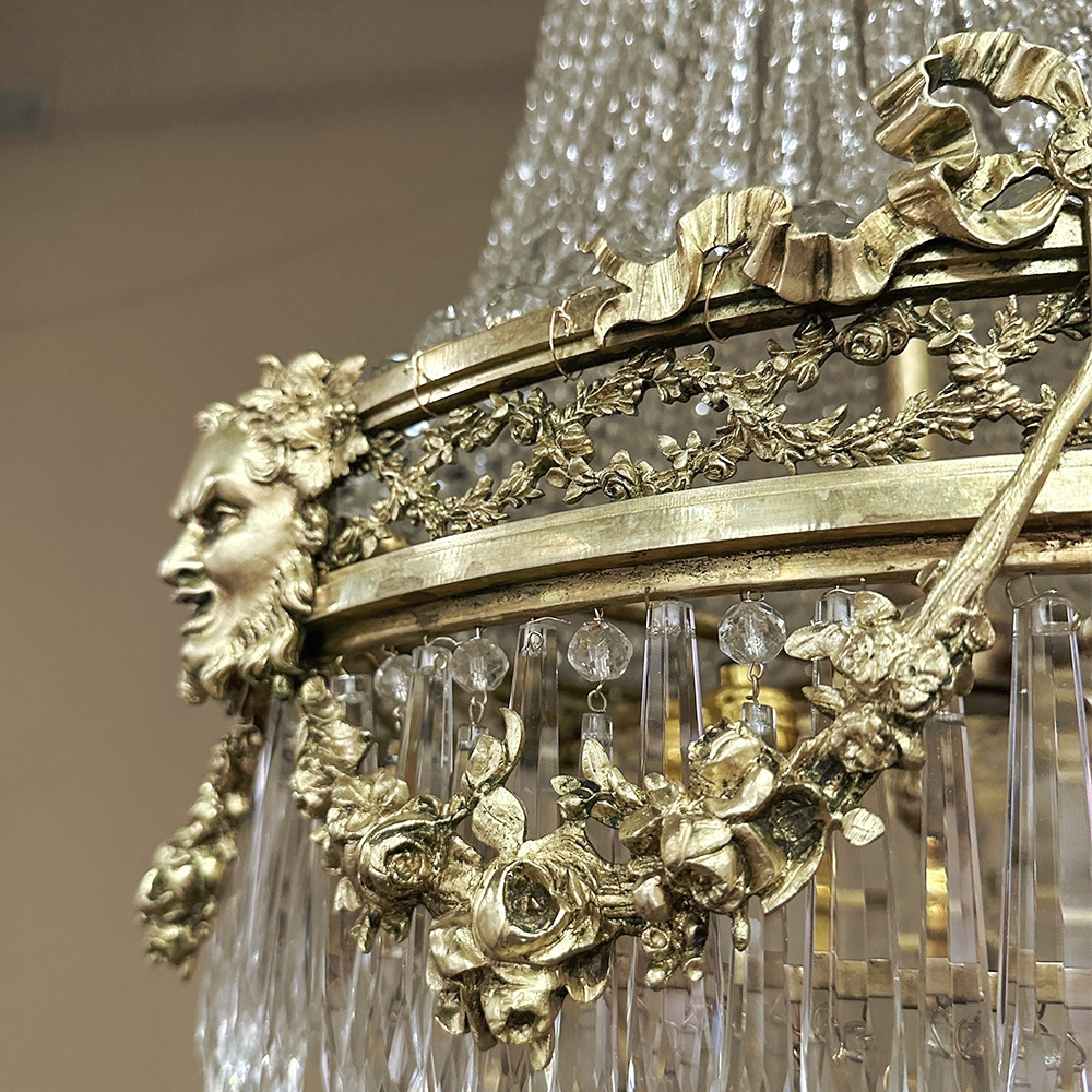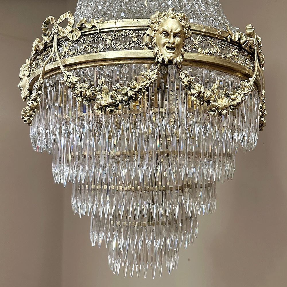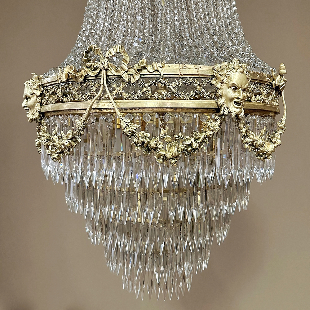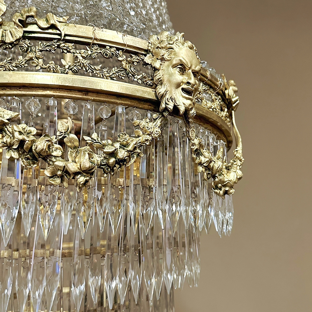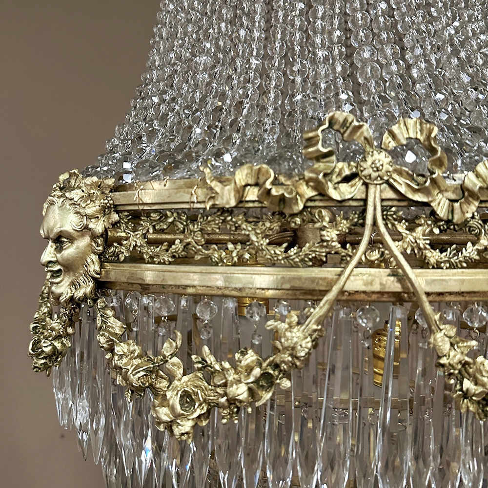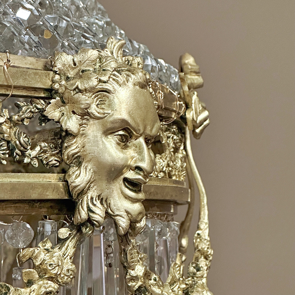 Antique French Neoclassical Sack of Pearls Bronze & Crystal Chandelier with Bacchus is one of the most spectacular lighting fixtures we've had the pleasure of offering! Combining bronze with a gilt finish and various sizes and styles of cut crystals, it creates a spectacular centerpiece in a design that has its inspirations from ancient Greek and Roman architecture for a truly timeless look. Bold acanthus plumes create a crown at the very top, which can be mounted flush to the ceiling or serve as an intermediate canopy if the fixture is hung from a section of chain. Internally, a solid brass framework contains the concealed structural elements which include interior lighting that furnishes a lovely glow from within the drapery of a multitude of crystal strings hung from the canopy to the main body of the hoop. The hoop is lavished with a wide variety of intricately detailed castings, depicting ribbon and bows suspending graceful floral garlands wrapping around the entire extremity. Alternating with the bows are castings of Bacchus, the god of wine and mirth, also known as Dionysus in Greek mythology. Under the hoop are hung vertical style crystals in concentric circles gradually reducing in diameter to the base. Either lit or not, it's a stunning work of art that will captivate everyone's attention immediately upon entering the room!