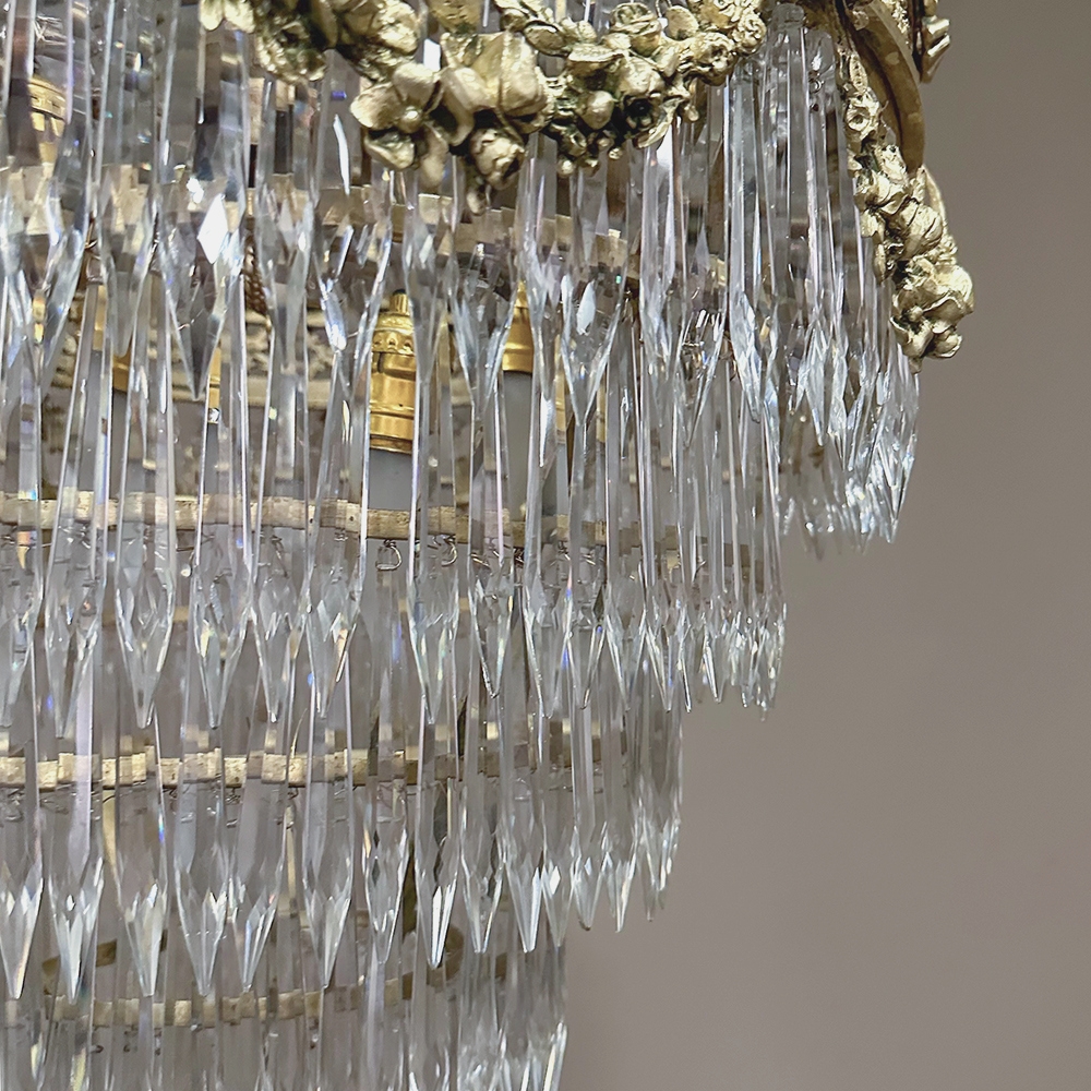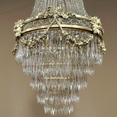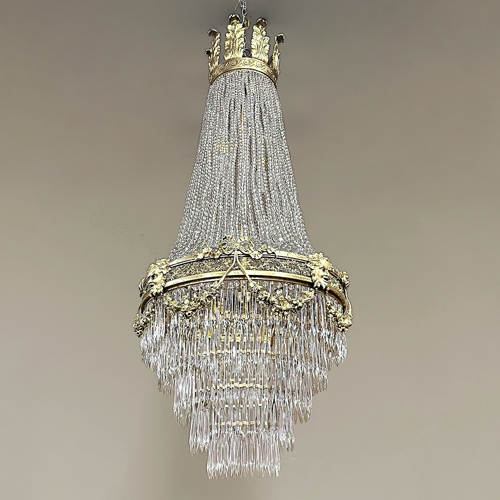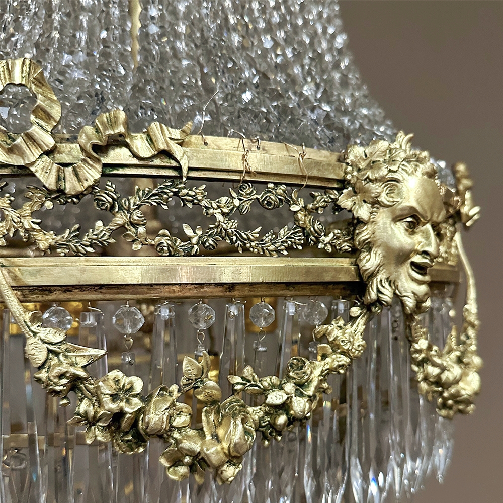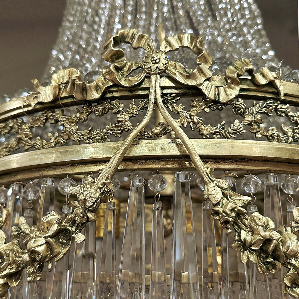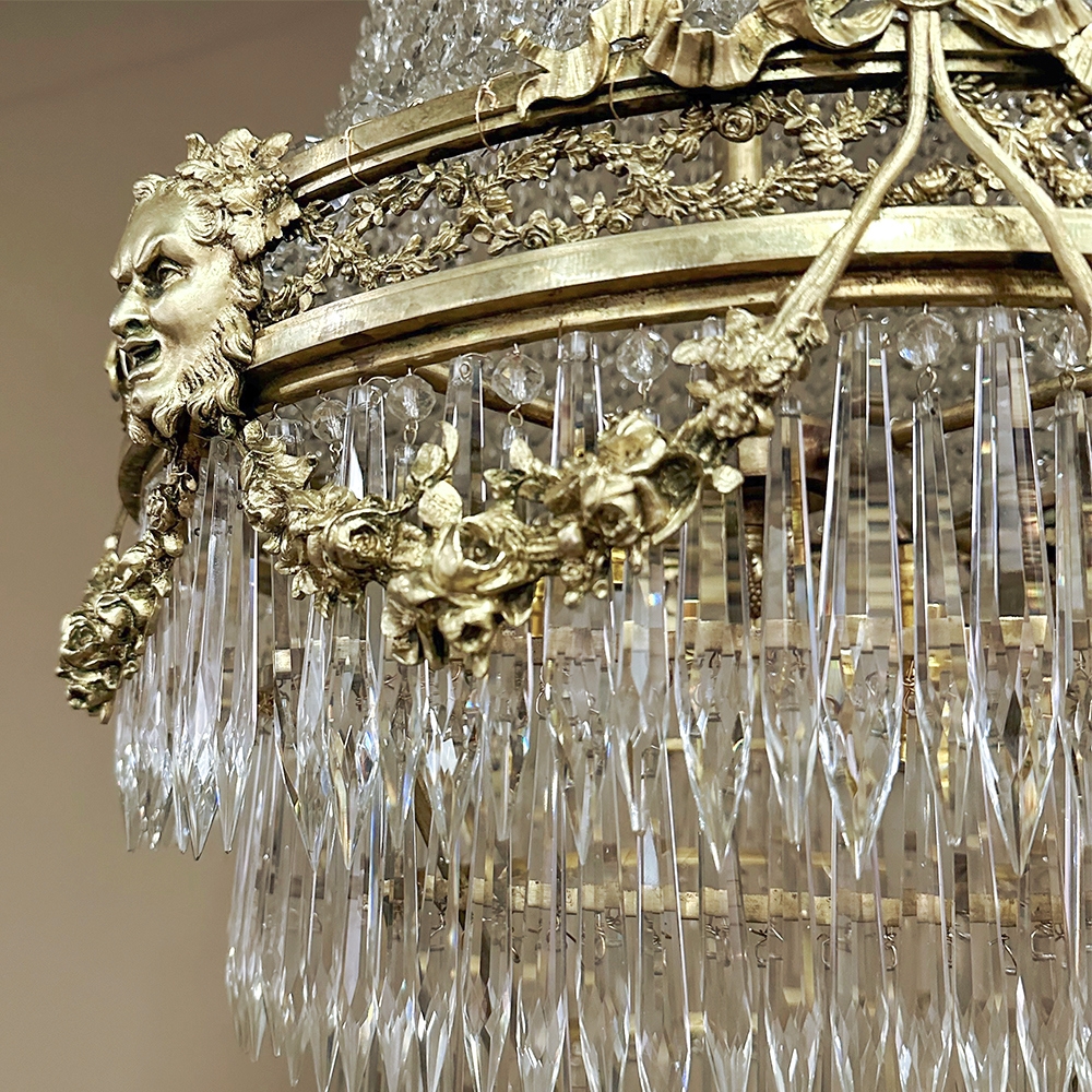 Antique French Neoclassical Sack of Pearls Bronze & Crystal Chandelier with Bacchus is one of the most spectacular lighting fixtures we've had the pleasure of offering! Combining bronze with a gilt finish and various sizes and styles of cut crystals, it creates a spectacular centerpiece in a design that has its inspirations from ancient Greek and Roman architecture for a truly timeless look. Bold acanthus plumes create a crown at the very top, which can be mounted flush to the ceiling or serve as an intermediate canopy if the fixture is hung from a section of chain. Internally, a solid brass framework contains the concealed structural elements which include interior lighting that furnishes a lovely glow from within the drapery of a multitude of crystal strings hung from the canopy to the main body of the hoop. The hoop is lavished with a wide variety of intricately detailed castings, depicting ribbon and bows suspending graceful floral garlands wrapping around the entire extremity. Alternating with the bows are castings of Bacchus, the god of wine and mirth, also known as Dionysus in Greek mythology. Under the hoop are hung vertical style crystals in concentric circles gradually reducing in diameter to the base. Either lit or not, it's a stunning work of art that will captivate everyone's attention immediately upon entering the room!
