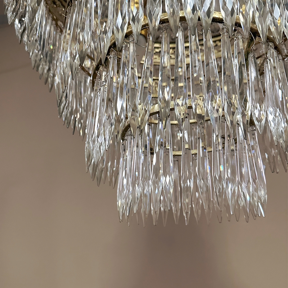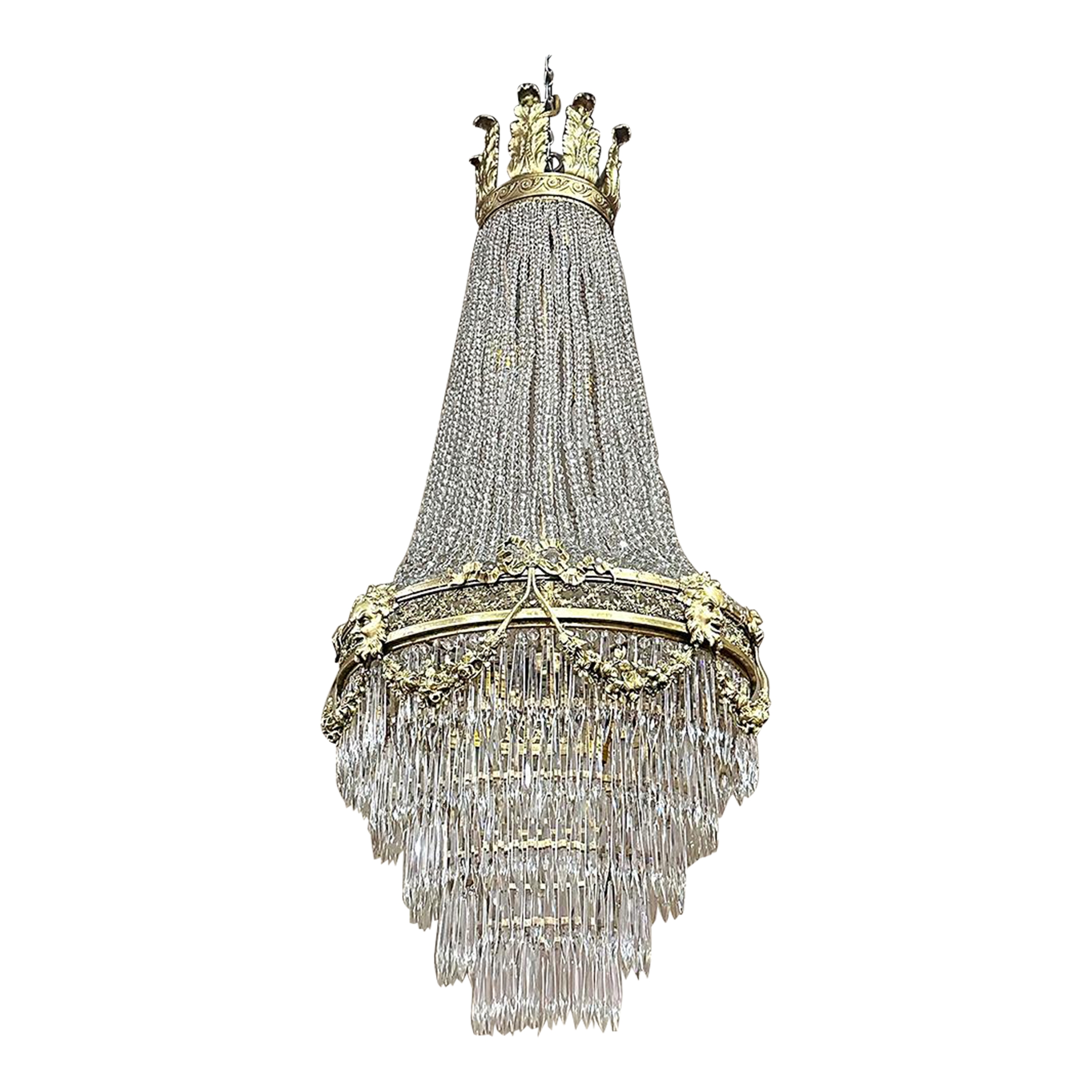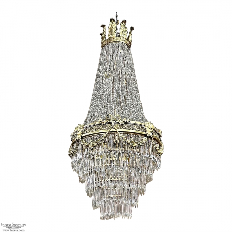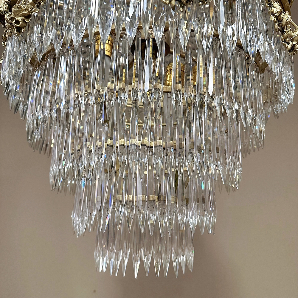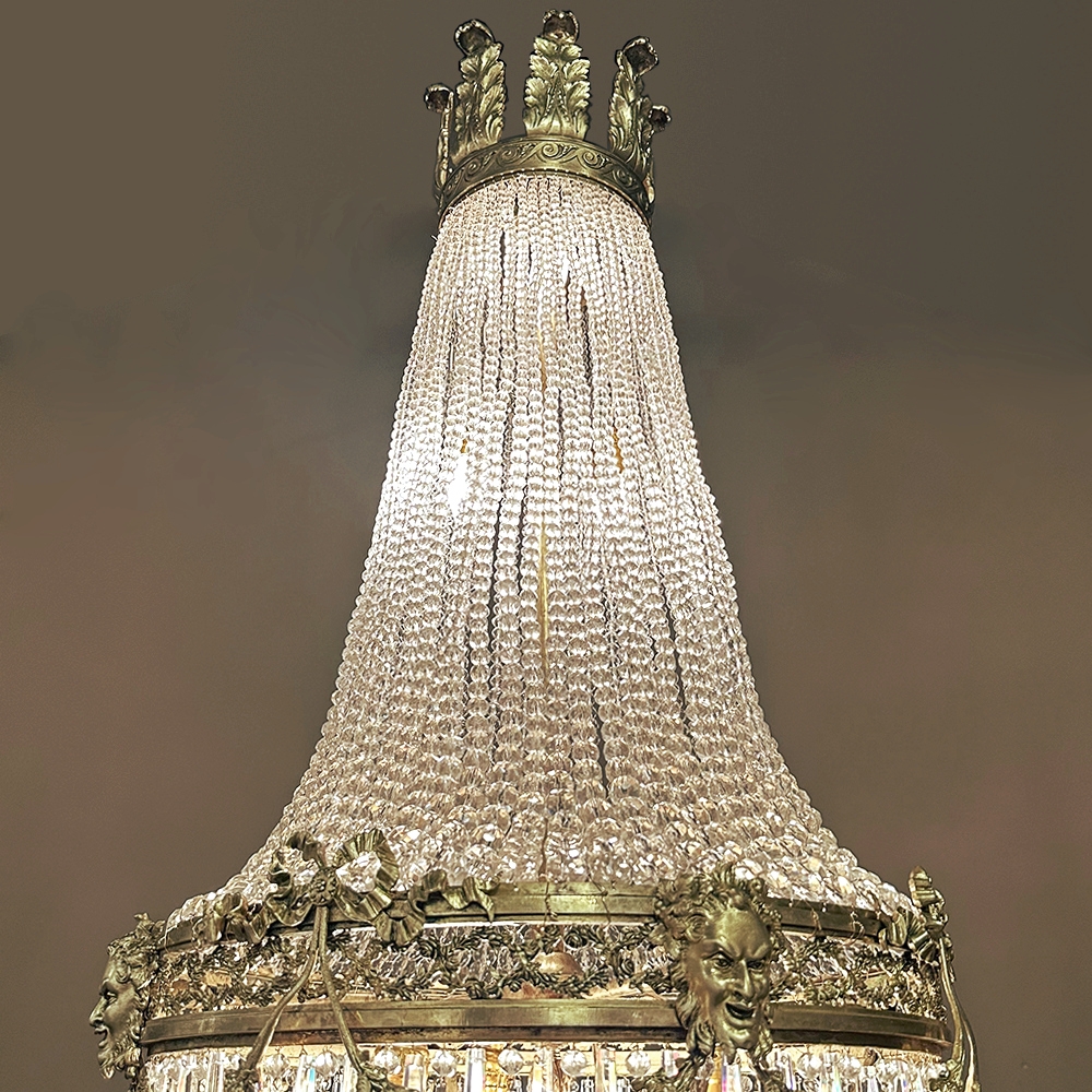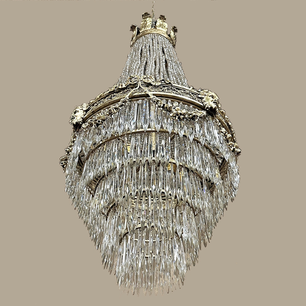 Antique French Neoclassical Sack of Pearls Bronze & Crystal Chandelier with Bacchus is one of the most spectacular lighting fixtures we've had the pleasure of offering! Combining bronze with a gilt finish and various sizes and styles of cut crystals, it creates a spectacular centerpiece in a design that has its inspirations from ancient Greek and Roman architecture for a truly timeless look. Bold acanthus plumes create a crown at the very top, which can be mounted flush to the ceiling or serve as an intermediate canopy if the fixture is hung from a section of chain. Internally, a solid brass framework contains the concealed structural elements which include interior lighting that furnishes a lovely glow from within the drapery of a multitude of crystal strings hung from the canopy to the main body of the hoop. The hoop is lavished with a wide variety of intricately detailed castings, depicting ribbon and bows suspending graceful floral garlands wrapping around the entire extremity. Alternating with the bows are castings of Bacchus, the god of wine and mirth, also known as Dionysus in Greek mythology. Under the hoop are hung vertical style crystals in concentric circles gradually reducing in diameter to the base. Either lit or not, it's a stunning work of art that will captivate everyone's attention immediately upon entering the room!