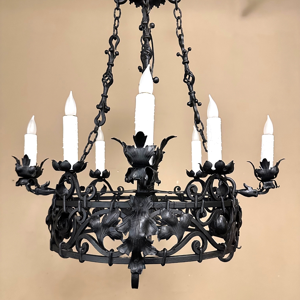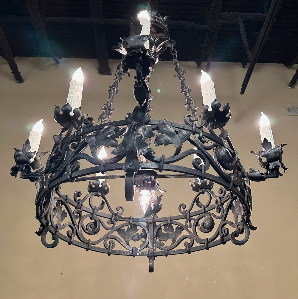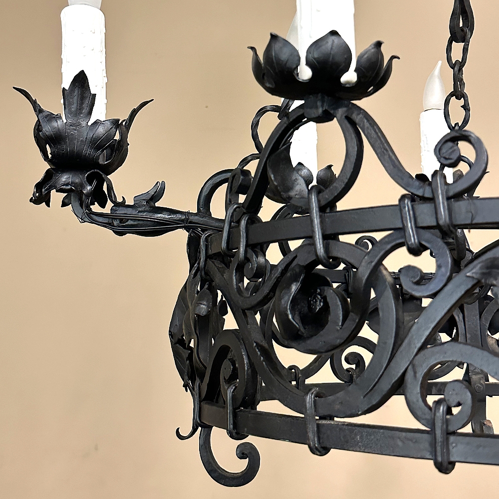Large in scale and substantial in weight, this chandelier was designed to anchor a space — ideal for a wine room, vaulted entry, or dining room where its grapevine ornament feels especially appropriate. The chandelier has developed a beautiful aged patina, enhancing the depth of the forged detailing.