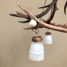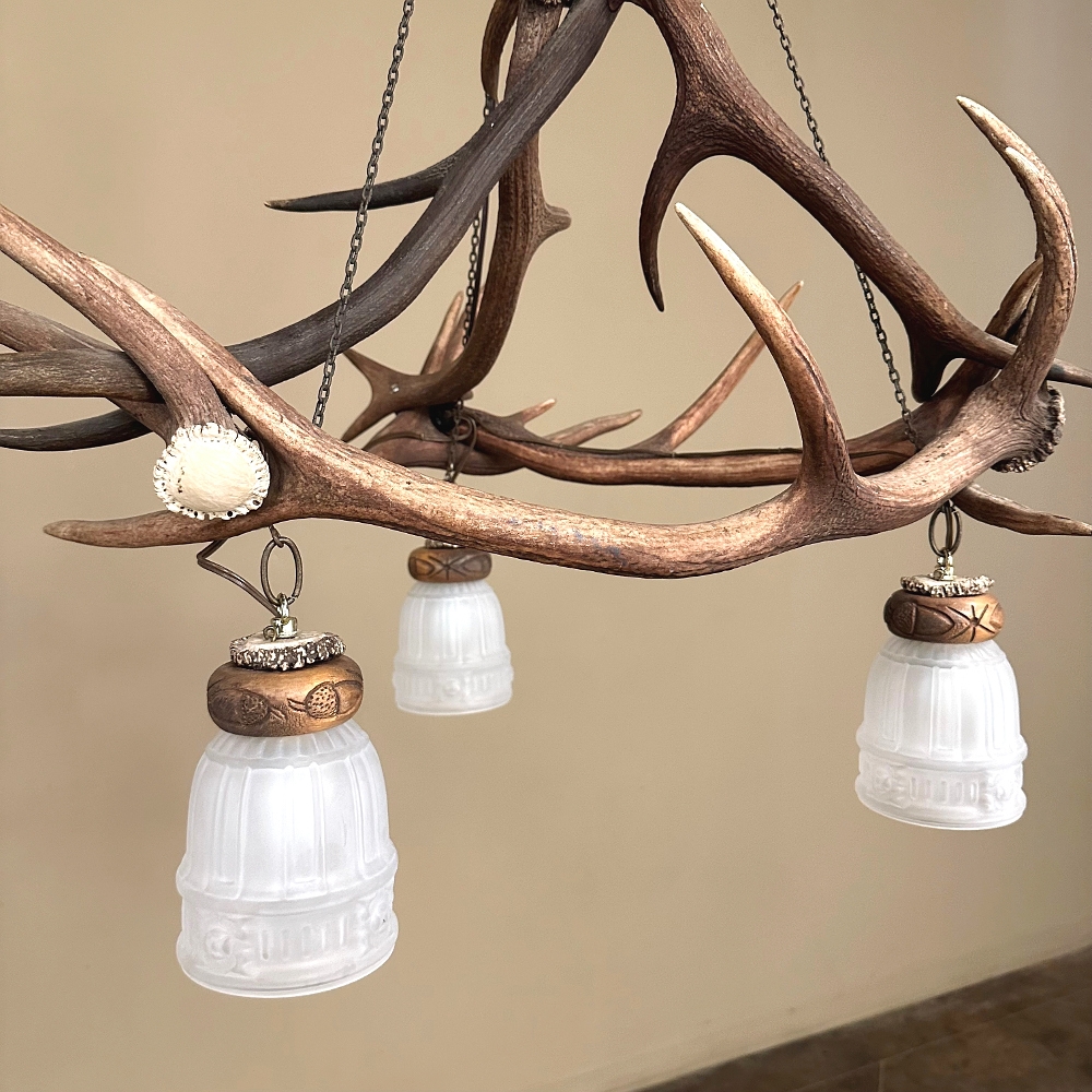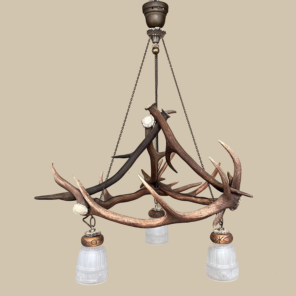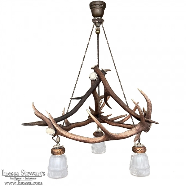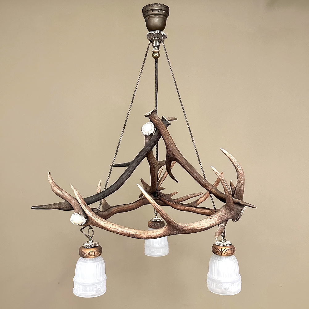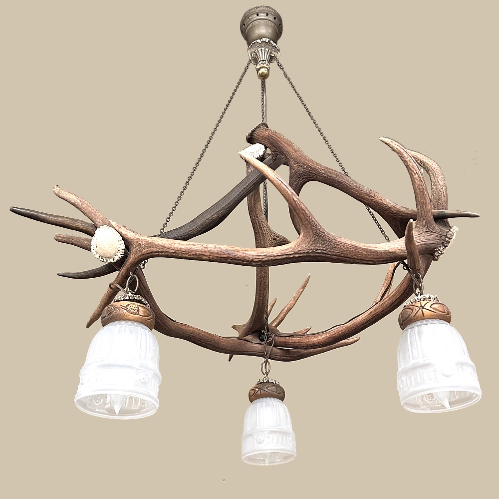 SaleAntique Rustic Deer Antler Chandelier was cleverly hand-crafted from antlers found in the forest shed naturally from male deer after the rut each year. Nature cleverly allowed this group of animals to shed their antlers that are frequently damaged during mating season so new ones can grow out bigger and better the next year. Perfect for adding a splendid rustic, casual look to any room, such fixtures are very popular with lake houses, mountain homes, or just rooms where a little natural effect is desired. Three suspended sockets are covered with frosted glass globes to soften the light, with the original brass canopy above to conceal the mounting in the ceiling. Painstakingly wired by a professional electrician to standard USA wiring, included in the price!
