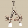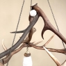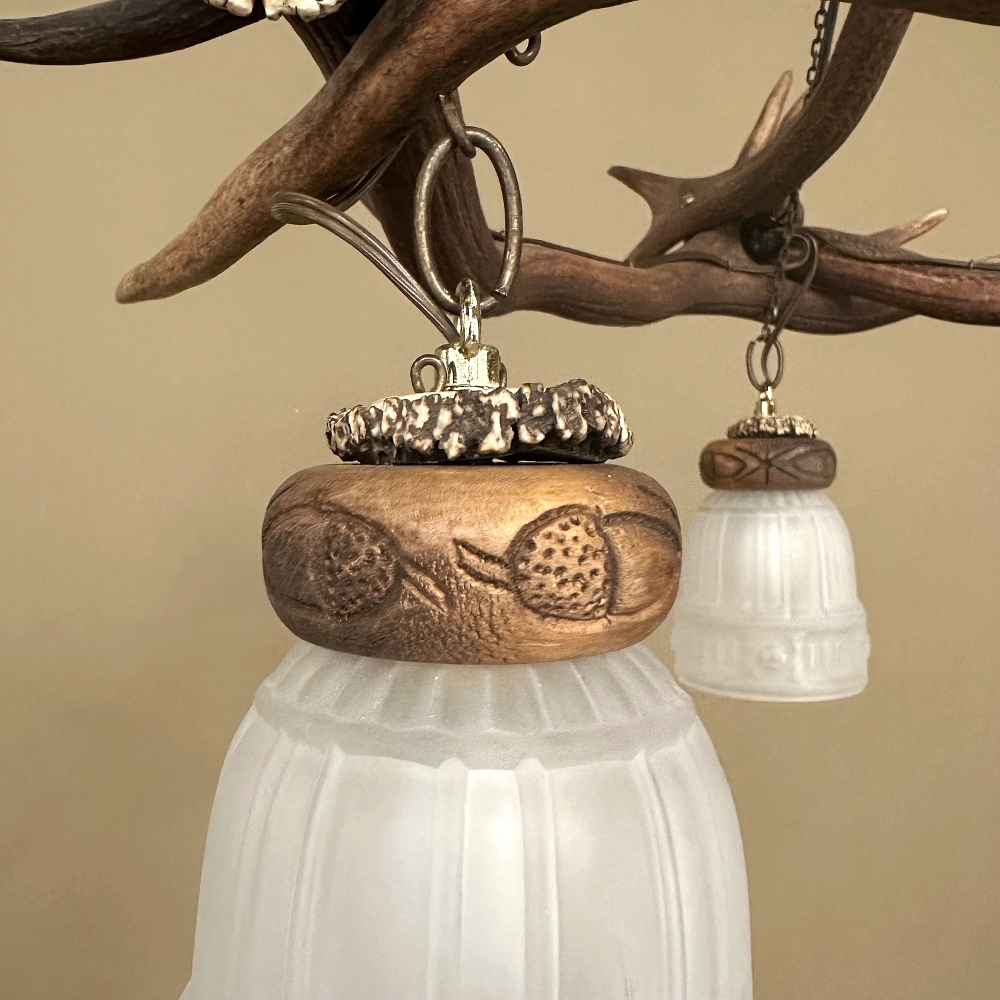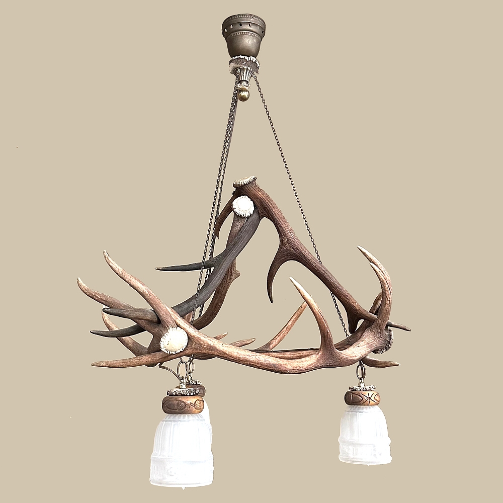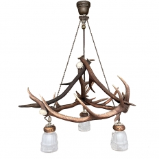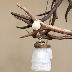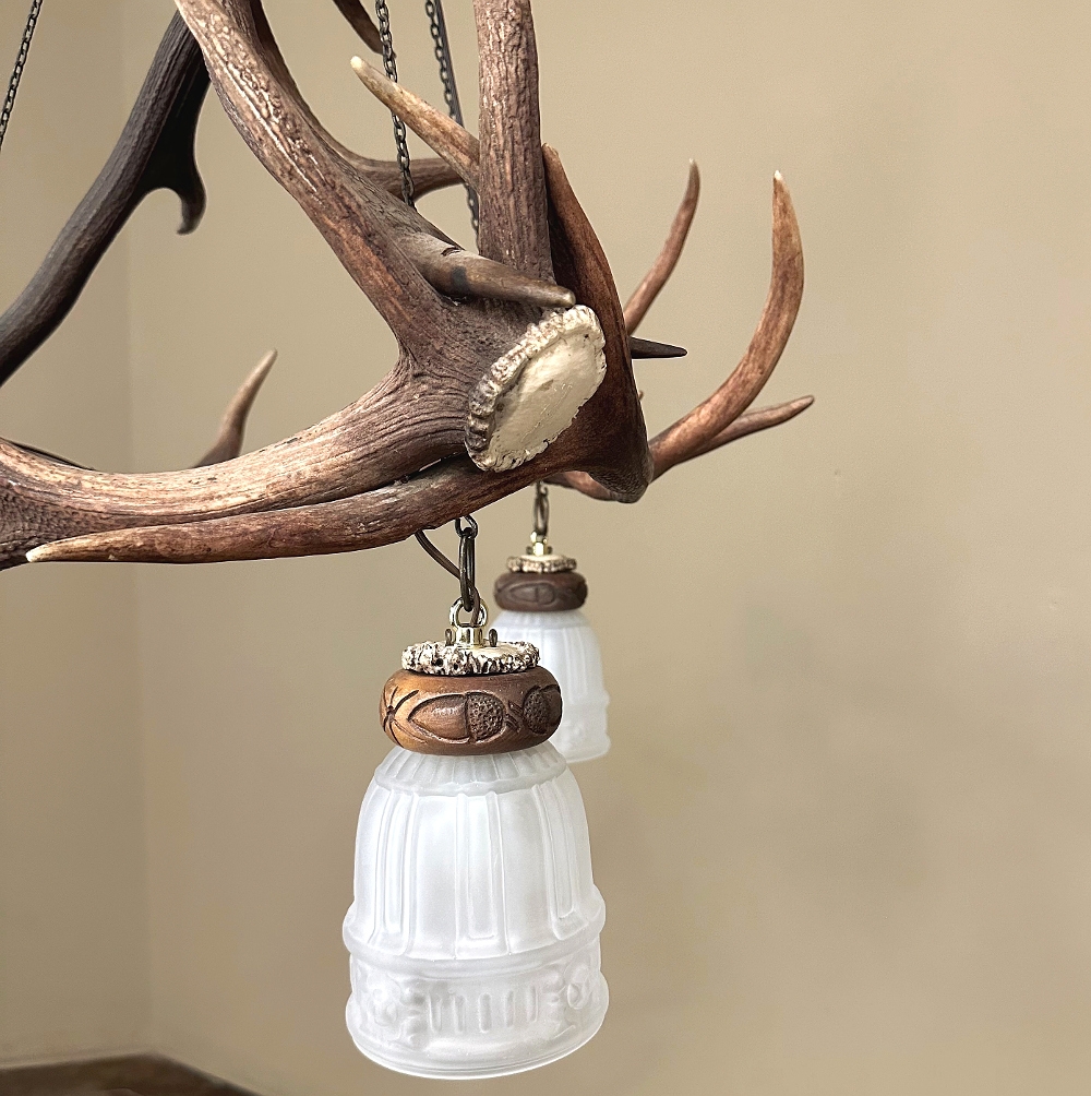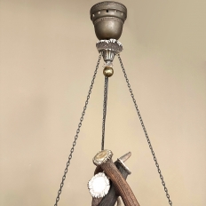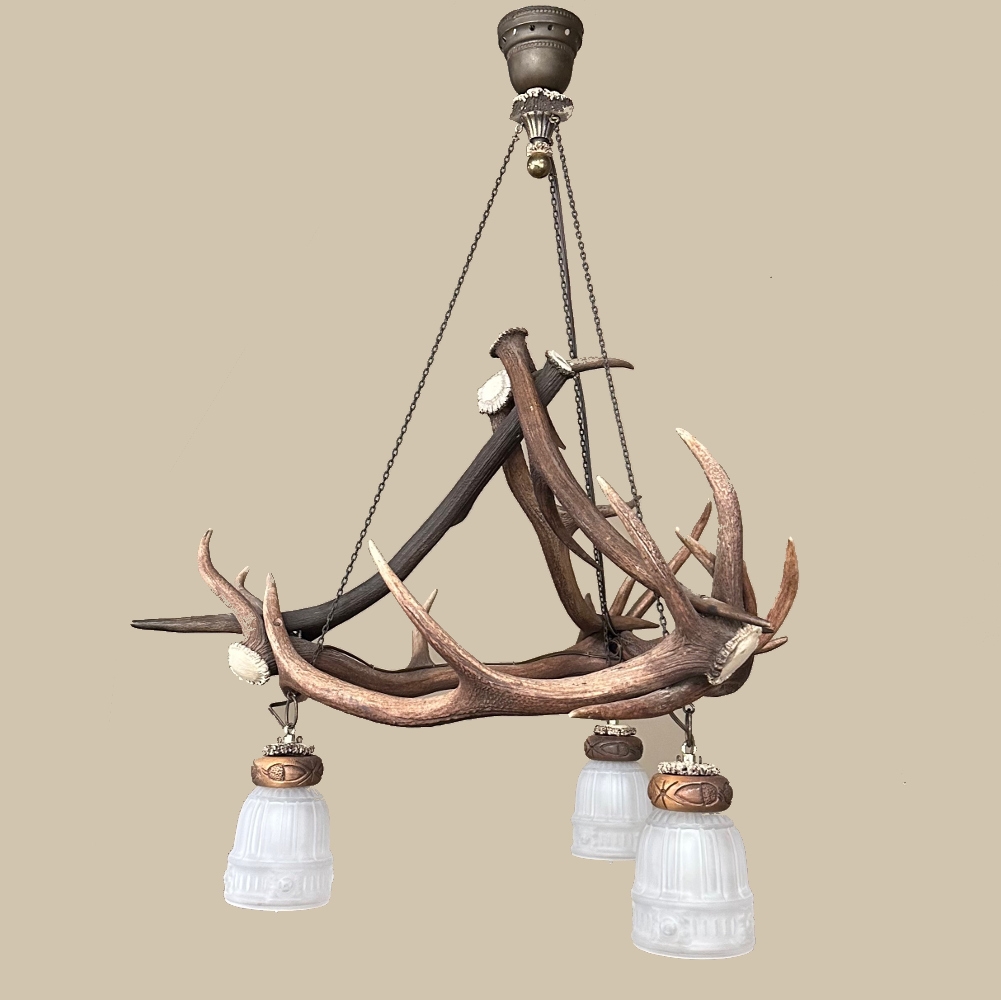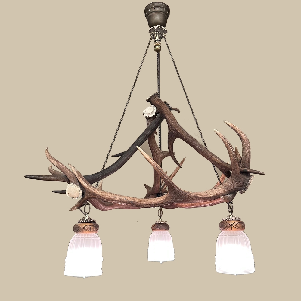 SaleAntique Rustic Deer Antler Chandelier was cleverly hand-crafted from antlers found in the forest shed naturally from male deer after the rut each year. Nature cleverly allowed this group of animals to shed their antlers that are frequently damaged during mating season so new ones can grow out bigger and better the next year. Perfect for adding a splendid rustic, casual look to any room, such fixtures are very popular with lake houses, mountain homes, or just rooms where a little natural effect is desired. Three suspended sockets are covered with frosted glass globes to soften the light, with the original brass canopy above to conceal the mounting in the ceiling. Painstakingly wired by a professional electrician to standard USA wiring, included in the price!