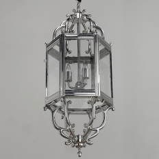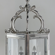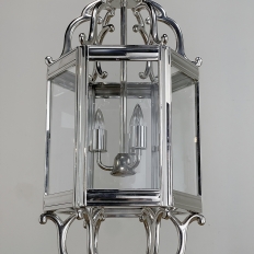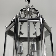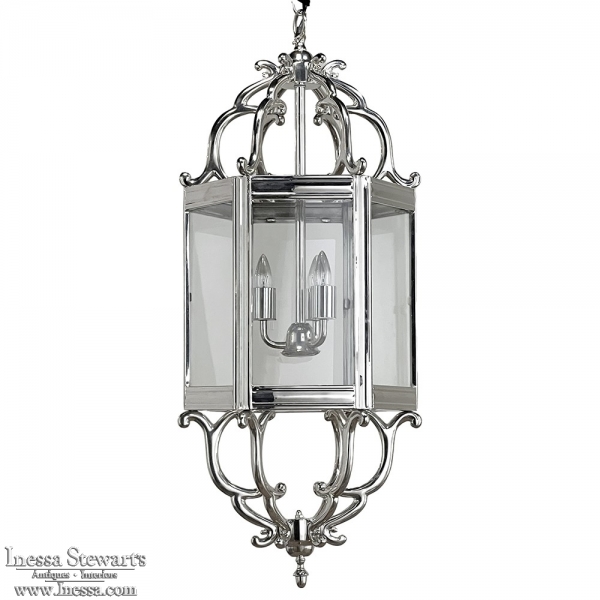 SaleHexagonal Lantern Chandelier in Chrome Finish is a handsome fixture that will work indoors or out, and work with style! The hexagonal design creates visual appeal from all angles, and the fixture supports three medium base bulbs. We recommend 60 to 100 watt equivalent LEDs for maximum light output. What a fashionable way to illuminate a stairway, patio or porch!