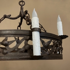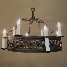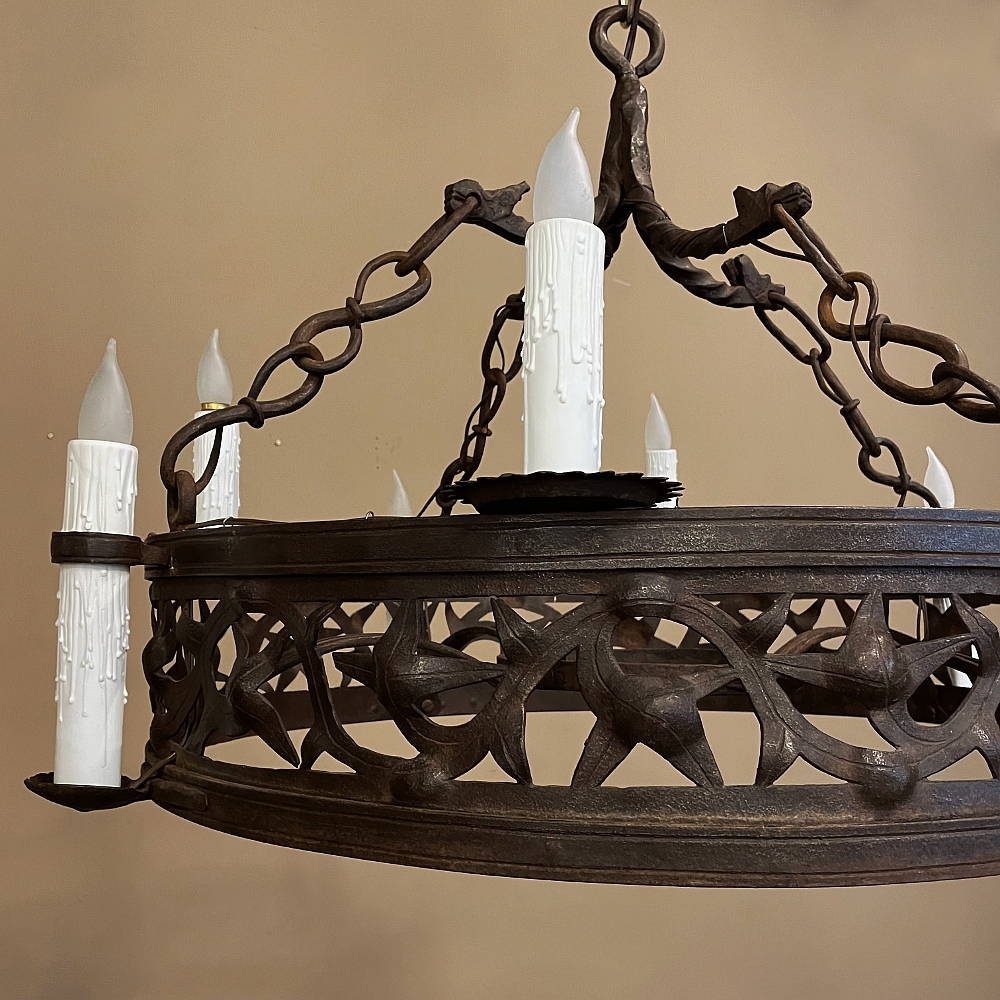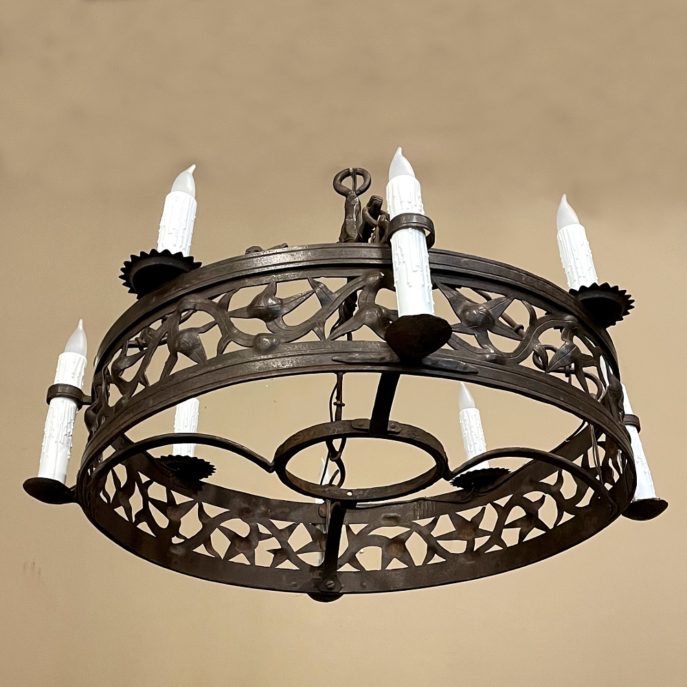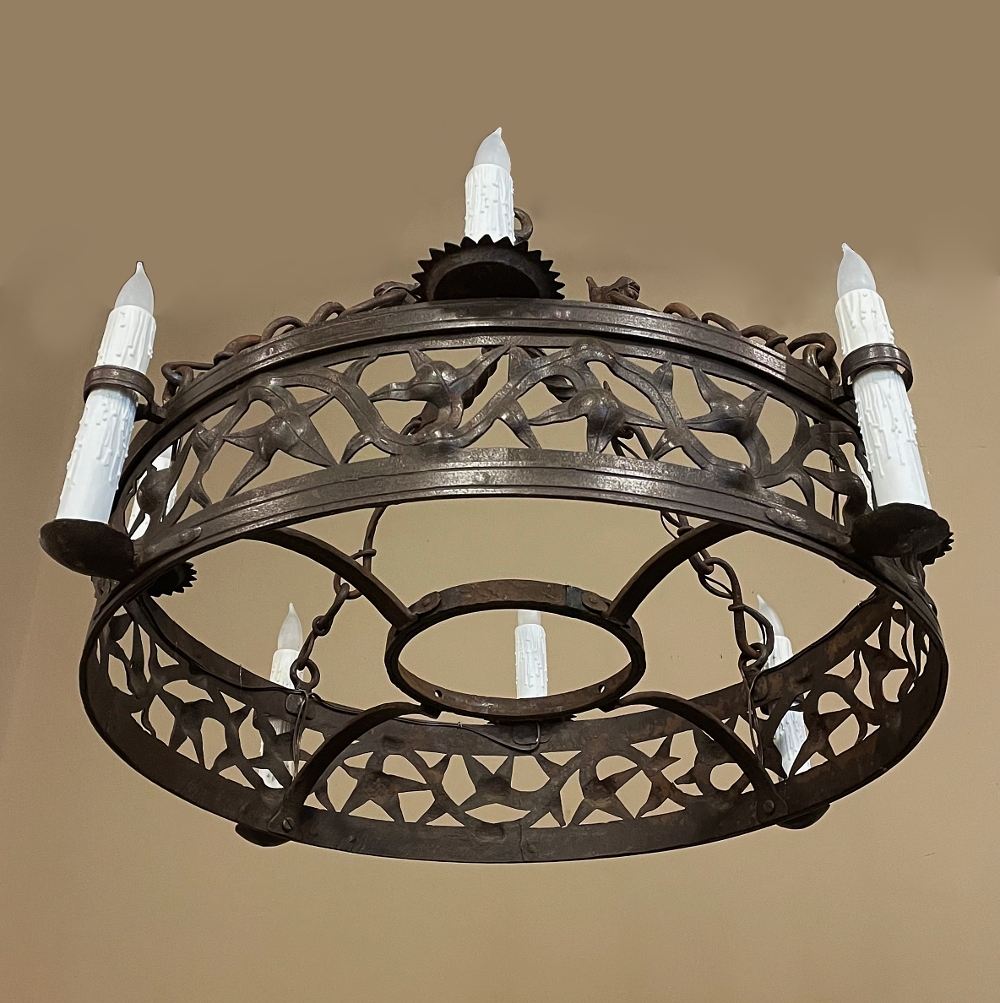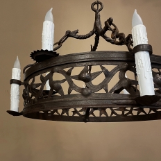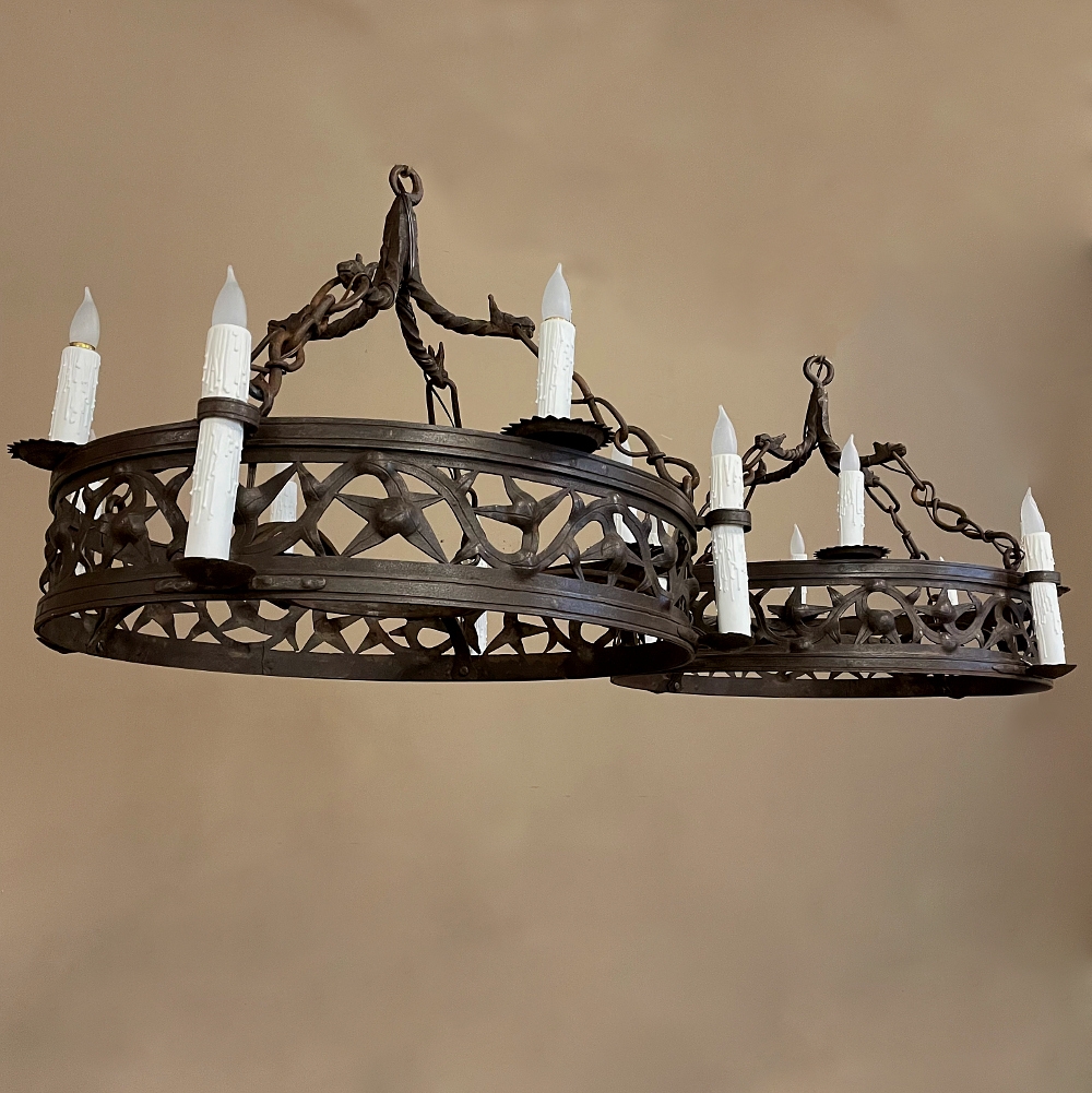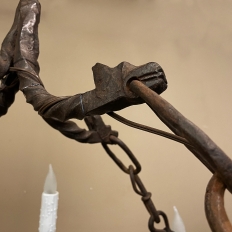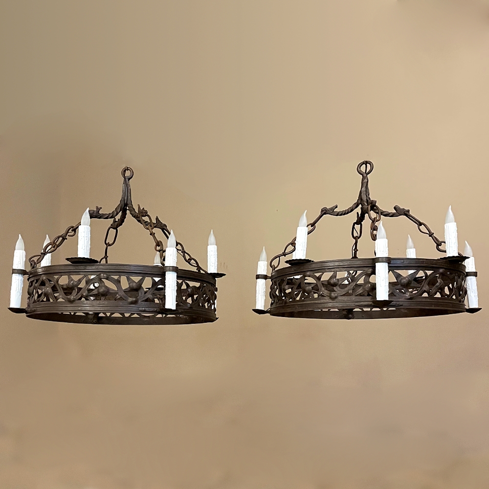 Pair Antique Country French Wrought Iron Chandeliers is a rare find indeed! Each has been completely forged by hand from red-hot iron over the blacksmith's anvil. First, the dual hoops were fashioned, then welded together with an intriguing intertwined vine pattern with three dimensional aspects creating unusual visual interest. Next, four bobeches were riveted and forged to create bobeche platforms for external chandelles, with ring guides affixed to the upper hoop. Then, saw blade bobeches were welded to the top of the upper hoop between the external chandelles for four additional lights. Lastly, dragon motifs were hand-hammered to create a suspension crown which holds the chandeliers with link chains.