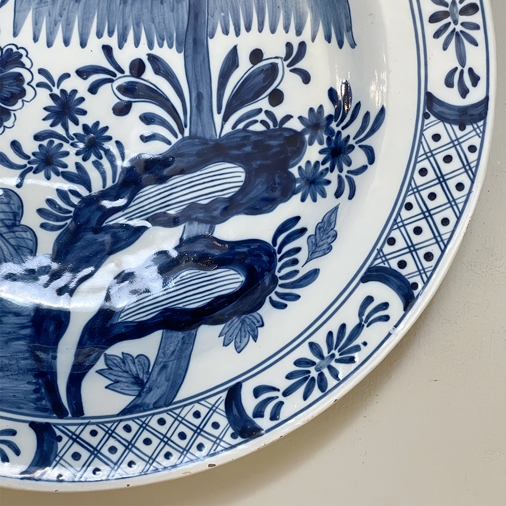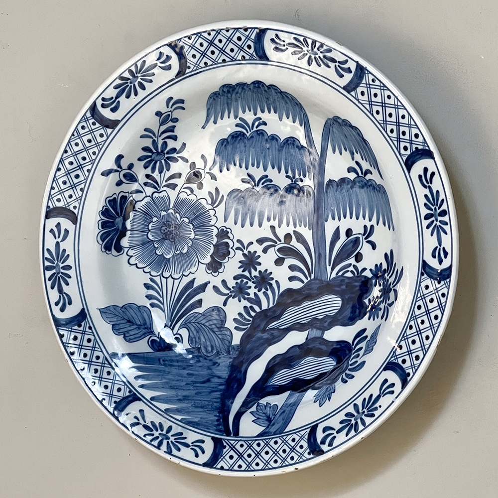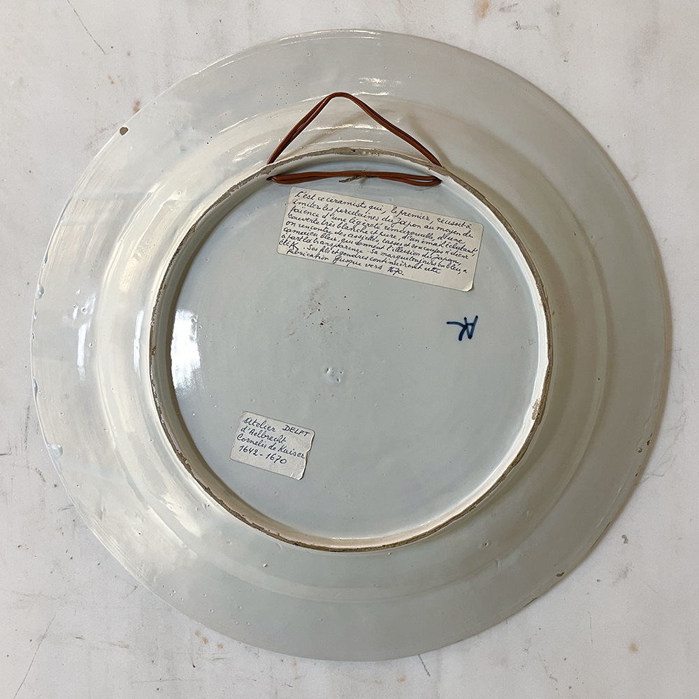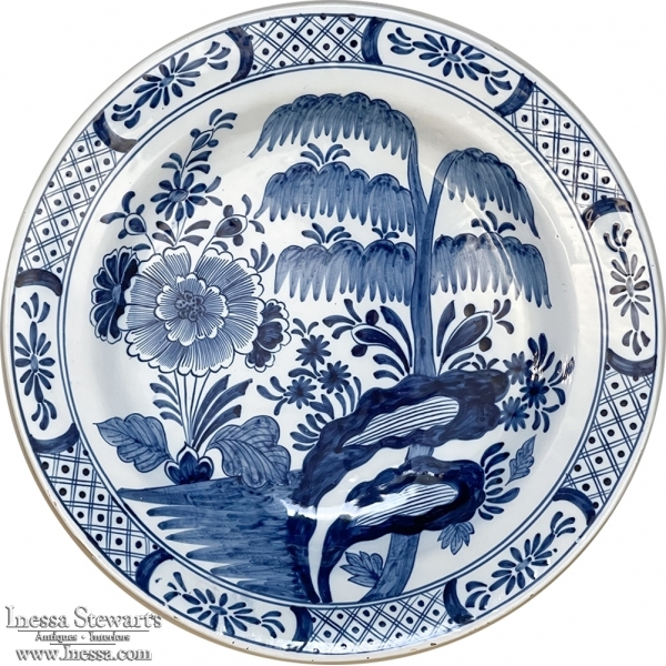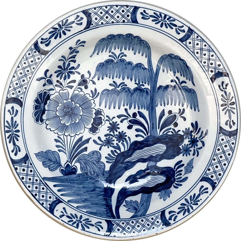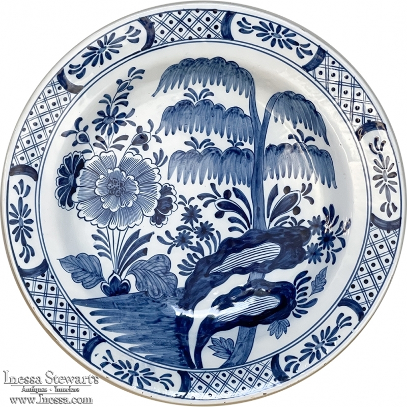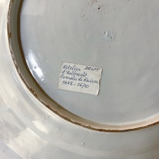 17th Century Delft Blue & White Charger is a timeless interpretation of the Japanese porcelains that were so popular in Europe, replicated by the master ceramicists in the Delft region of Holland, and most experts agree, equivalent in quality to the Oriental artworks. This particular example is identified as hailing from the workshop of Aelbrecht Cornelis de Kaiser. It was this ceramist who was the first to succeed in imitating Japanese porcelain by means of earthenware of a remarkable lightness, a very white and pure glaze, a dazzling enamel; a blue cameo decor, which give the illusion of Japan, apart from the transparency. Its mark, still in blue, was AK. His sons and sons-in-law continued this manufacture until around 1670.