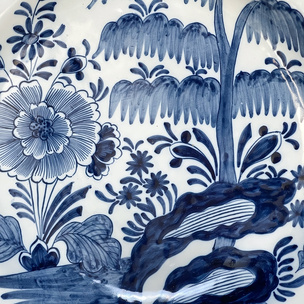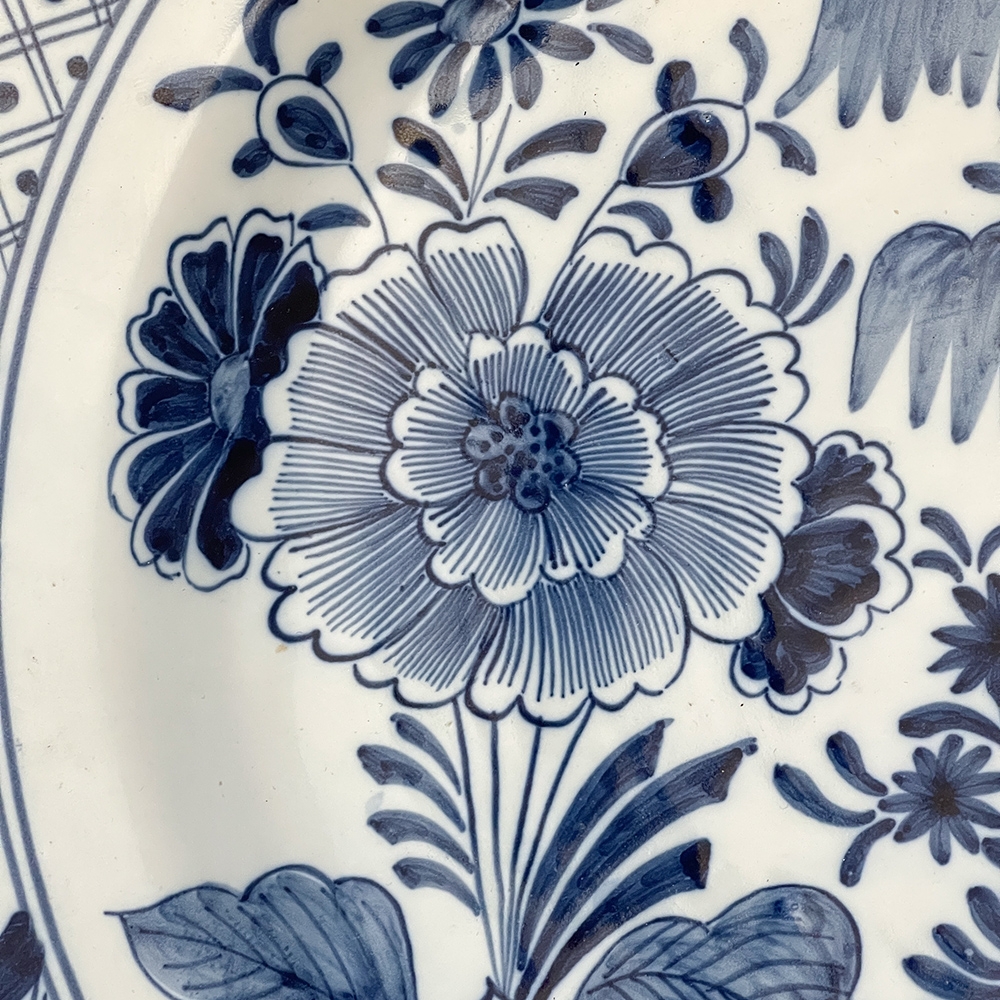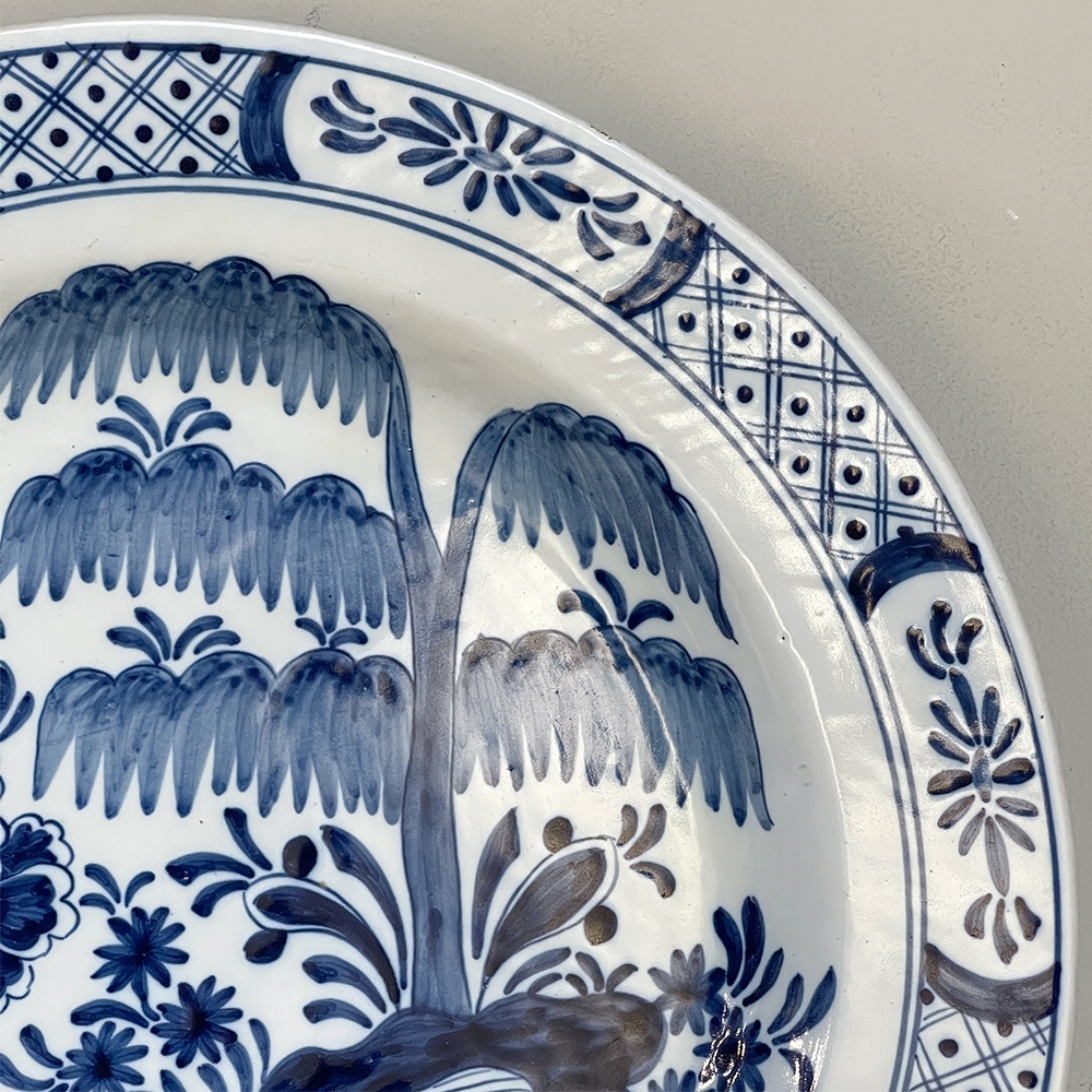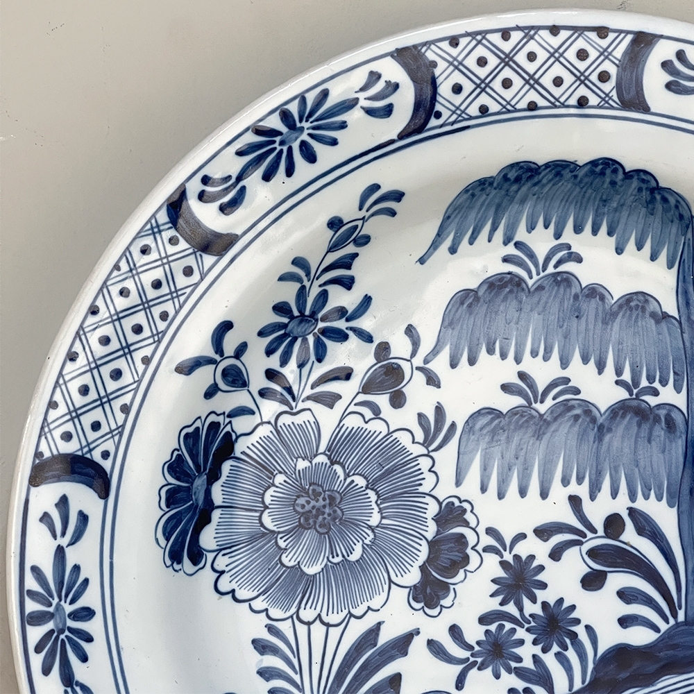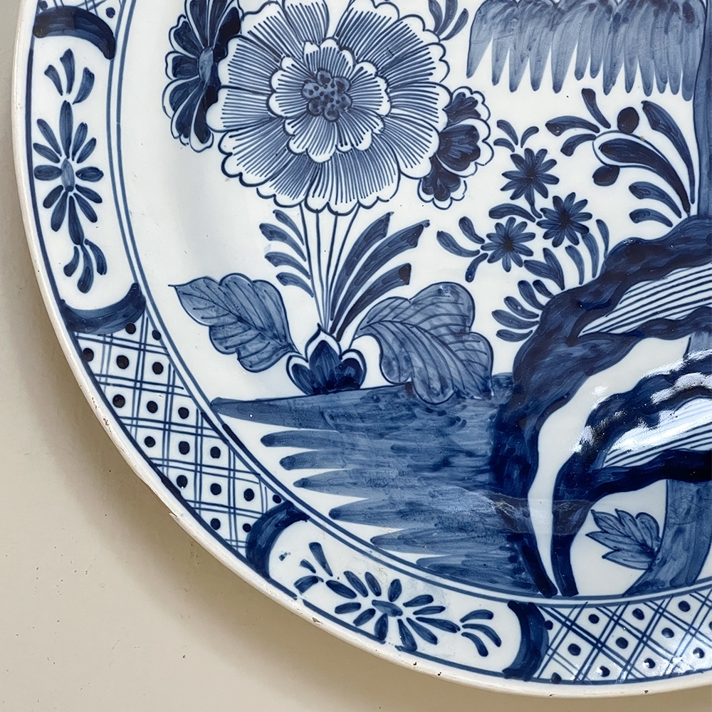 17th Century Delft Blue & White Charger is a timeless interpretation of the Japanese porcelains that were so popular in Europe, replicated by the master ceramicists in the Delft region of Holland, and most experts agree, equivalent in quality to the Oriental artworks. This particular example is identified as hailing from the workshop of Aelbrecht Cornelis de Kaiser. It was this ceramist who was the first to succeed in imitating Japanese porcelain by means of earthenware of a remarkable lightness, a very white and pure glaze, a dazzling enamel; a blue cameo decor, which give the illusion of Japan, apart from the transparency. Its mark, still in blue, was AK. His sons and sons-in-law continued this manufacture until around 1670.