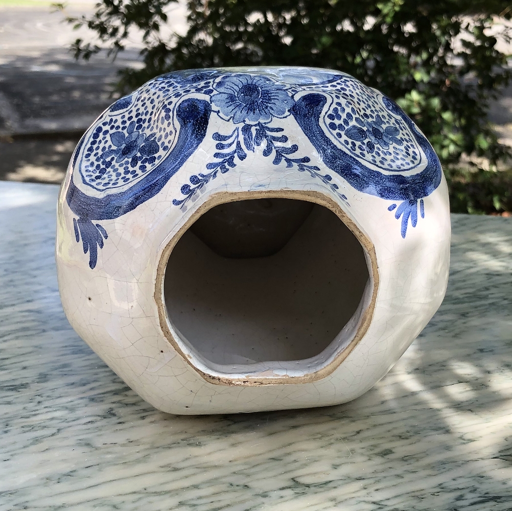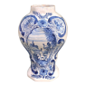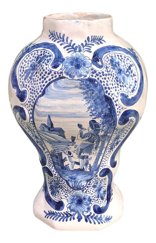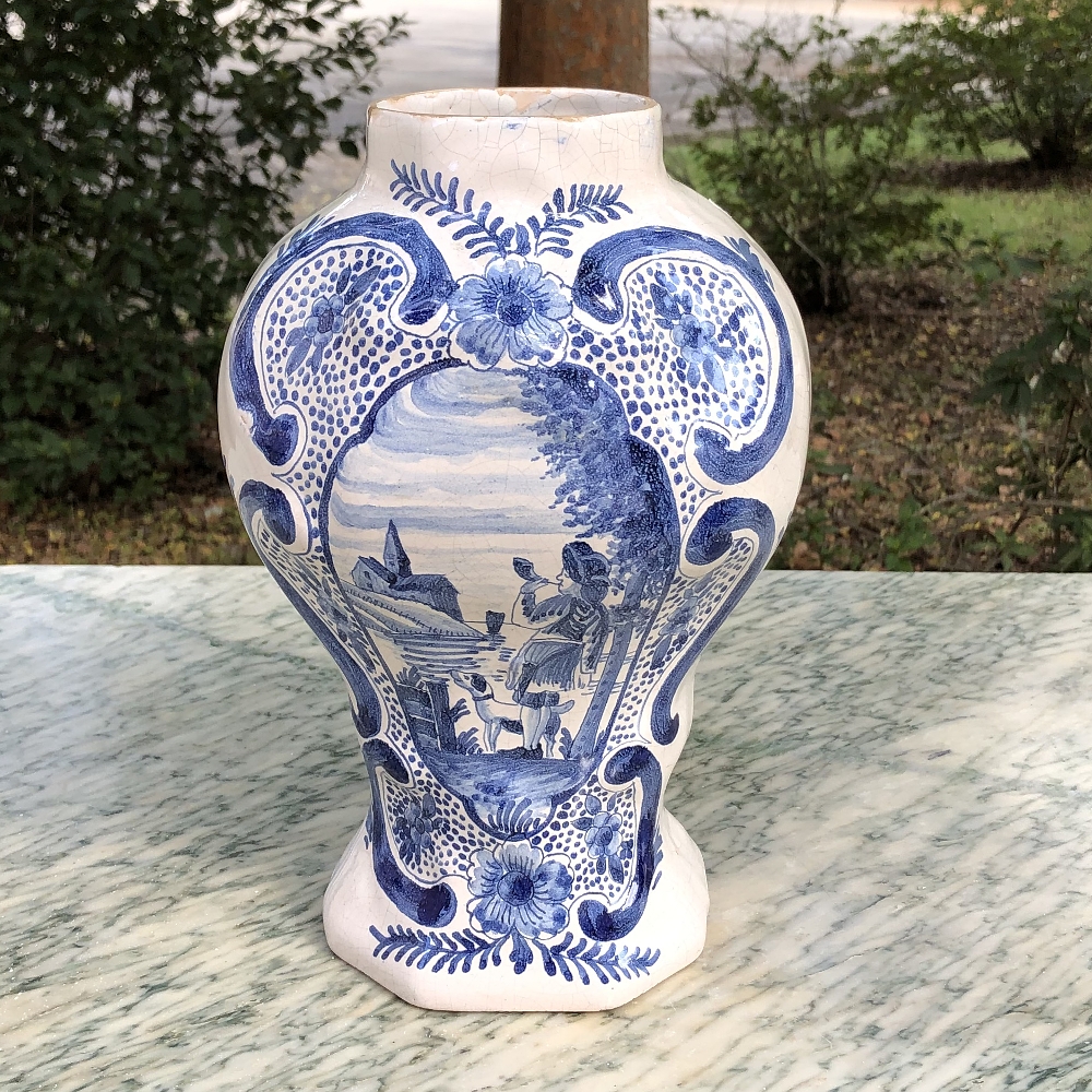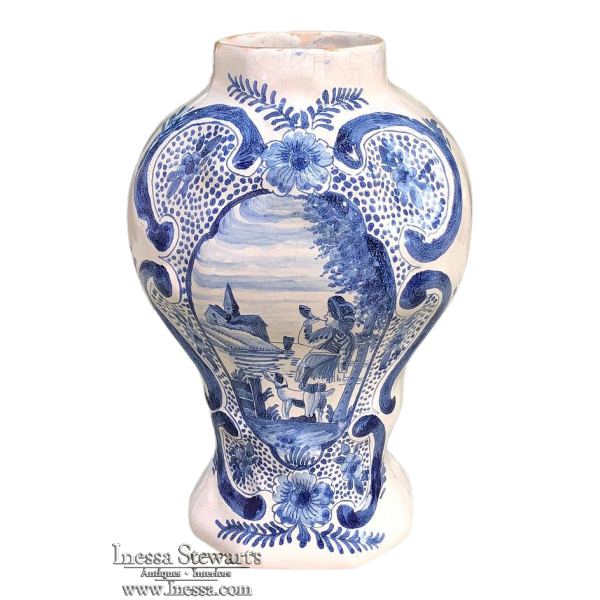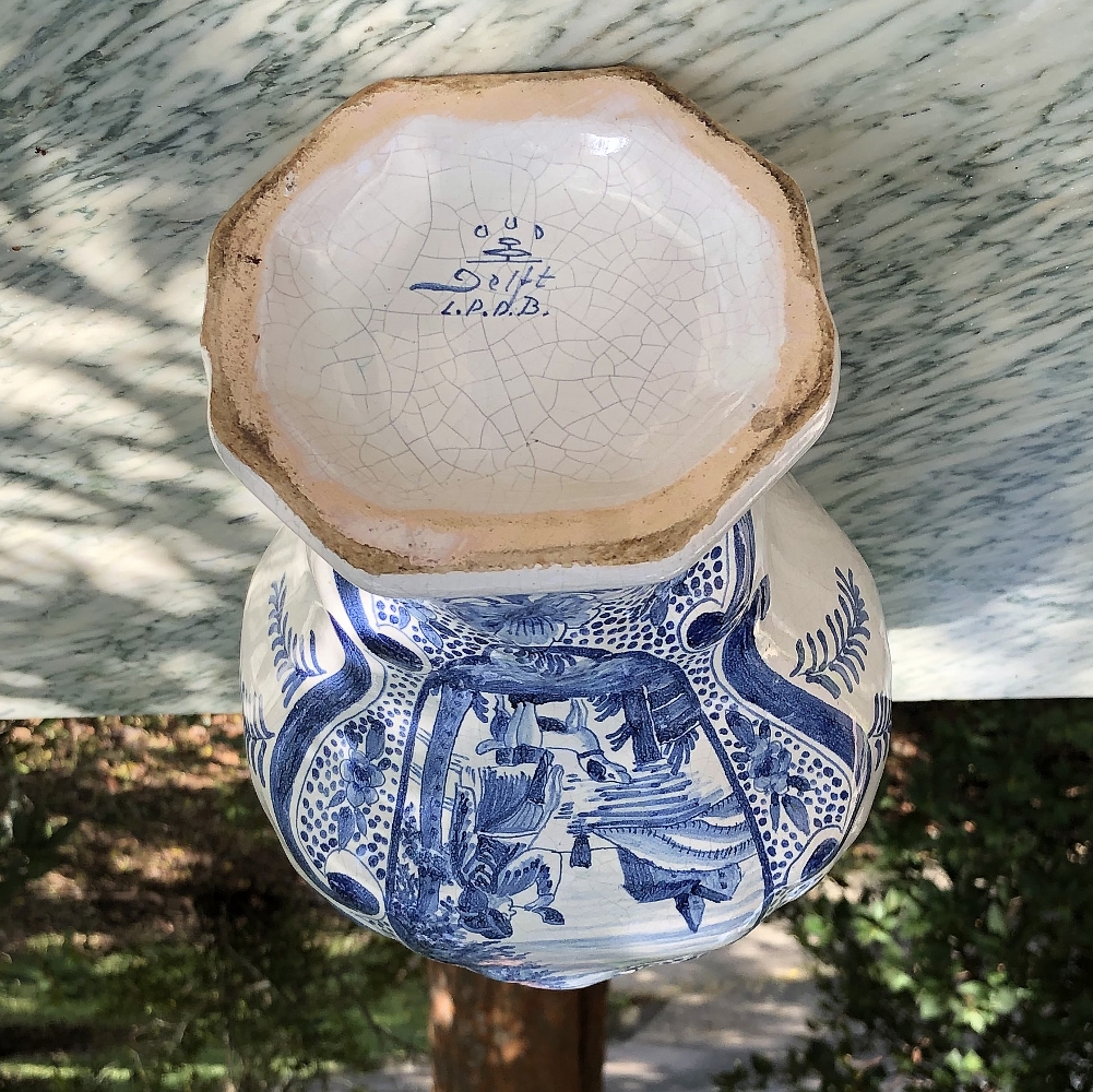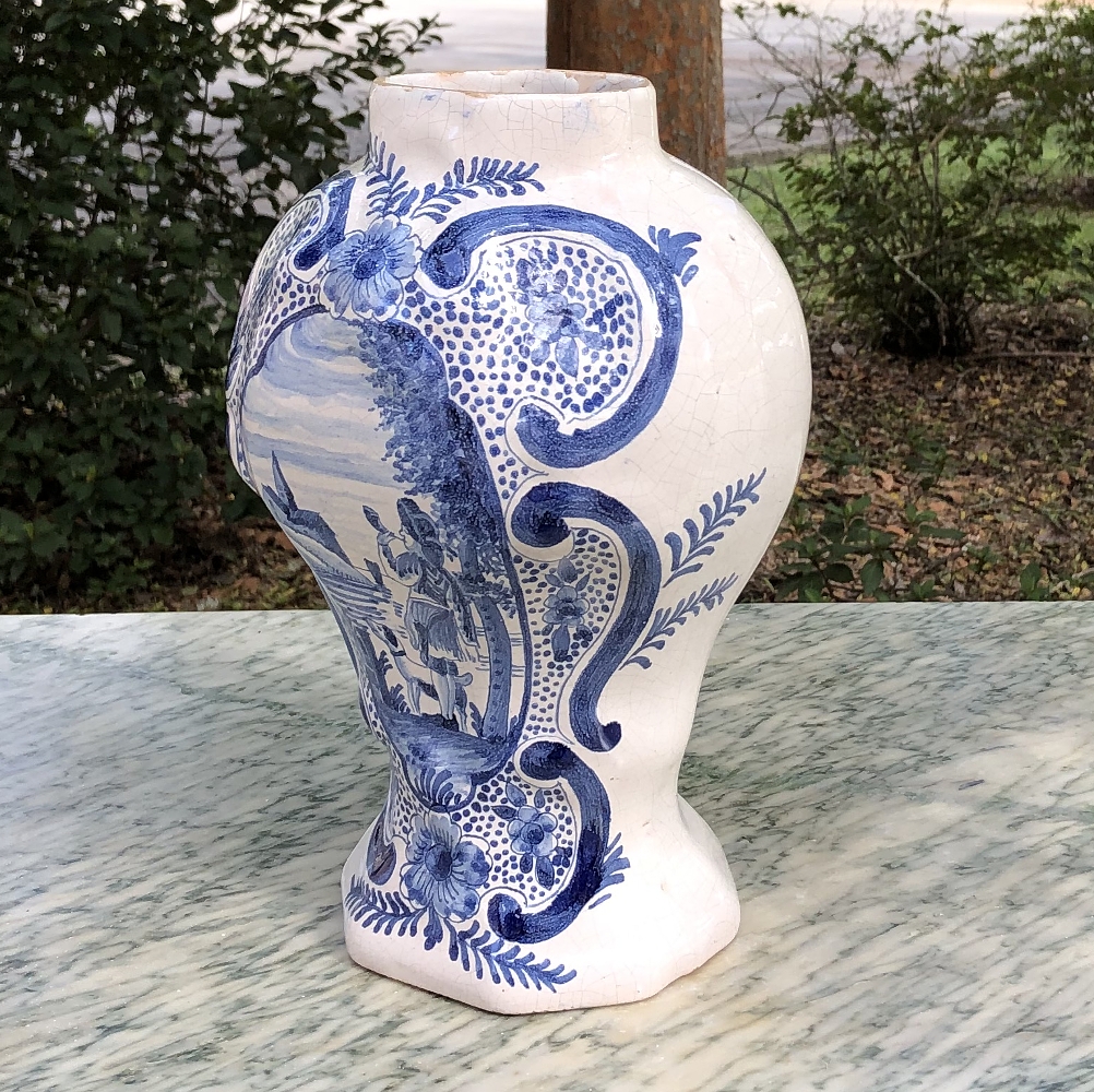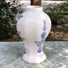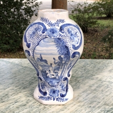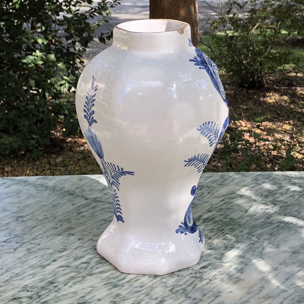 18th Century Blue & White Delft Vase features beautiful hand-painted design with the splendor of the cobalt blue expertly preserved by the proprietary process developed by the master ceramicists of the Delft region in Holland.