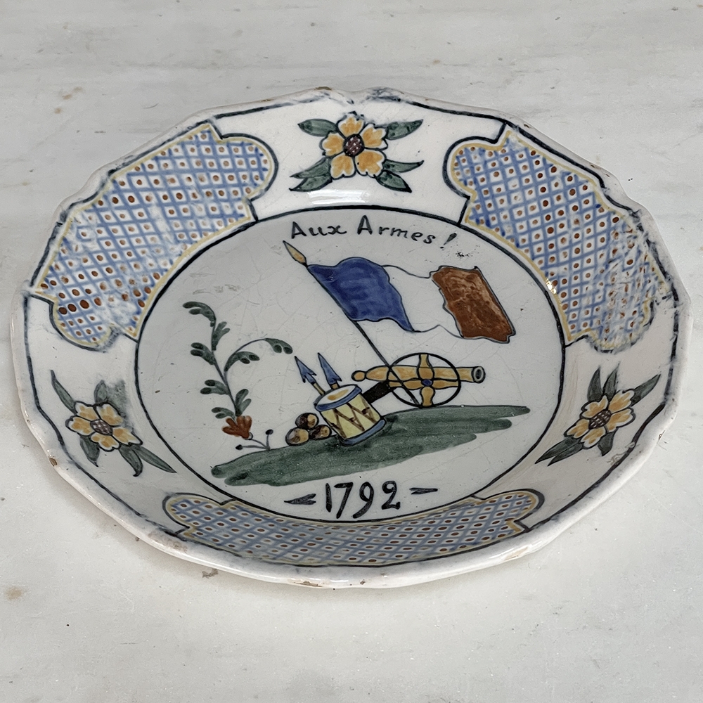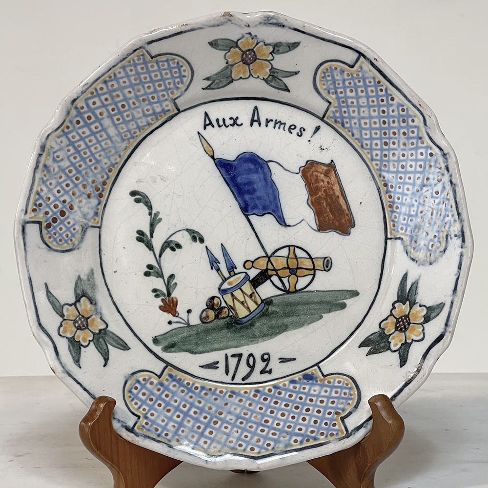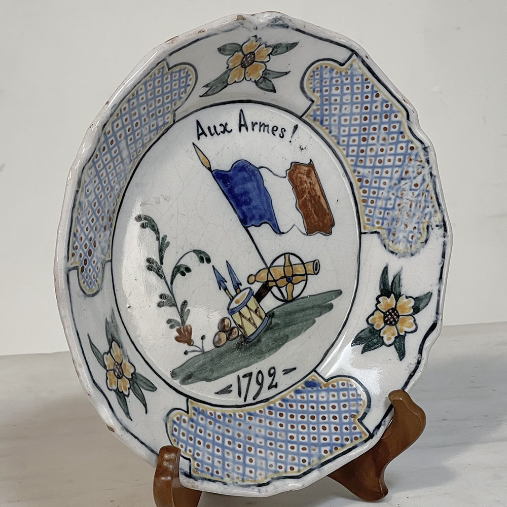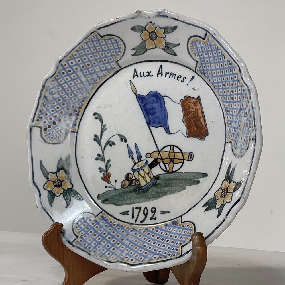 18th Century French Faience Hand-Painted Plate commemorates the Battle of Valmy when Prussian troops attempted to take Paris. A field cannon with cannon balls, spears and a parade drum accompany a boldly represented French flag, with the exhortation "To Arms!" and the date of 1792 clearly placed. The border consists of three lattice panels separated by flowers. The plate was hastily produced, hence the smearing of the original painted embellishment during the glazing and firing process, with a simple X. mark on the back. Such hastily executed souvenir plates remain in high demand due to their relative scarcity today.