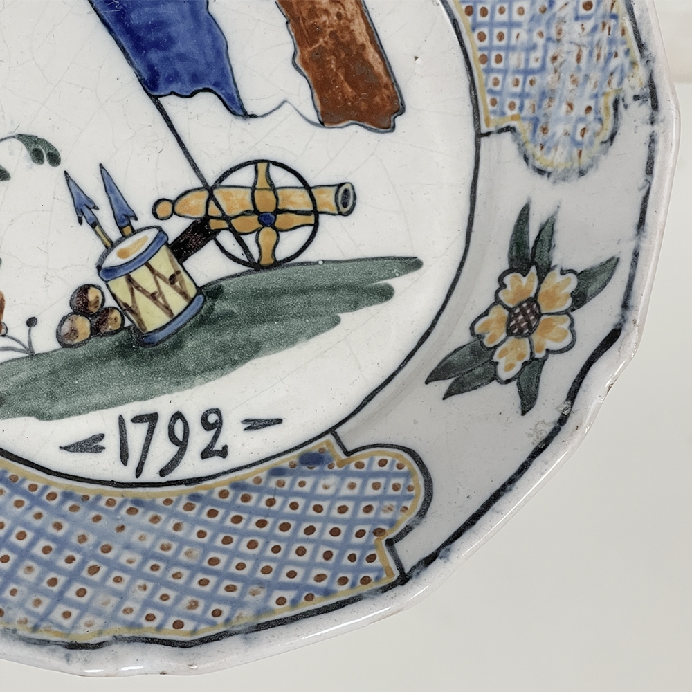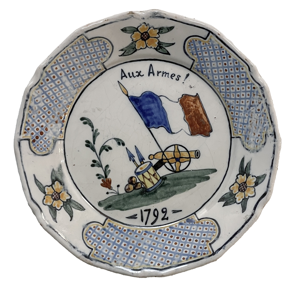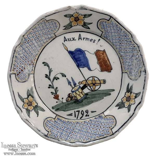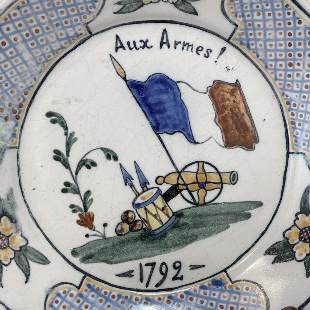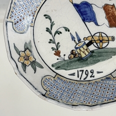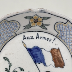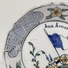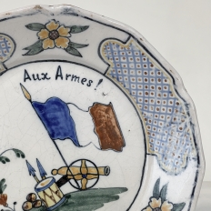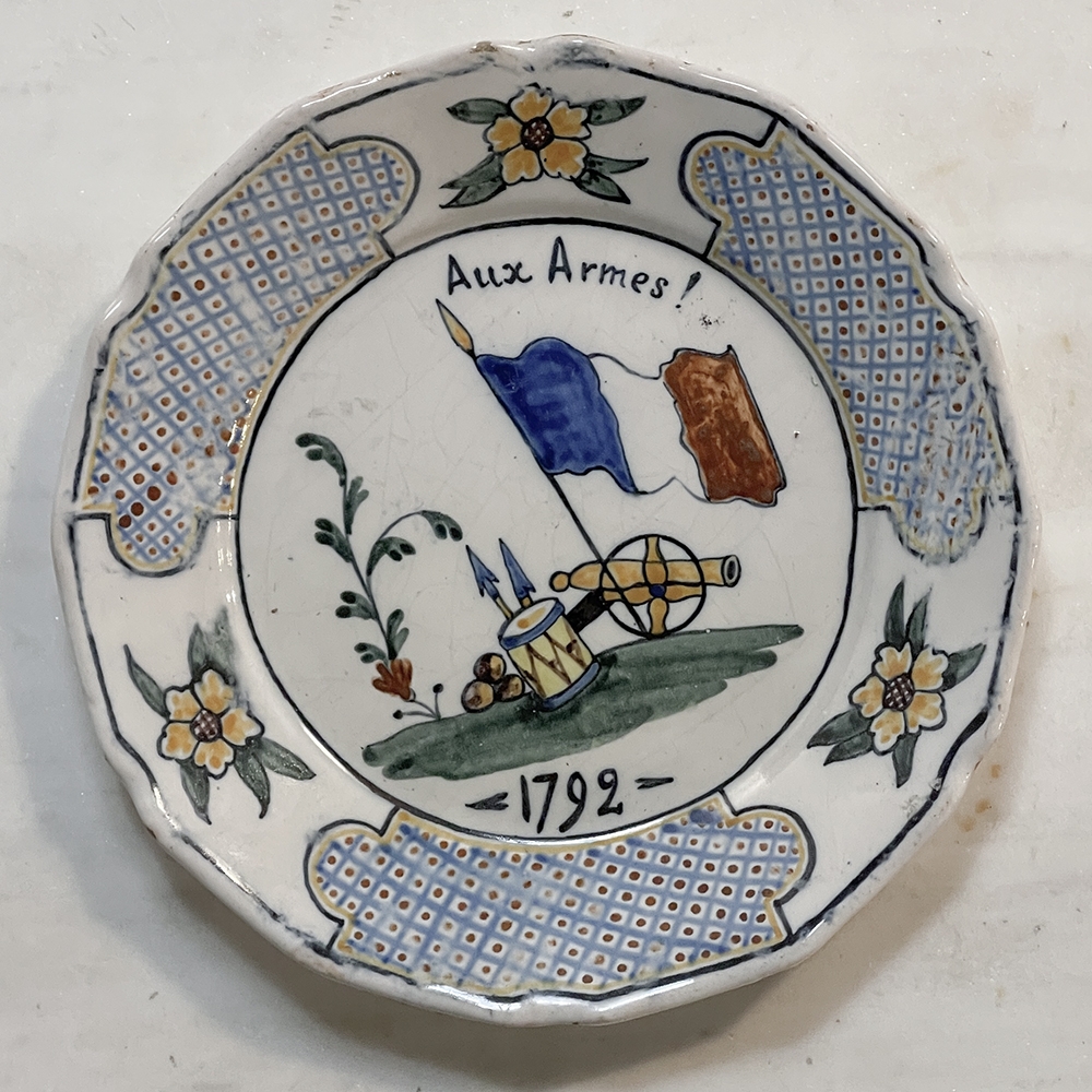 18th Century French Faience Hand-Painted Plate commemorates the Battle of Valmy when Prussian troops attempted to take Paris. A field cannon with cannon balls, spears and a parade drum accompany a boldly represented French flag, with the exhortation "To Arms!" and the date of 1792 clearly placed. The border consists of three lattice panels separated by flowers. The plate was hastily produced, hence the smearing of the original painted embellishment during the glazing and firing process, with a simple X. mark on the back. Such hastily executed souvenir plates remain in high demand due to their relative scarcity today.