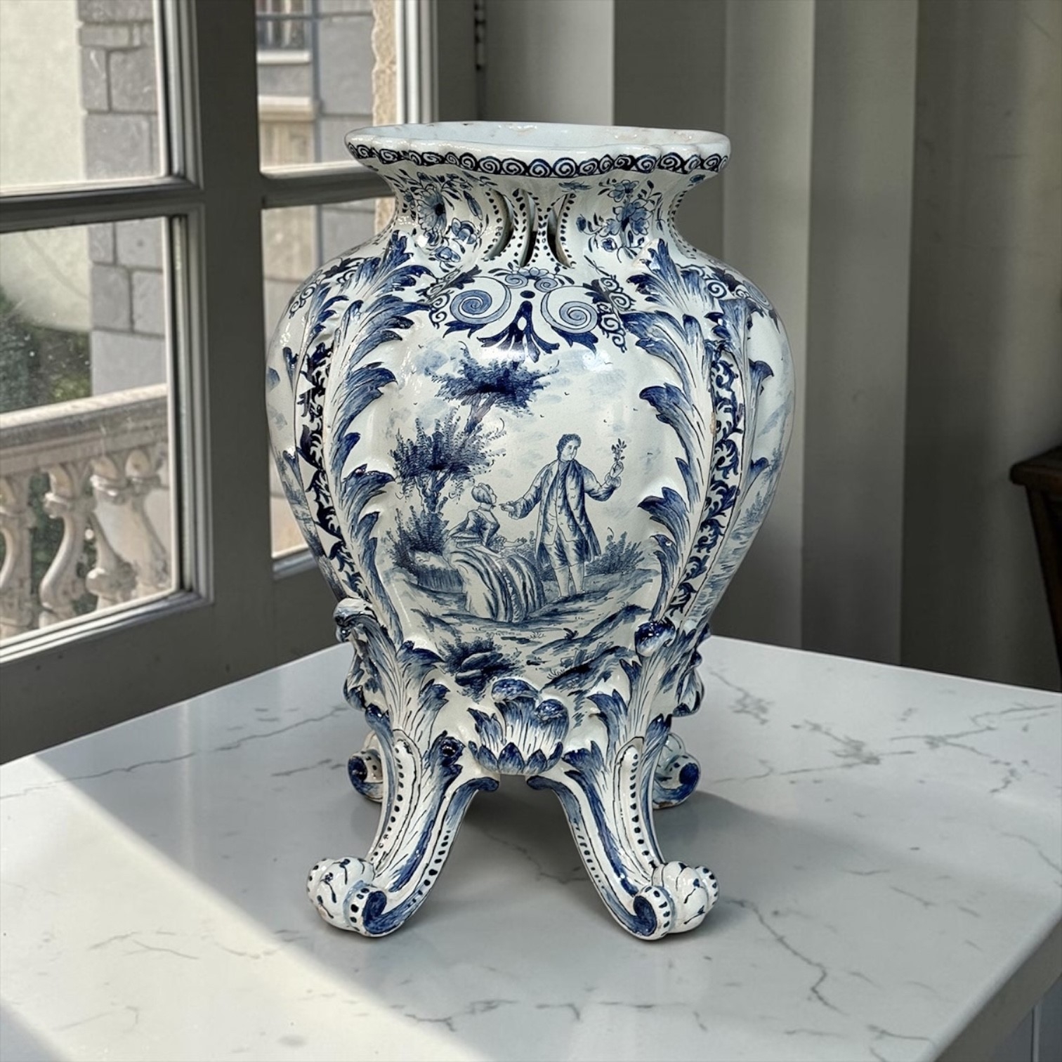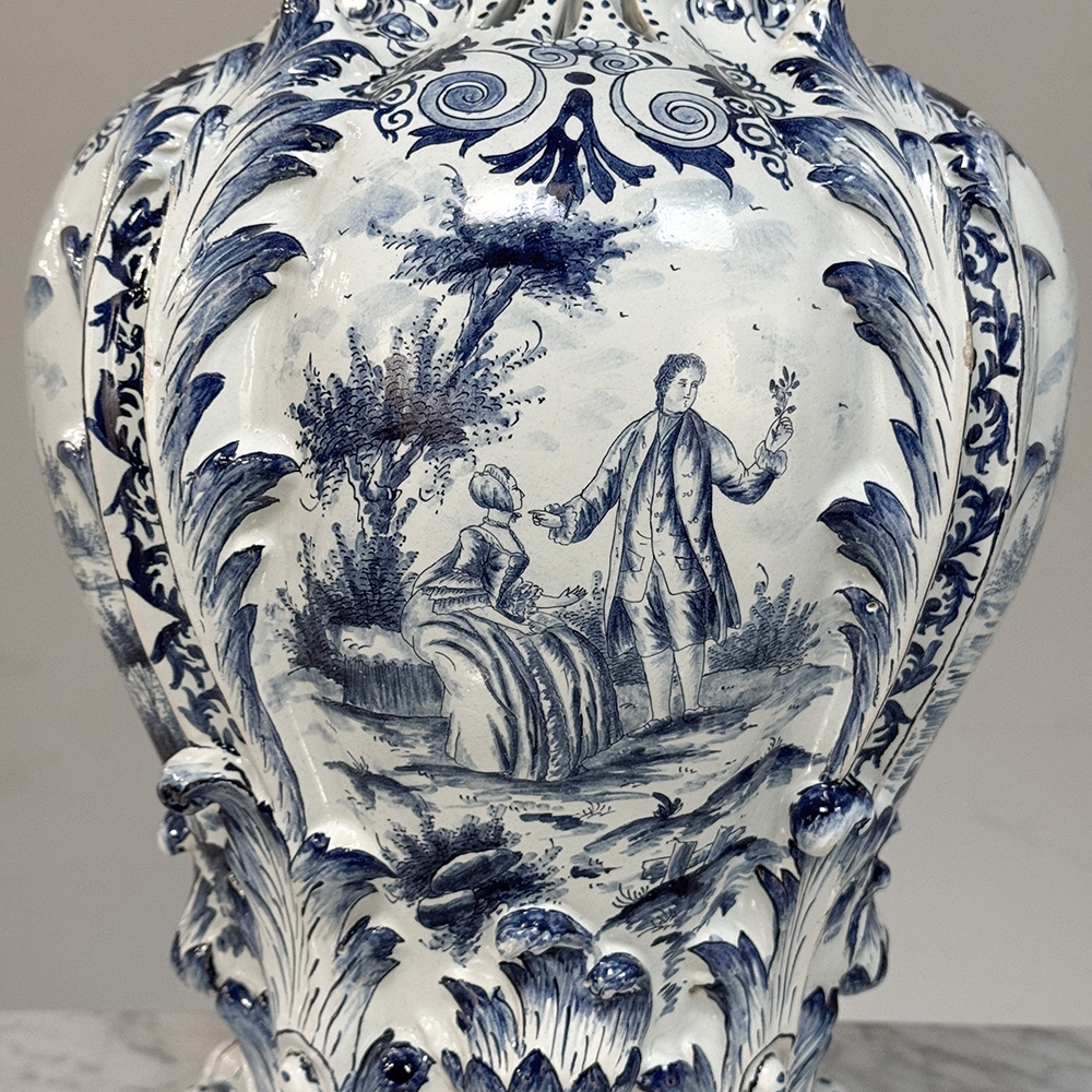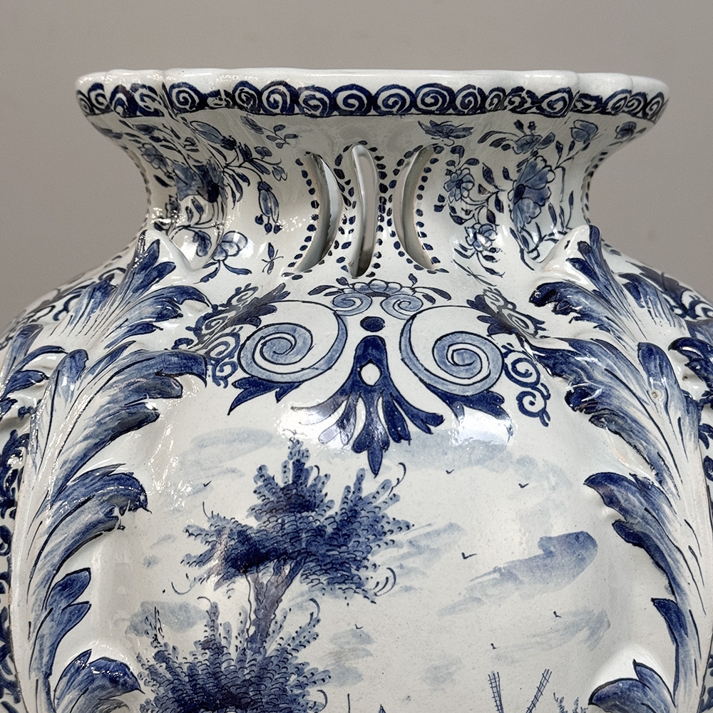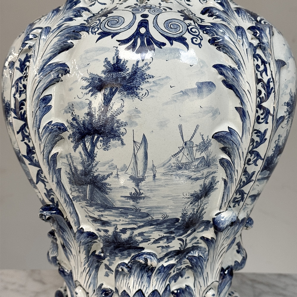 18th Century Hand-Painted Delft Jardinière, Signed LVD is a beautifully shaped vase, notable for its elegant, softly contoured form and impressive scale. The silhouette feels both refined and generous, giving the piece a natural presence whether used as a centerpiece or as a decorative accent.