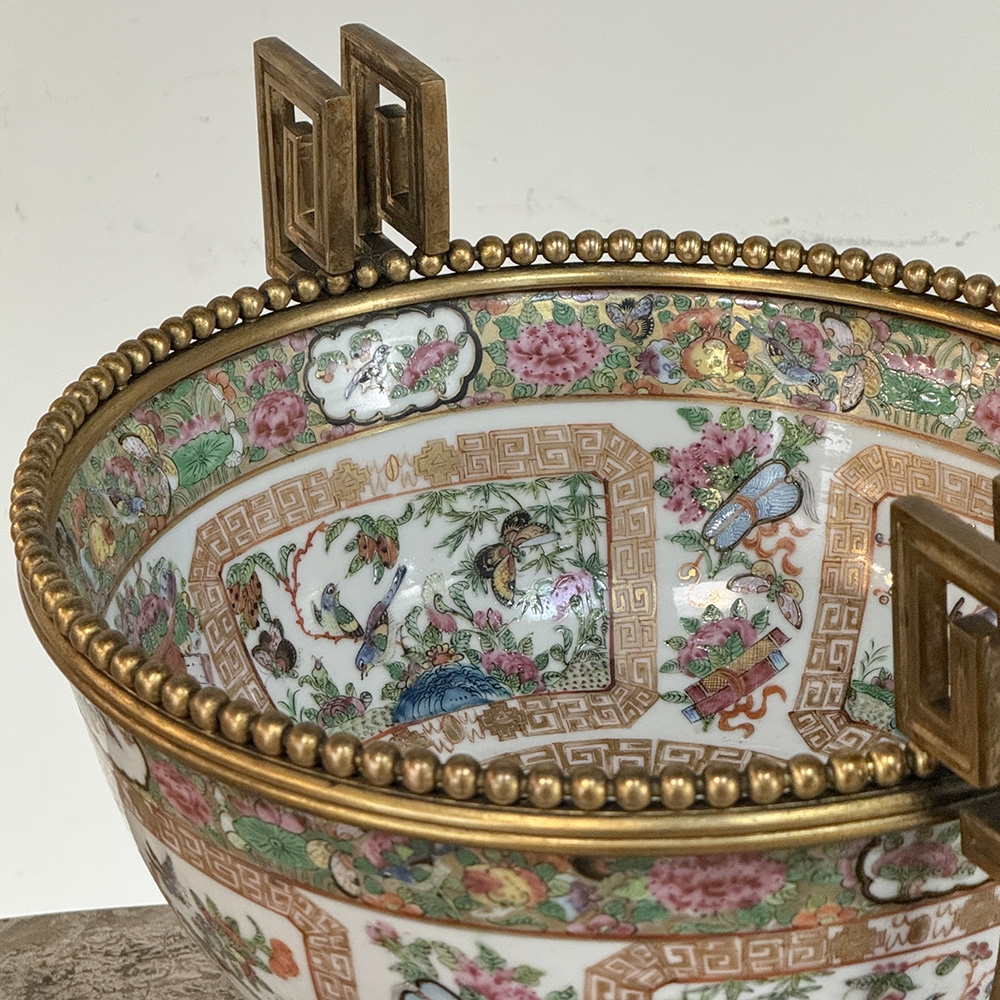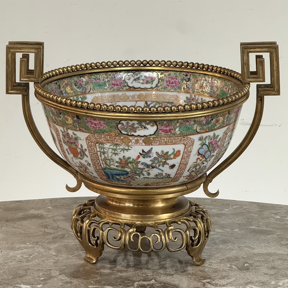 This 19th century Chinese Rose Medallion porcelain centerpiece reflects the enduring European fascination with Chinese export porcelain, elevated by the addition of finely cast French bronze mounts. The bowl is richly hand-decorated with flowering branches, birds, butterflies, and garden motifs in the vibrant Rose Medallion palette, while the beaded rim, Greek key handles, and pierced base lend the piece added structure and elegance.